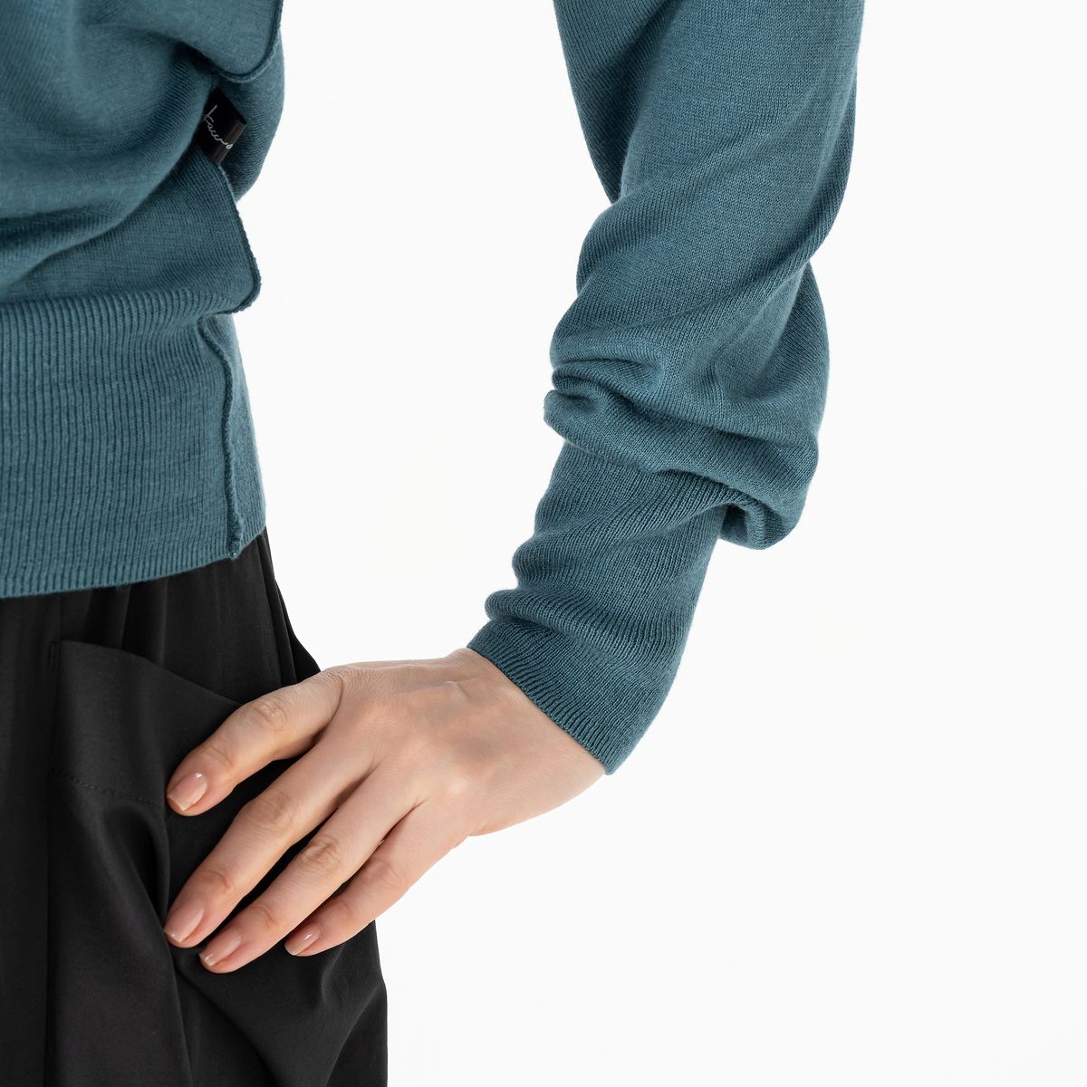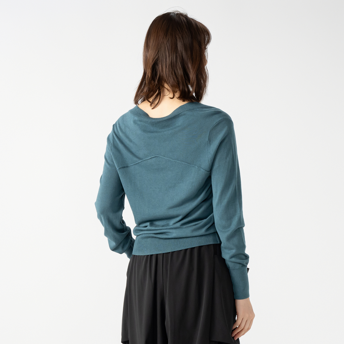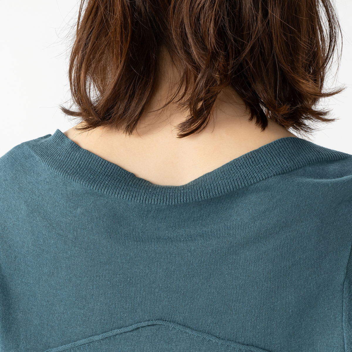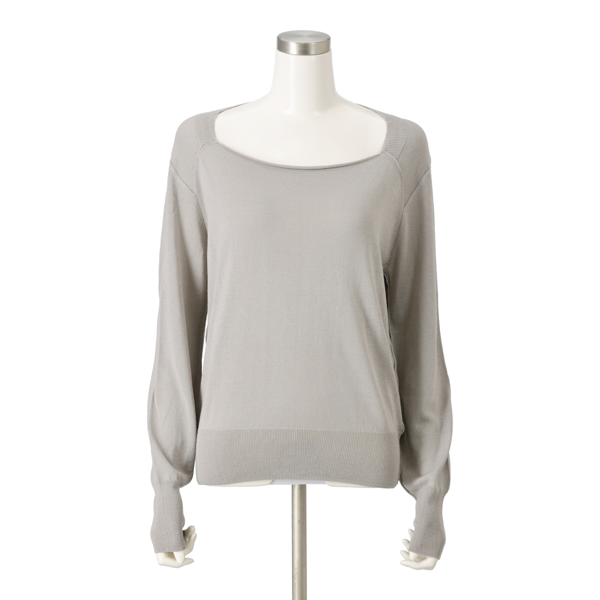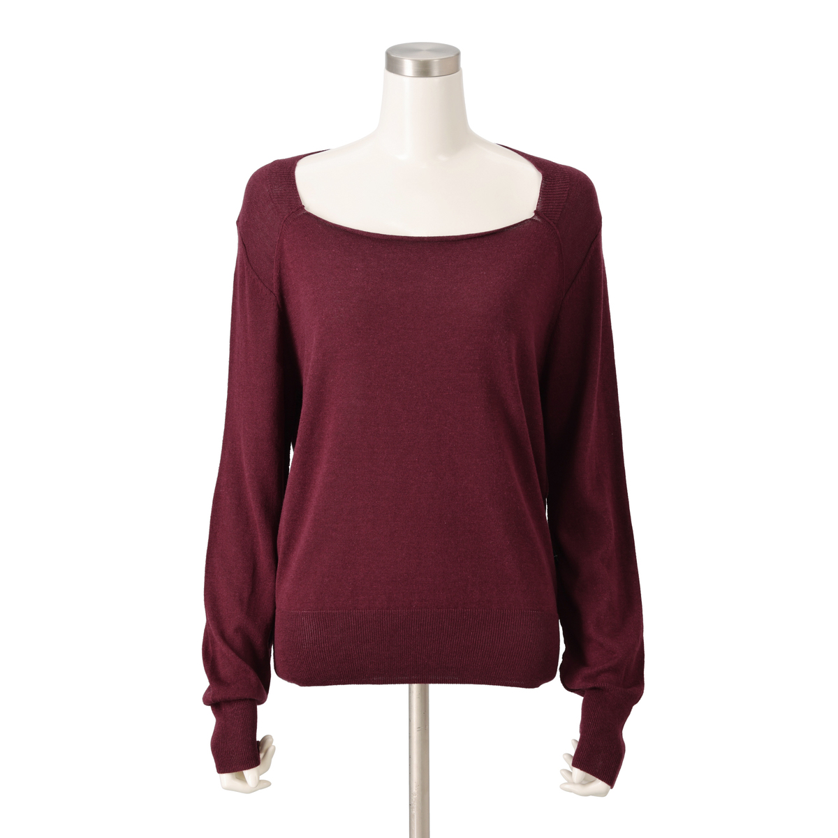 アシンメトリーなネックラインが特徴のニットプルオーバー。シンプルながらも個性が光るデザインです