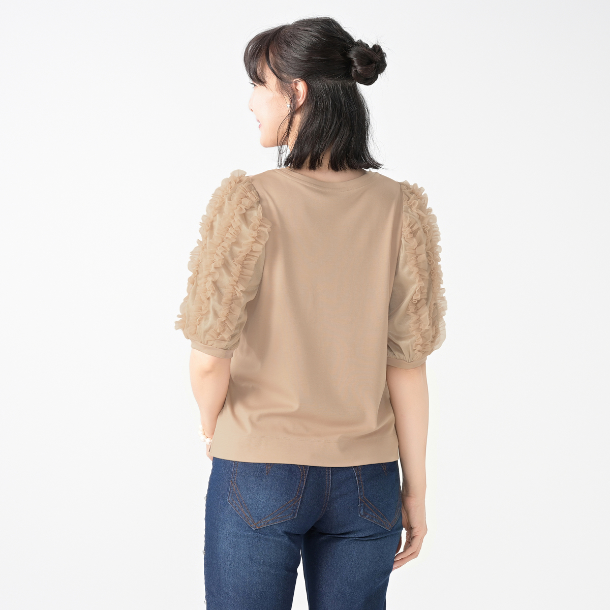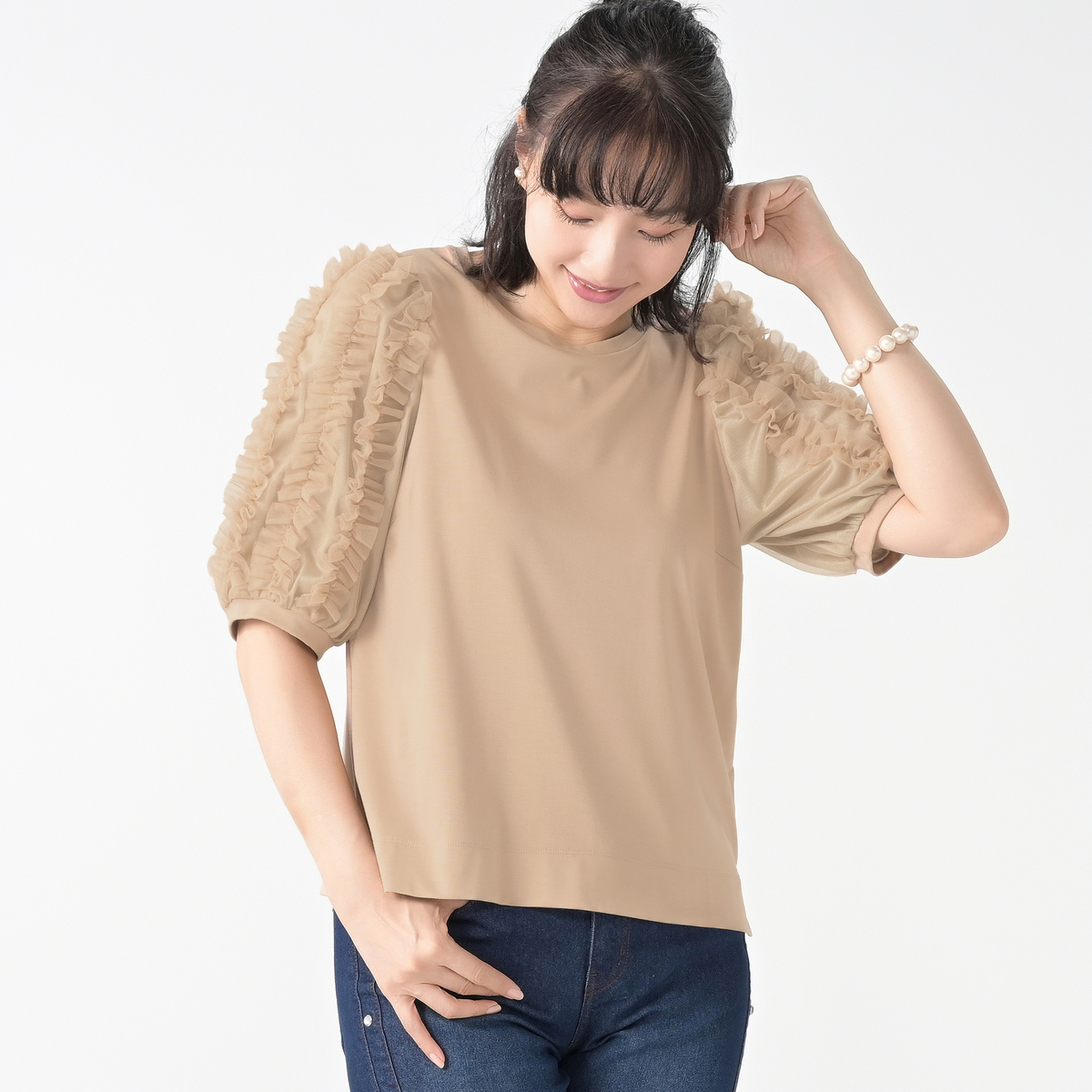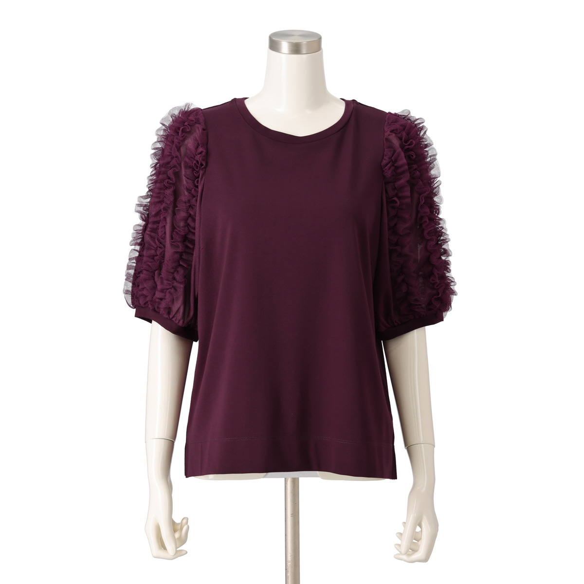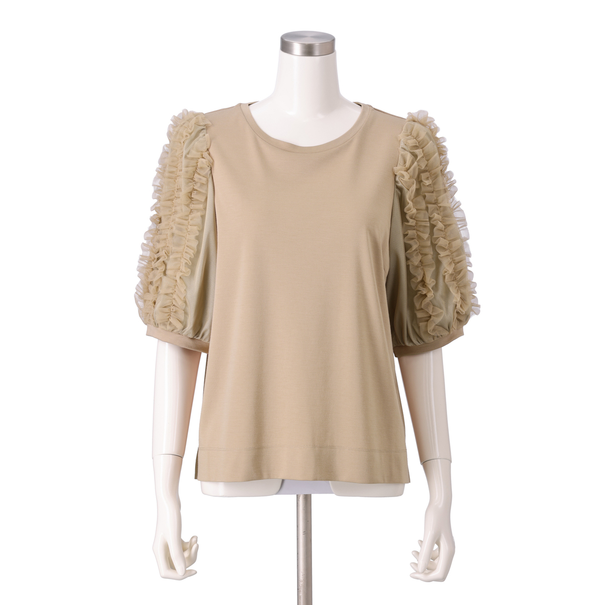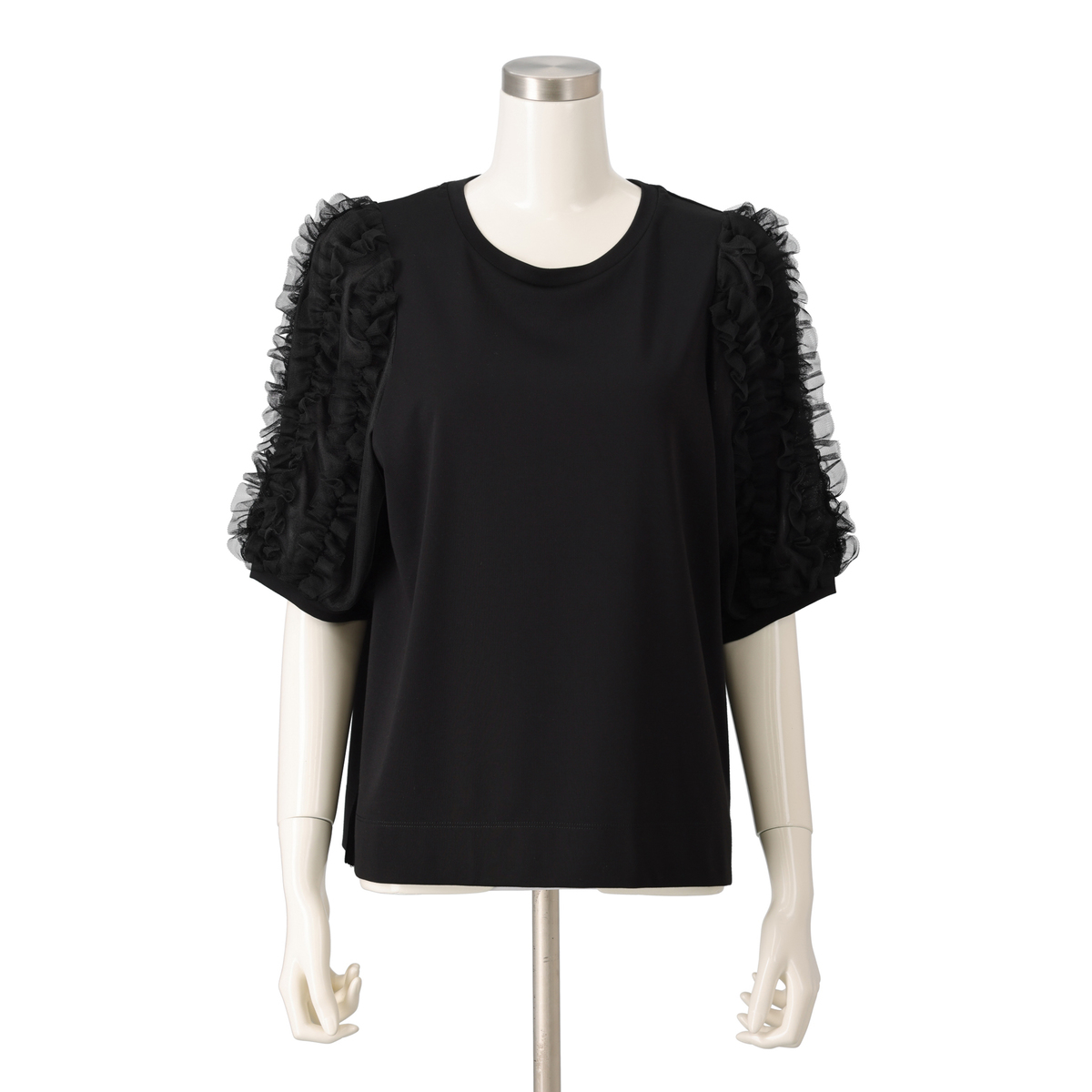 チュール素材の上にミニチュールフリルを配した袖が印象的なプルオーバー。ミニフリルを縦に配すことで膨らみ過ぎず、すっきりと見せます。裾に向かって自然に落ちるボックスシルエットは、ボディラインを拾いにくく、セットインスリーブ仕様で肩周りや腕を華奢に見せてくれます