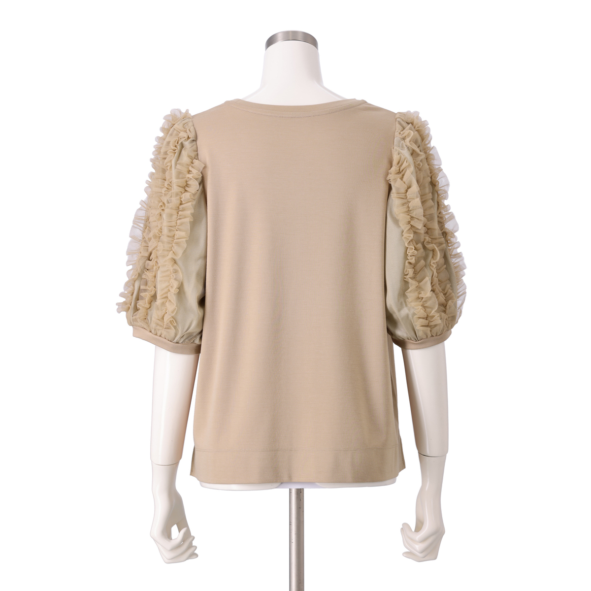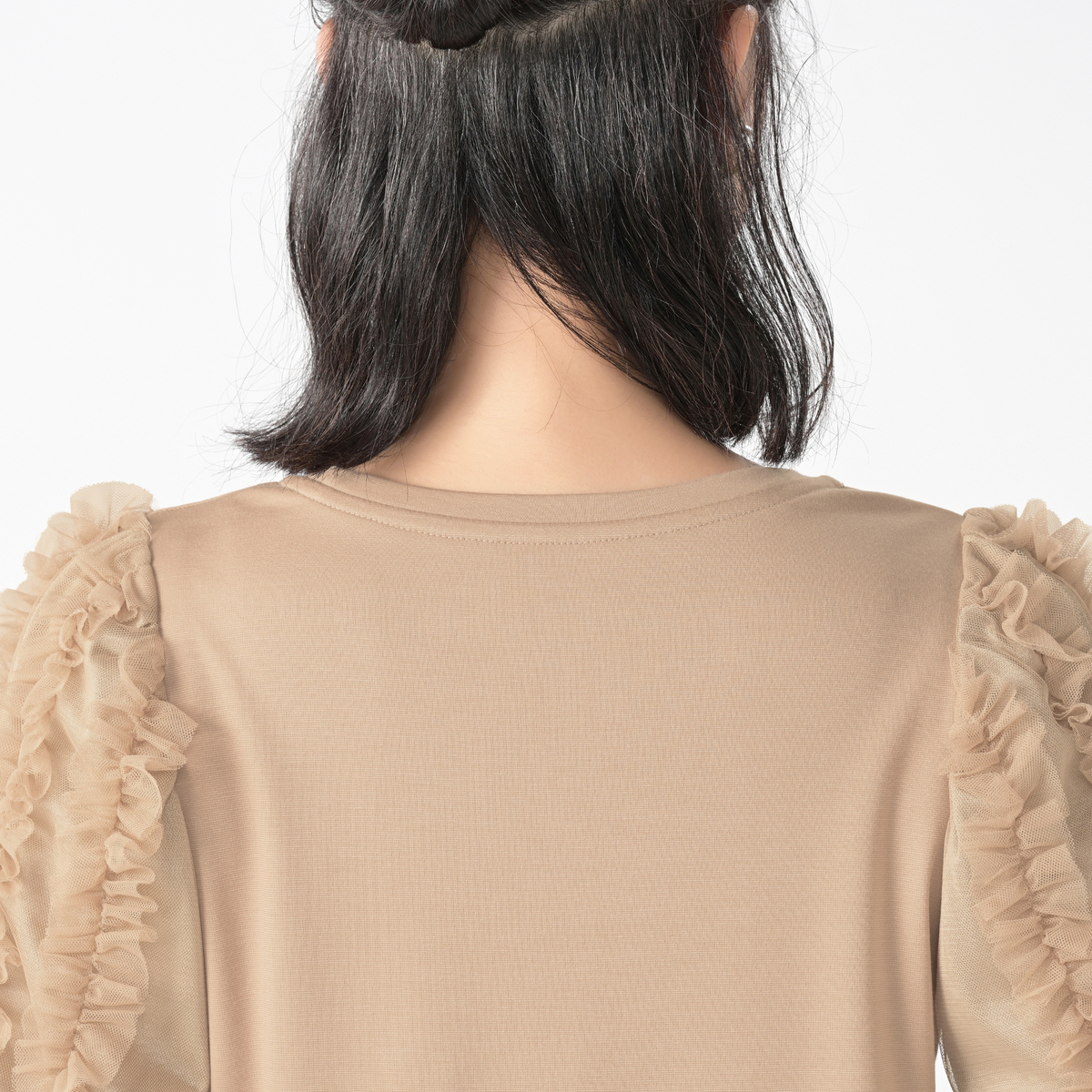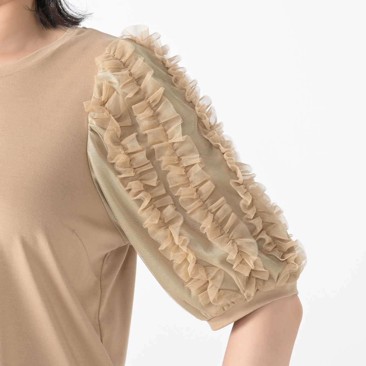 前後身頃には、つるりと滑らかな手触りの素材を使用したカットソー素材を採用。ストレッチ性があり、優しい肌触りで適度な厚みがあり、肉感を拾いにくいのも特徴です。袖は織り目が詰まったチュール素材で仕立てており、適度な艶感と共にきれいに見せます