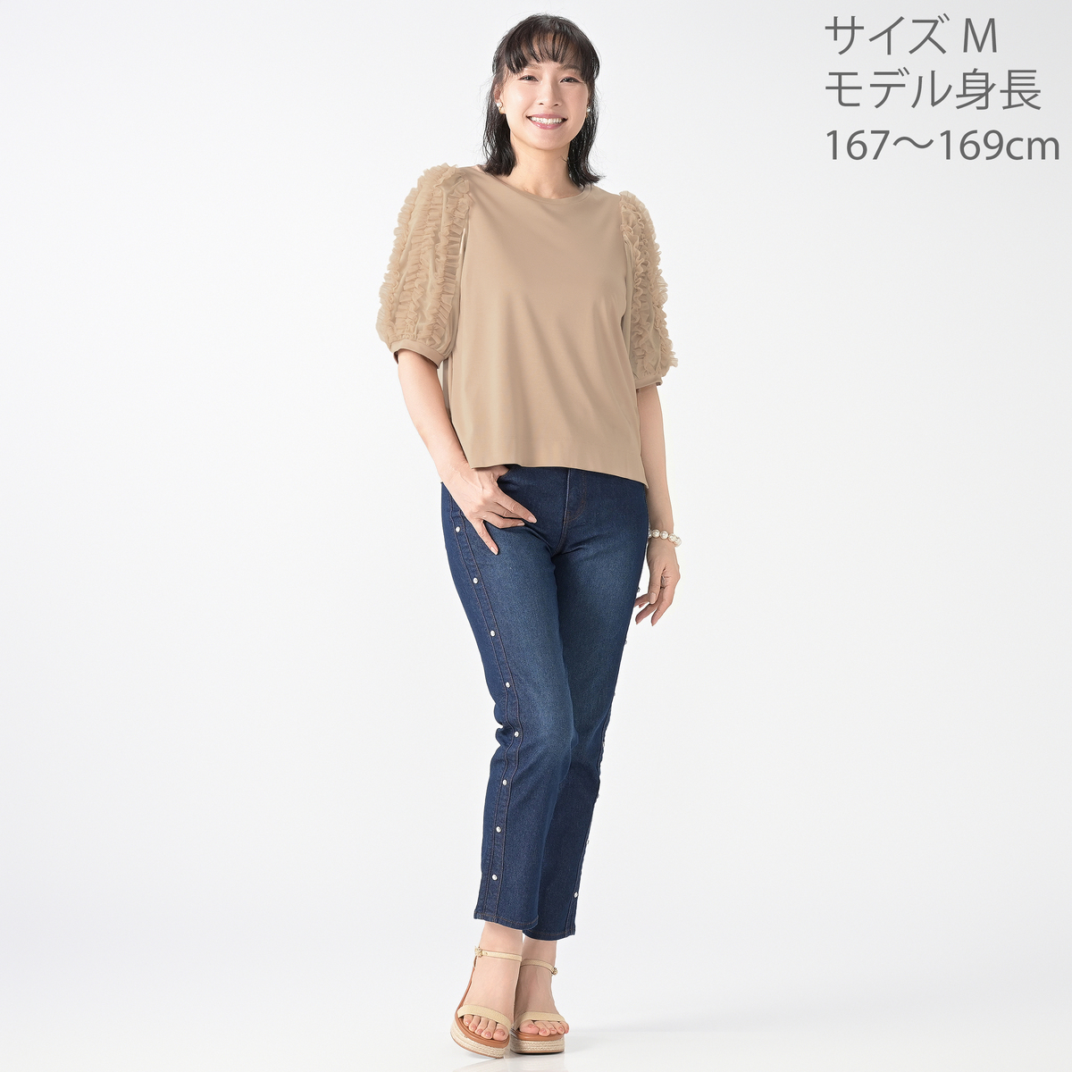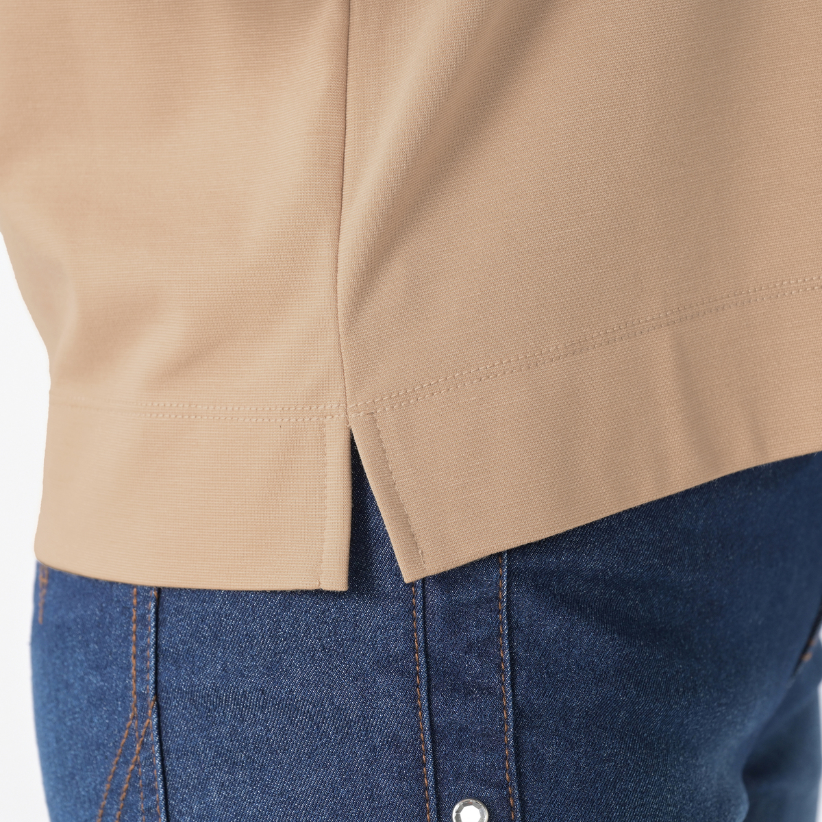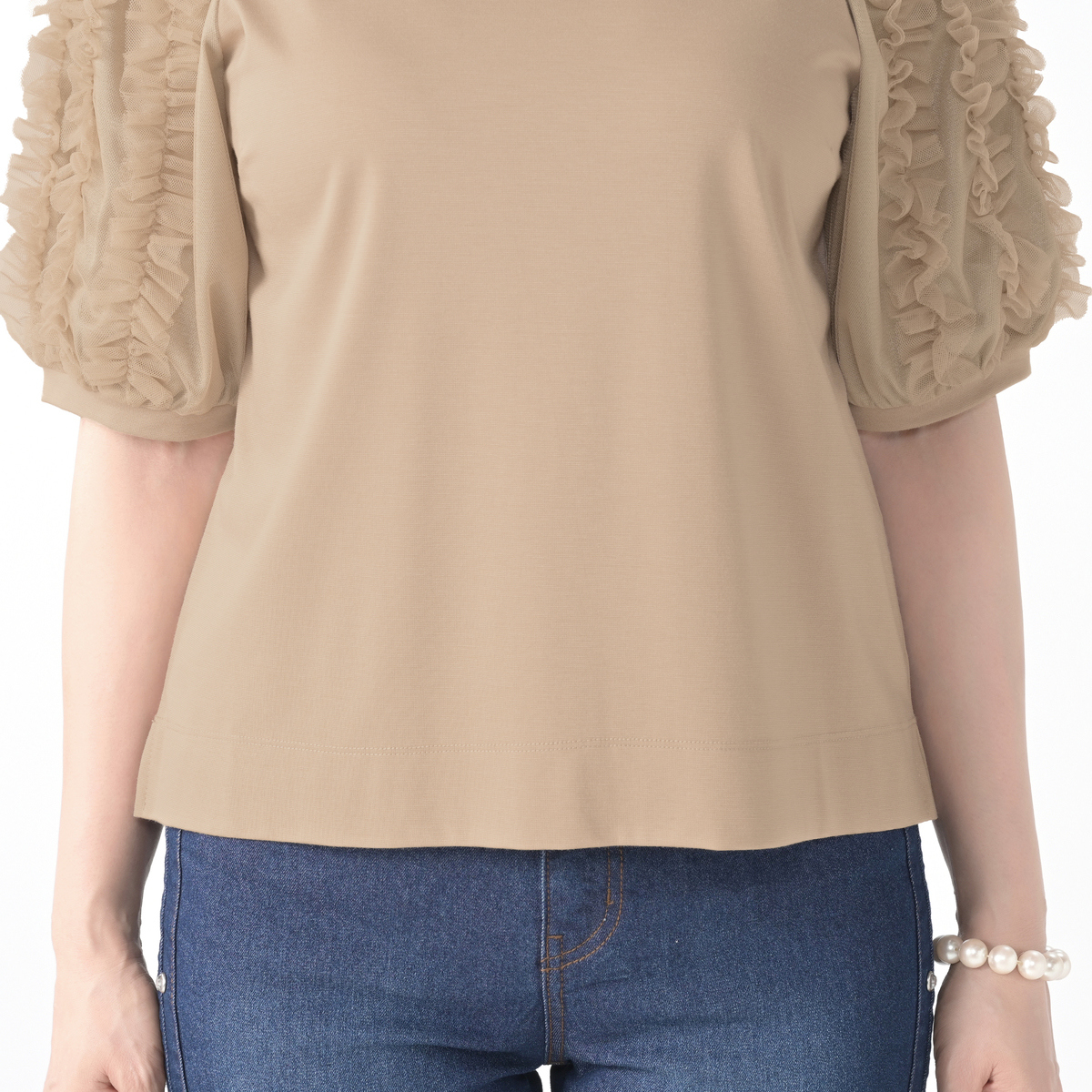 前後身頃には、つるりと滑らかな手触りの素材を使用したカットソー素材を採用。ストレッチ性があり、優しい肌触りで適度な厚みがあり、肉感を拾いにくいのも特徴です。袖は織り目が詰まったチュール素材で仕立てており、適度な艶感と共にきれいに見せます