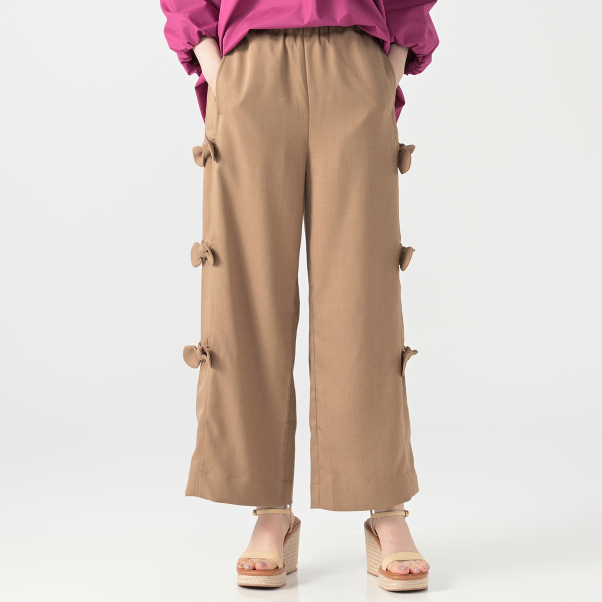 サイドにあしらったリボンが目を引くパンツです。ウエストは総ゴム仕様で着脱が簡単。麻調に織り上げた合繊素材を使用しており、さらりとした肌触りが特長です