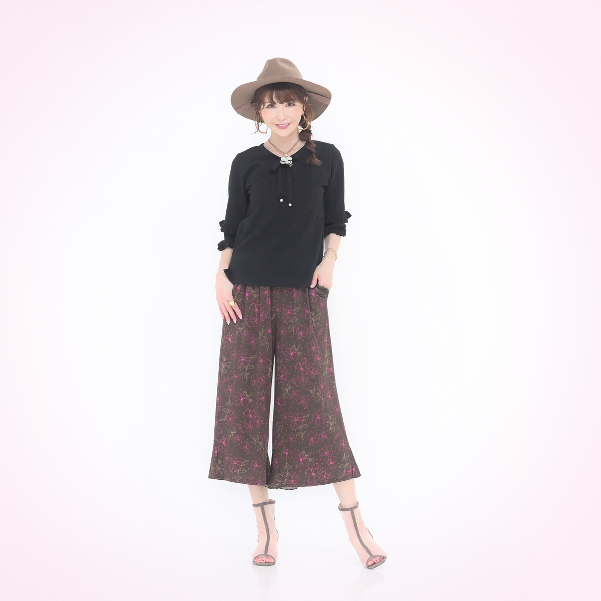 ピンクは着こなす自信がなかったので黒を購入しました。袖と身頃の編み方が違ってたりして身体に沿っていいラインを出しています。丈が短いのもロングスカートとかにも合わせやすくて◎。無地だけど袖のフリルや首元のリボン&パールがとても可愛いです。