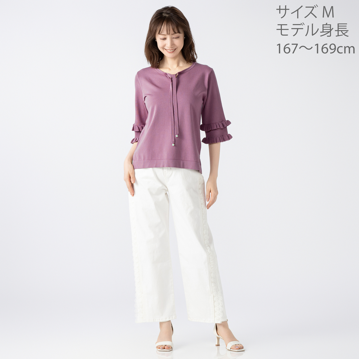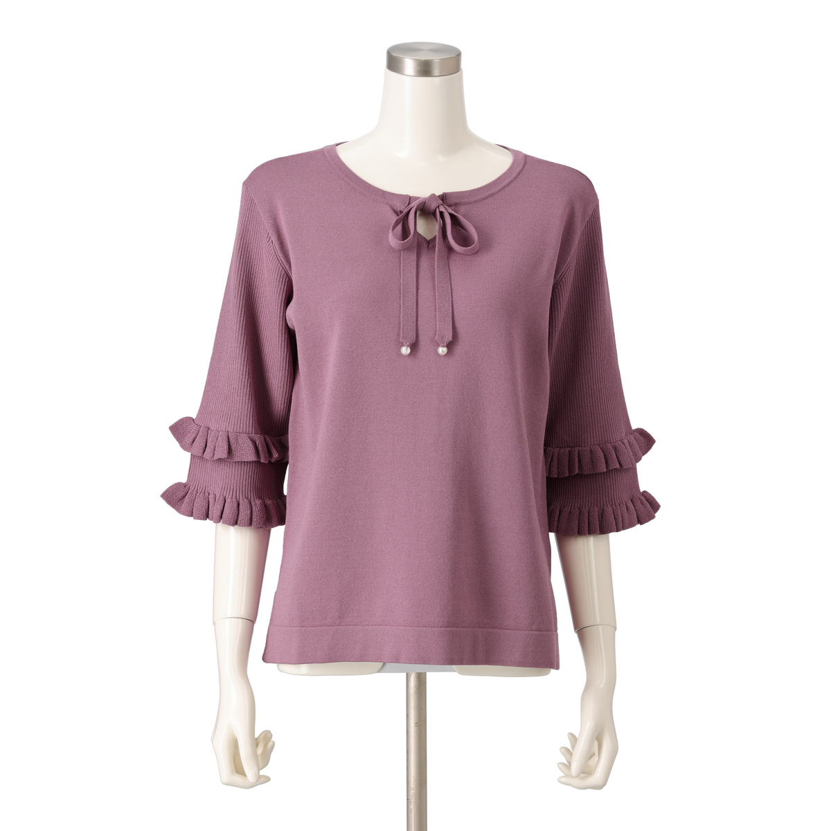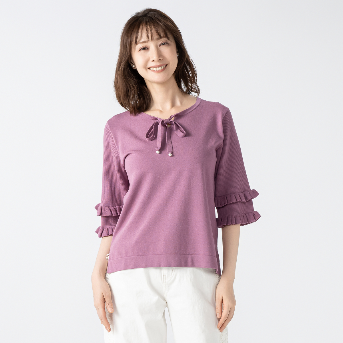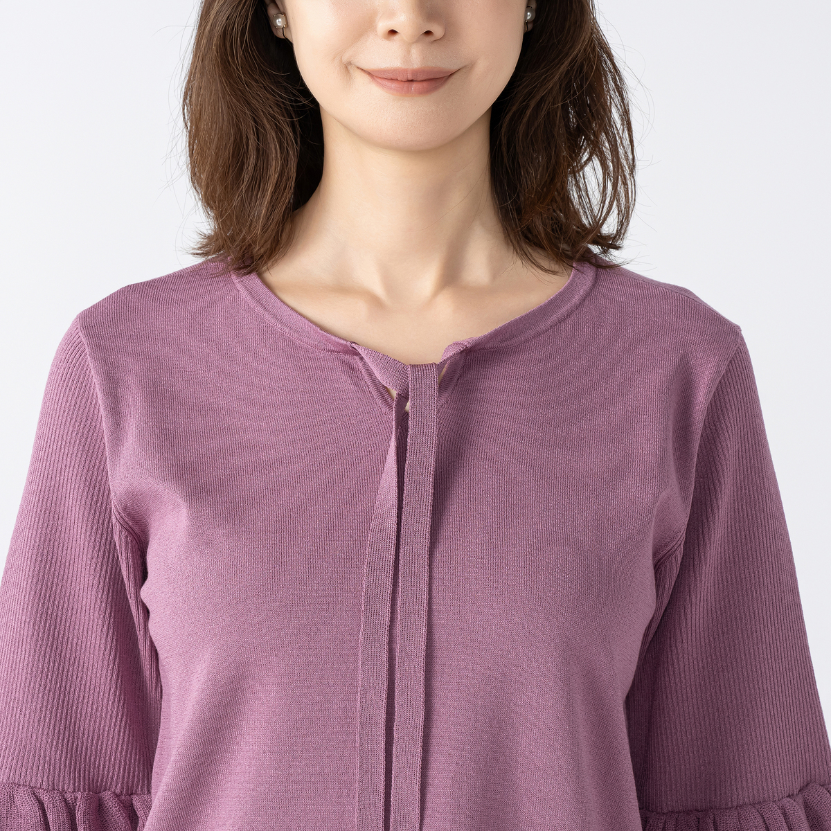 大人可愛い雰囲気が漂うニットトップスです。衿紐先のパール調ビジューが動くたびにさりげなく揺れるデザイン。袖のフリルデザインが華やかさをプラスします