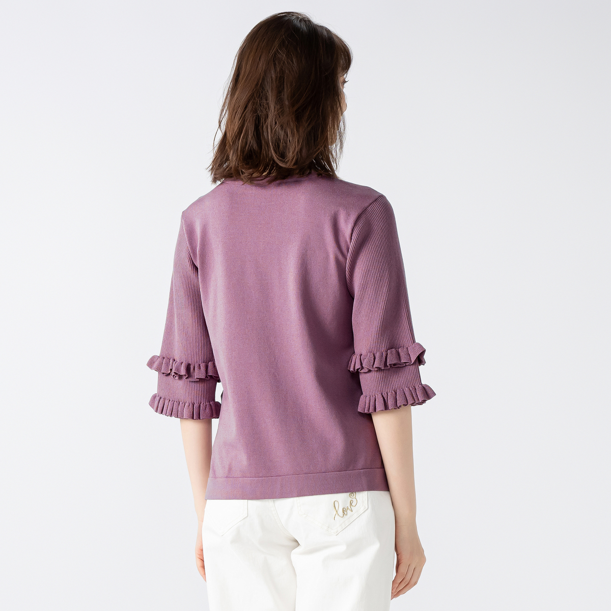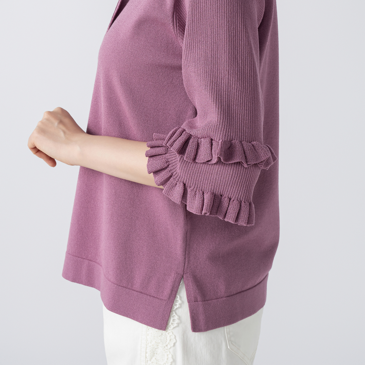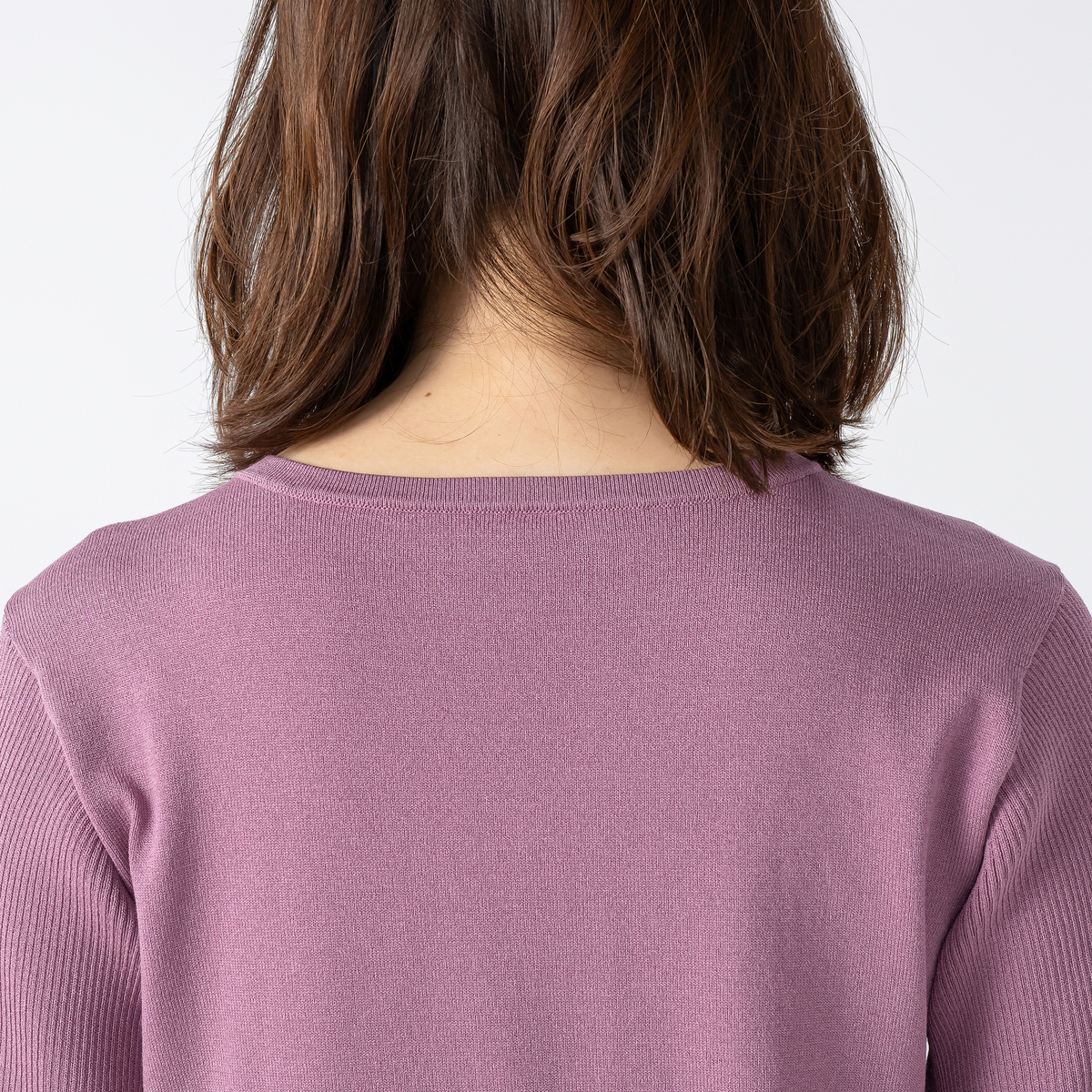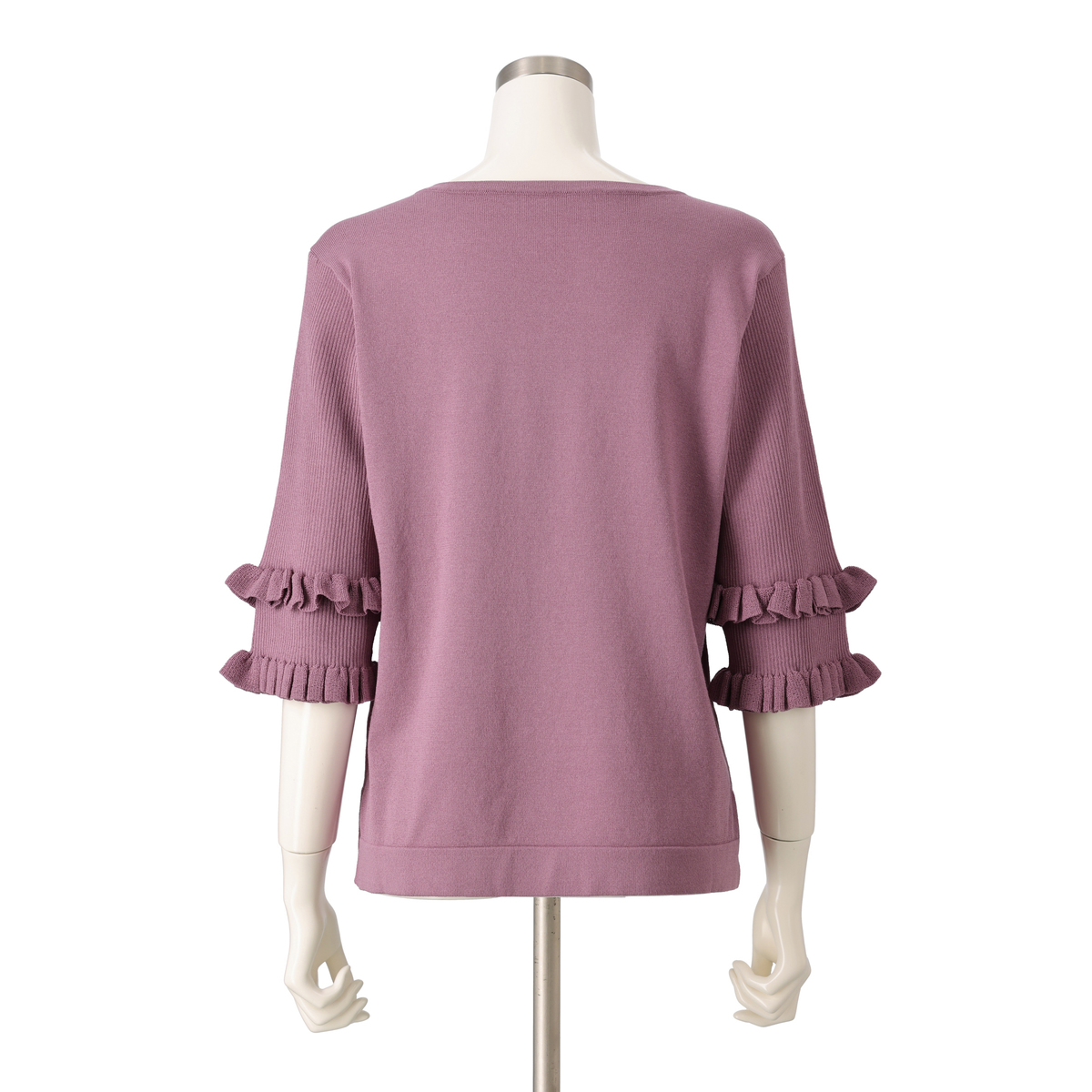 アッシュプラムを頂きました。大人可愛い落ち着いた秋色ピンクで大変気に入りました。サイズ表を確認するといつもより小さめの作りかなと思いワンサイズ上げて注文しました。収縮性はしっかりありますが、ニット生地は身体のラインを拾いやすいので結果正解でした。袖のフリルデザインがとても可愛いです。お出掛けの際に早く着たいです。