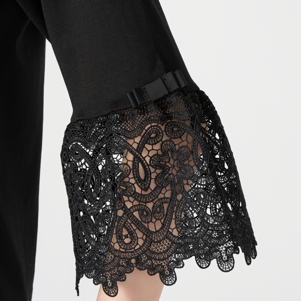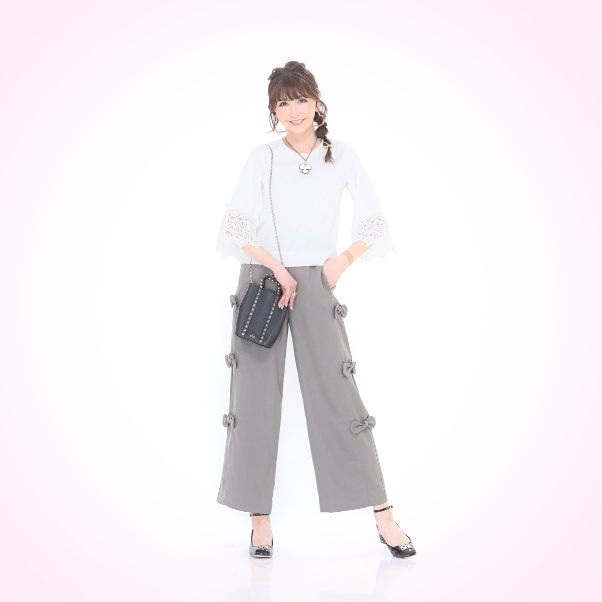 シンプルなボディの袖口に、華やかなフレアレースを施したトップス。袖とレース付けの袖山にグログランリボンをあしらったデザインで、少し深めのUラインがデコルテをきれいに見せてくれます。裾の両脇にはスリットを入れて、すっきりさせました