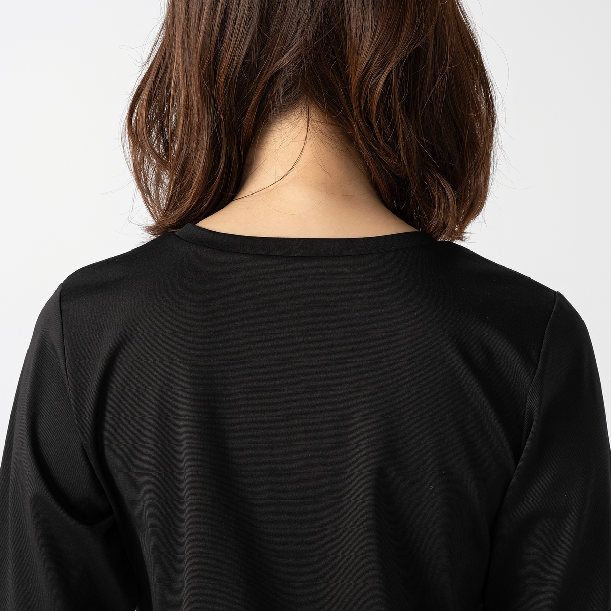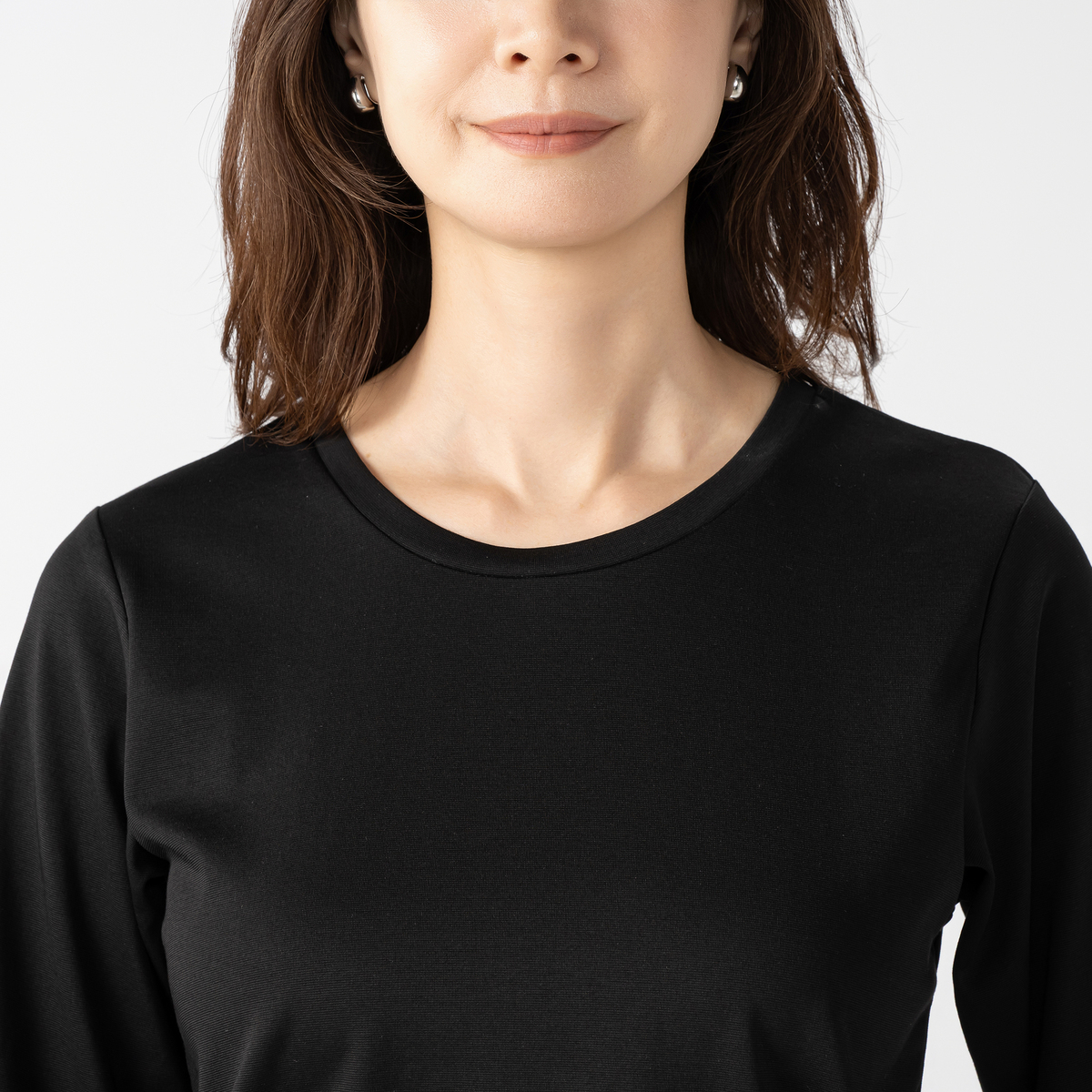 適度な伸縮性があり、形崩れしにくい薄手のポンチ素材を使用し、伸縮性を活かしたフィット&フレアのシルエットに。表面が滑らかできめ細かく、高級感のある素材で、さらりと優しい肌当たりです