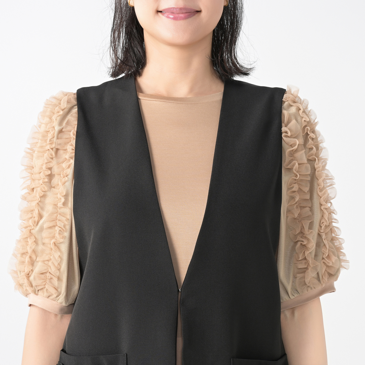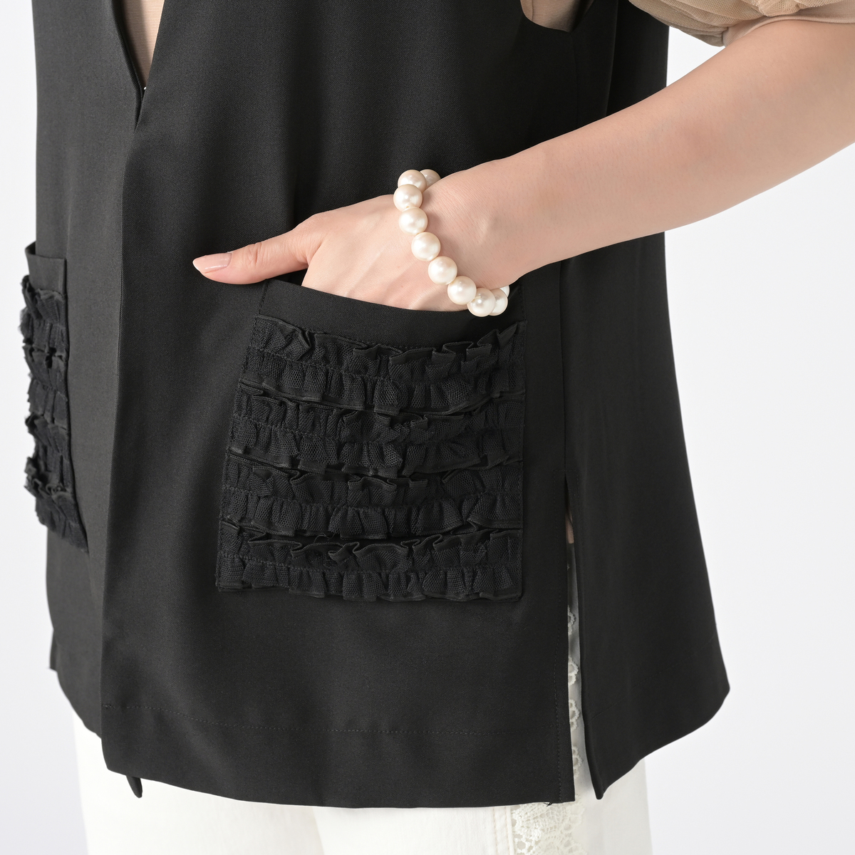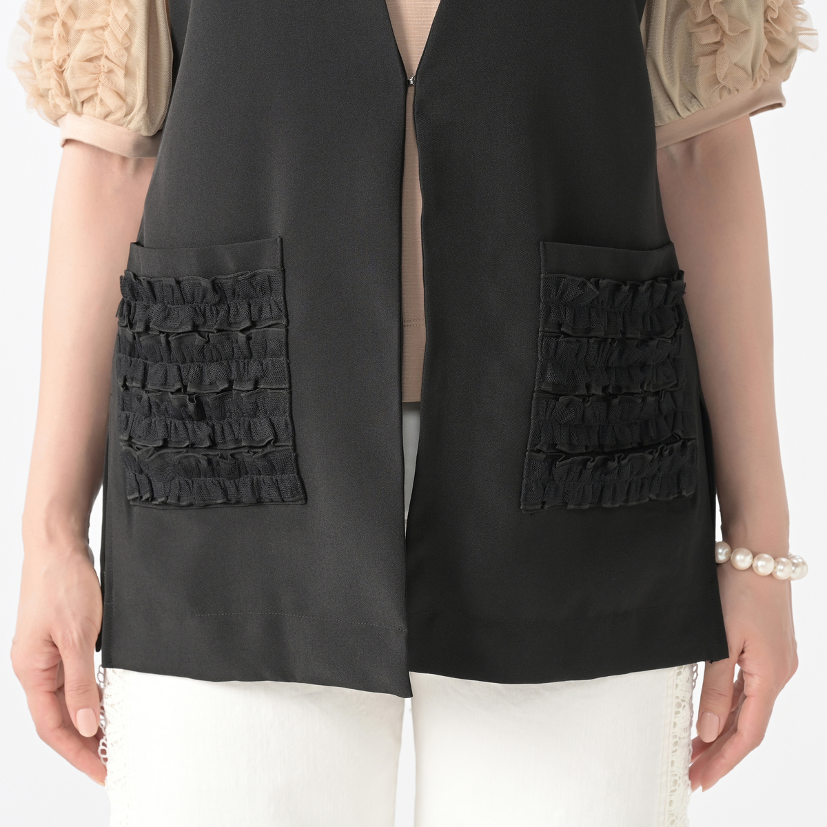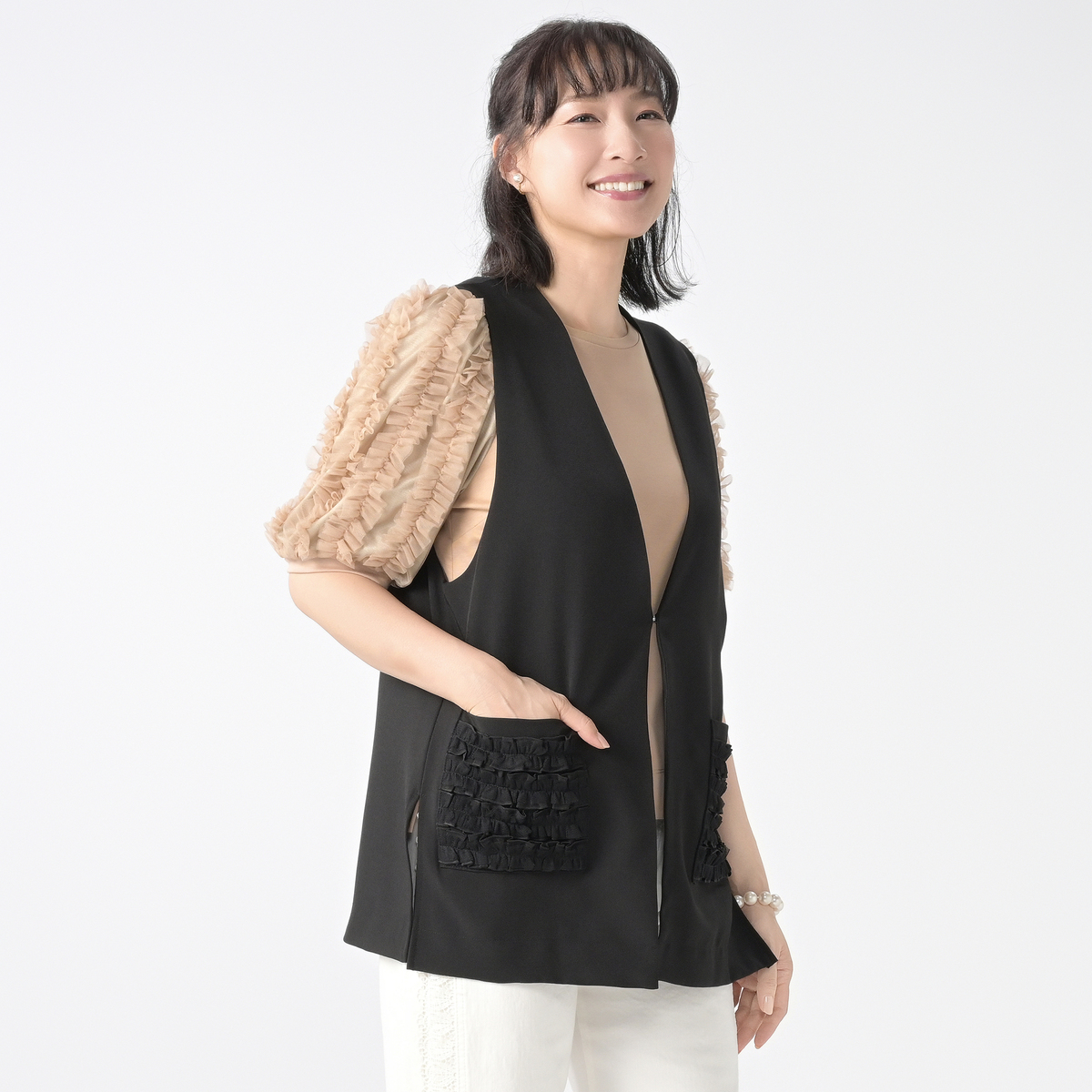 さらりとした布帛素材を使ったジレです。フェミニンなフリル装飾をポケットにあしらい、フリルは布帛とチュール二重の三重仕立てで、奥行きのある立体感を演出。深めのVネックと縦長ラインですっきり見せて、幅広いコーディネートに活躍します