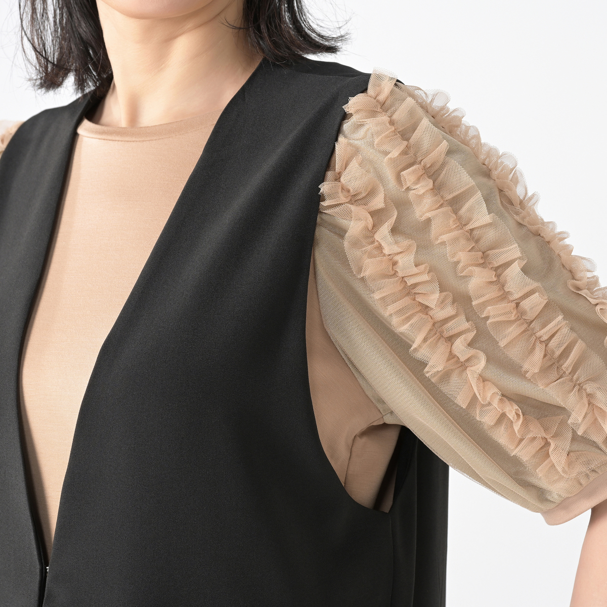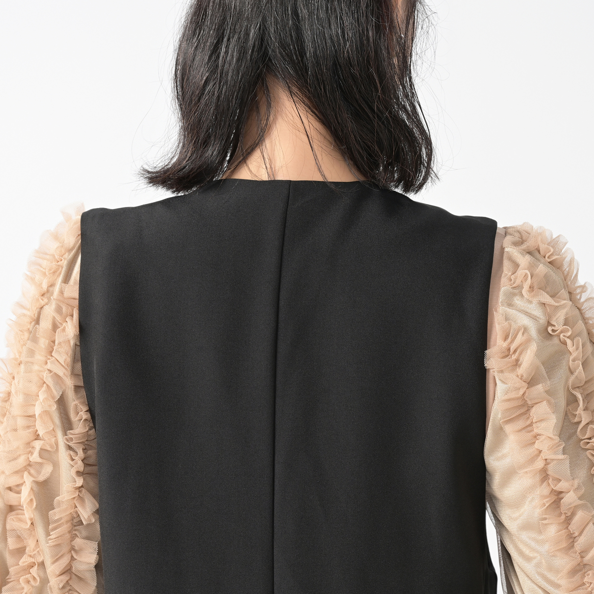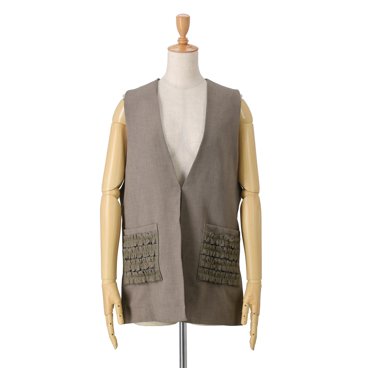 さらりとした布帛素材を使ったジレです。フェミニンなフリル装飾をポケットにあしらい、フリルは布帛とチュール二重の三重仕立てで、奥行きのある立体感を演出。深めのVネックと縦長ラインですっきり見せて、幅広いコーディネートに活躍します