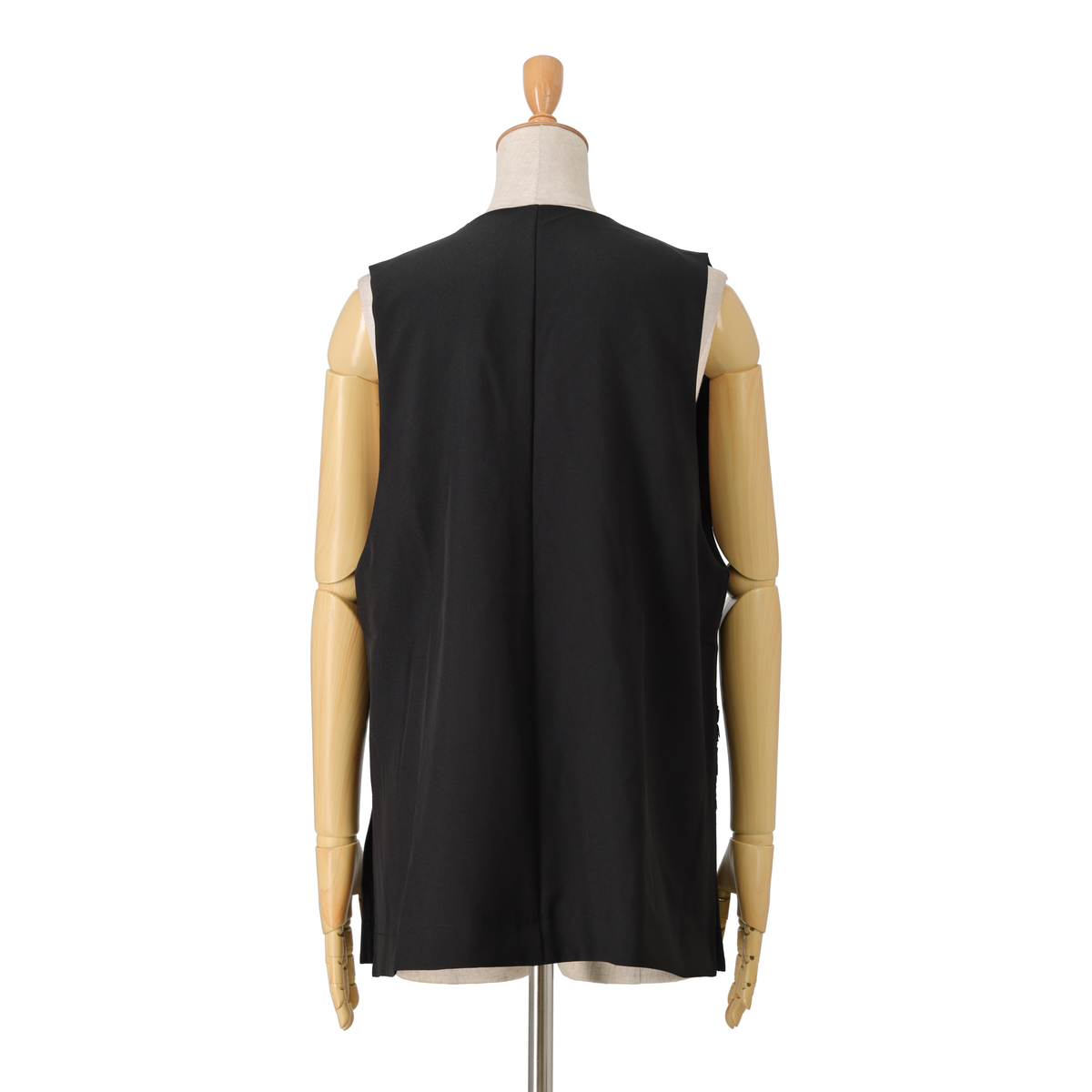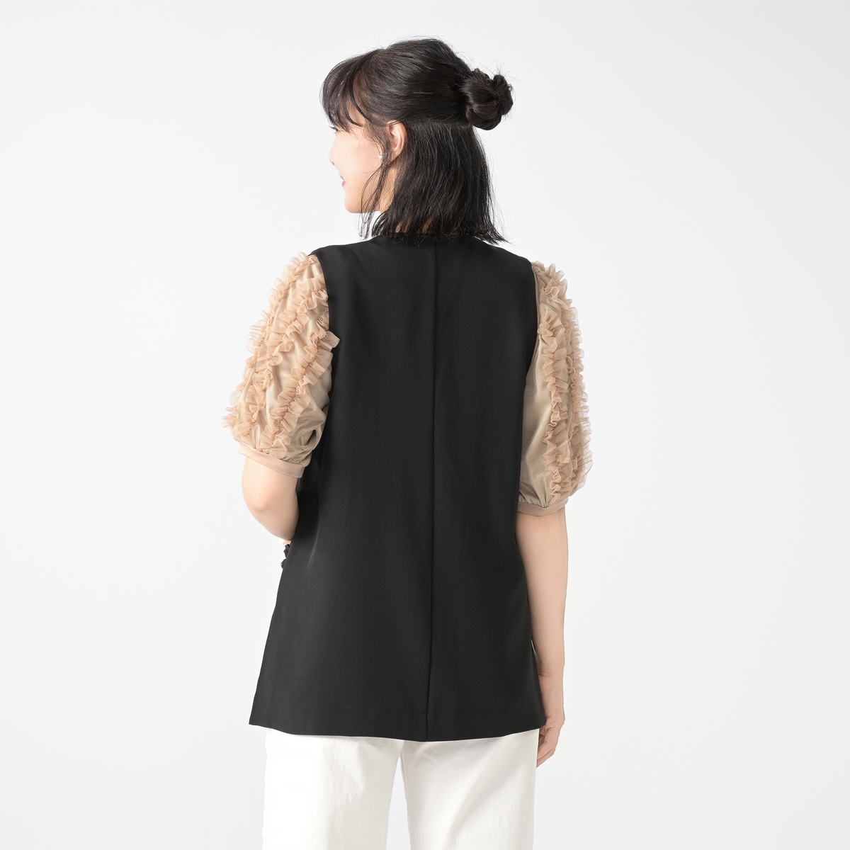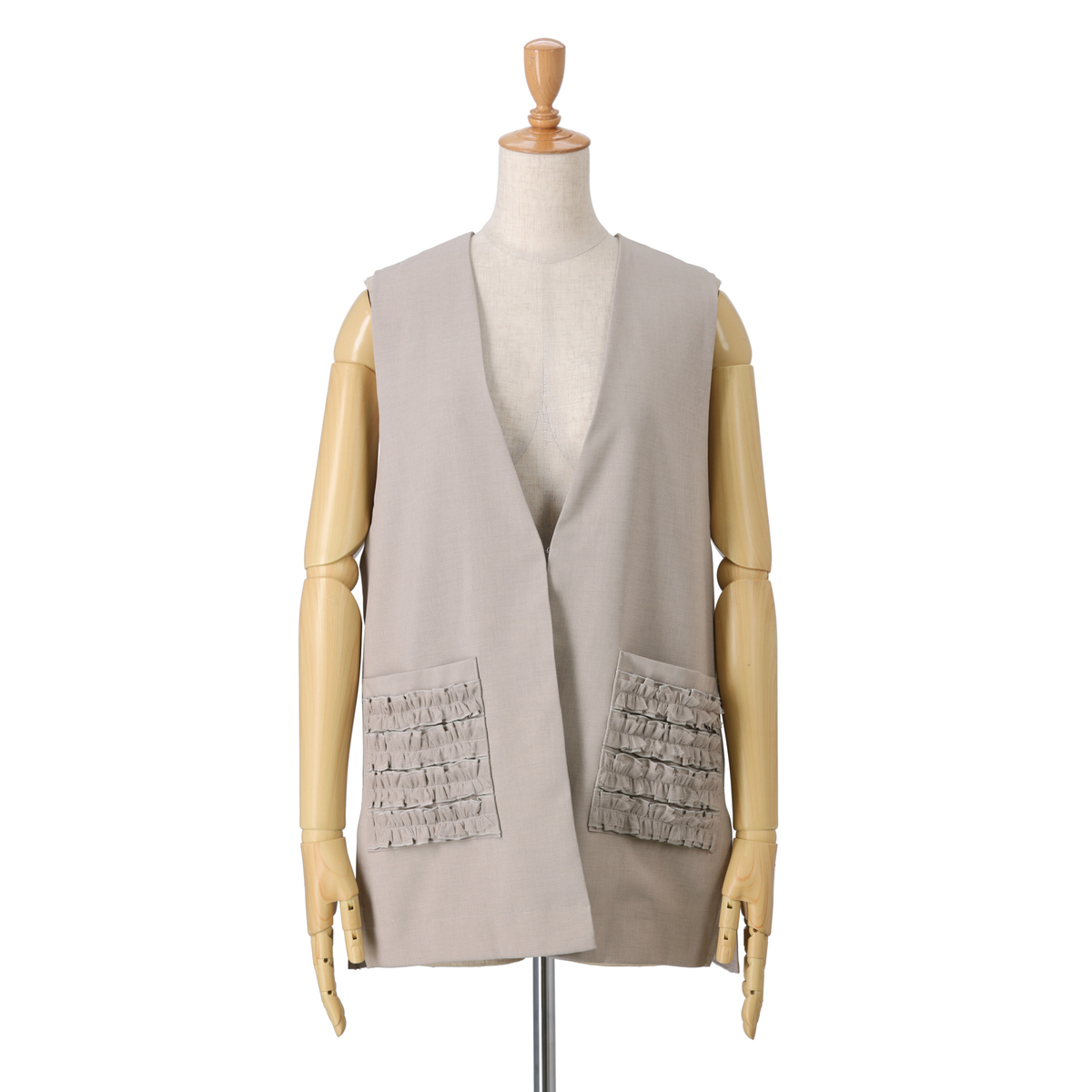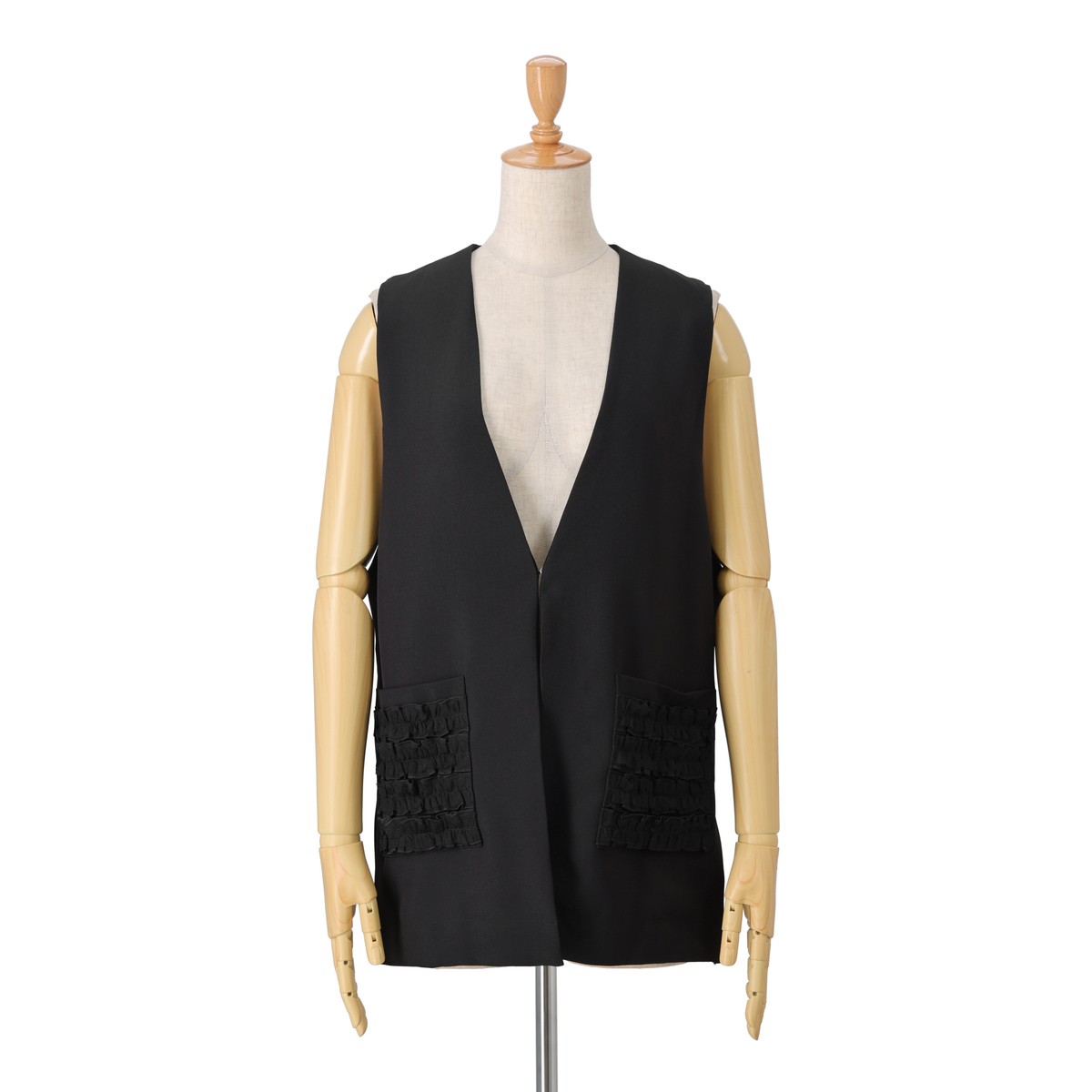 さらりとした布帛素材を使ったジレです。フェミニンなフリル装飾をポケットにあしらい、フリルは布帛とチュール二重の三重仕立てで、奥行きのある立体感を演出。深めのVネックと縦長ラインですっきり見せて、幅広いコーディネートに活躍します