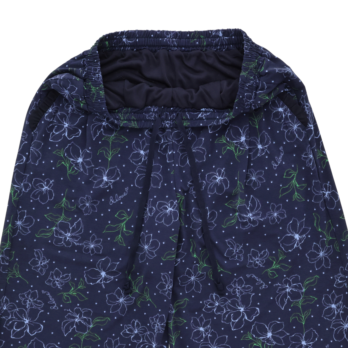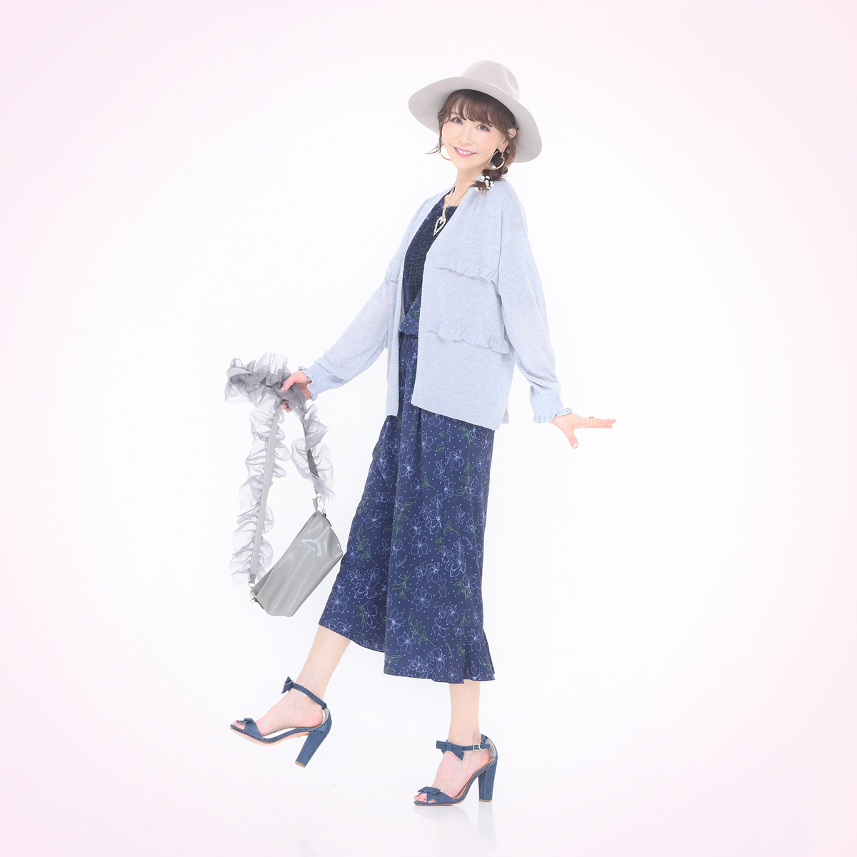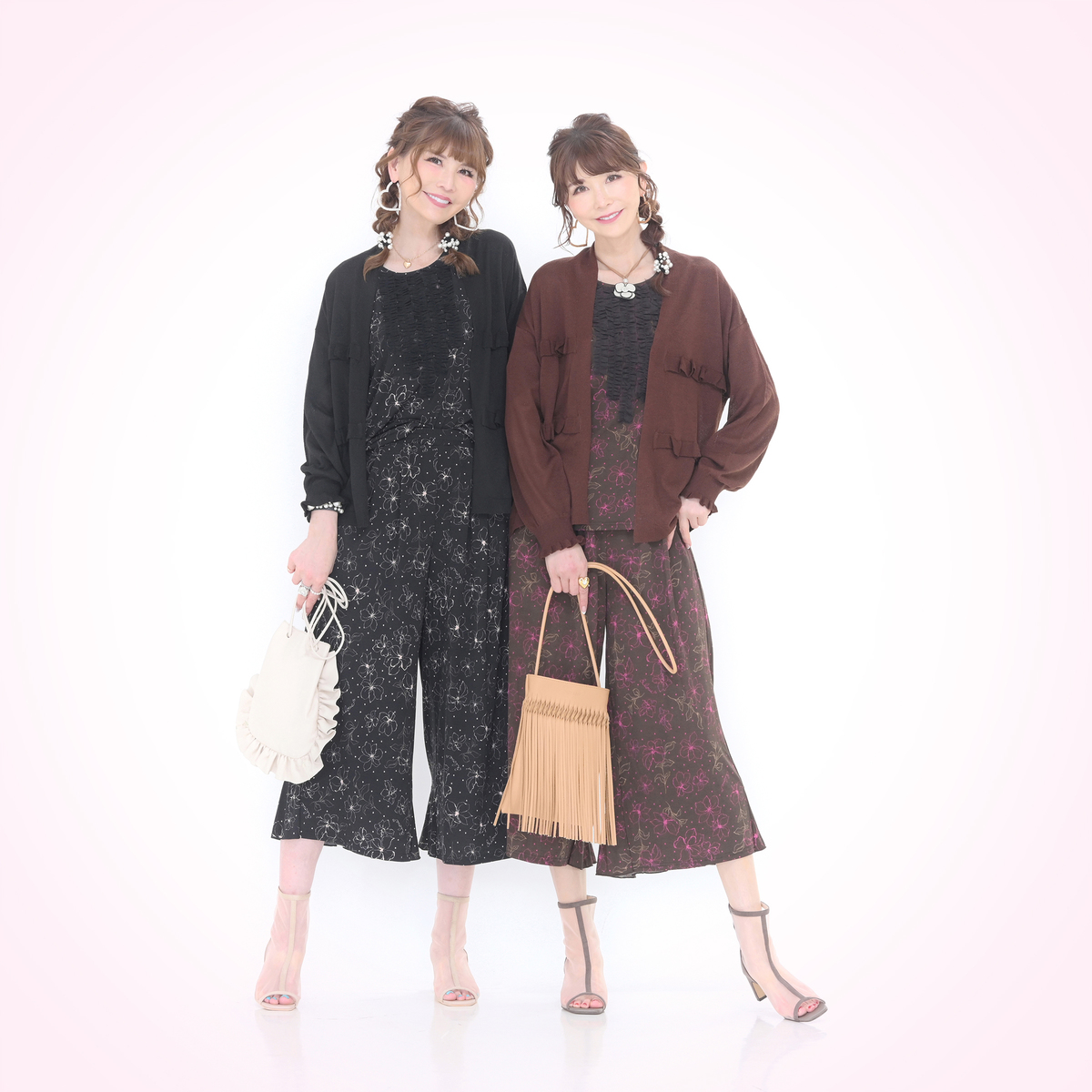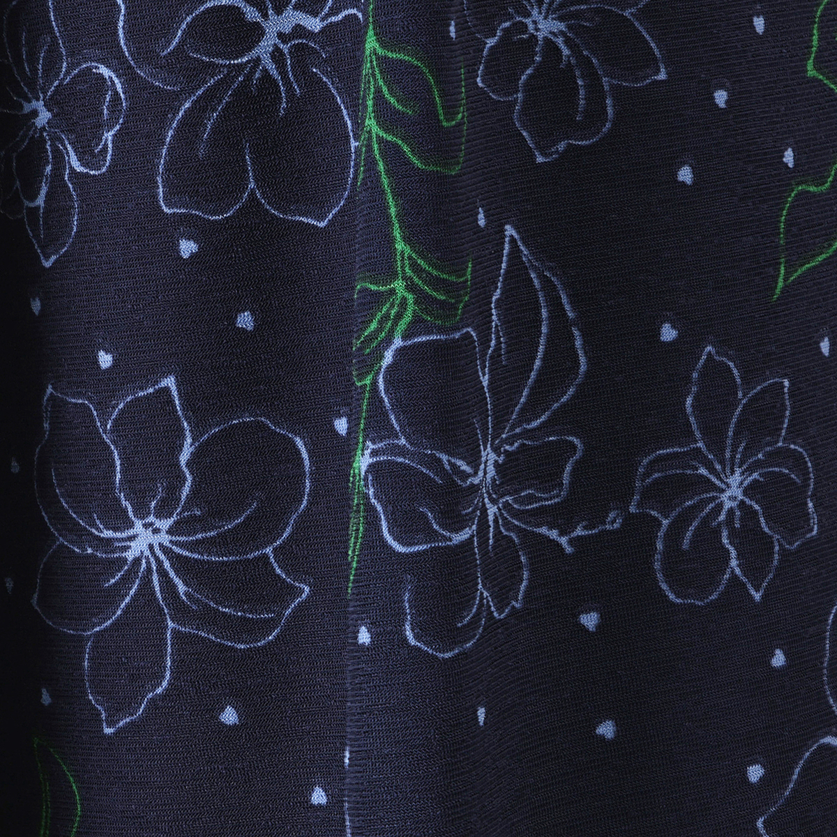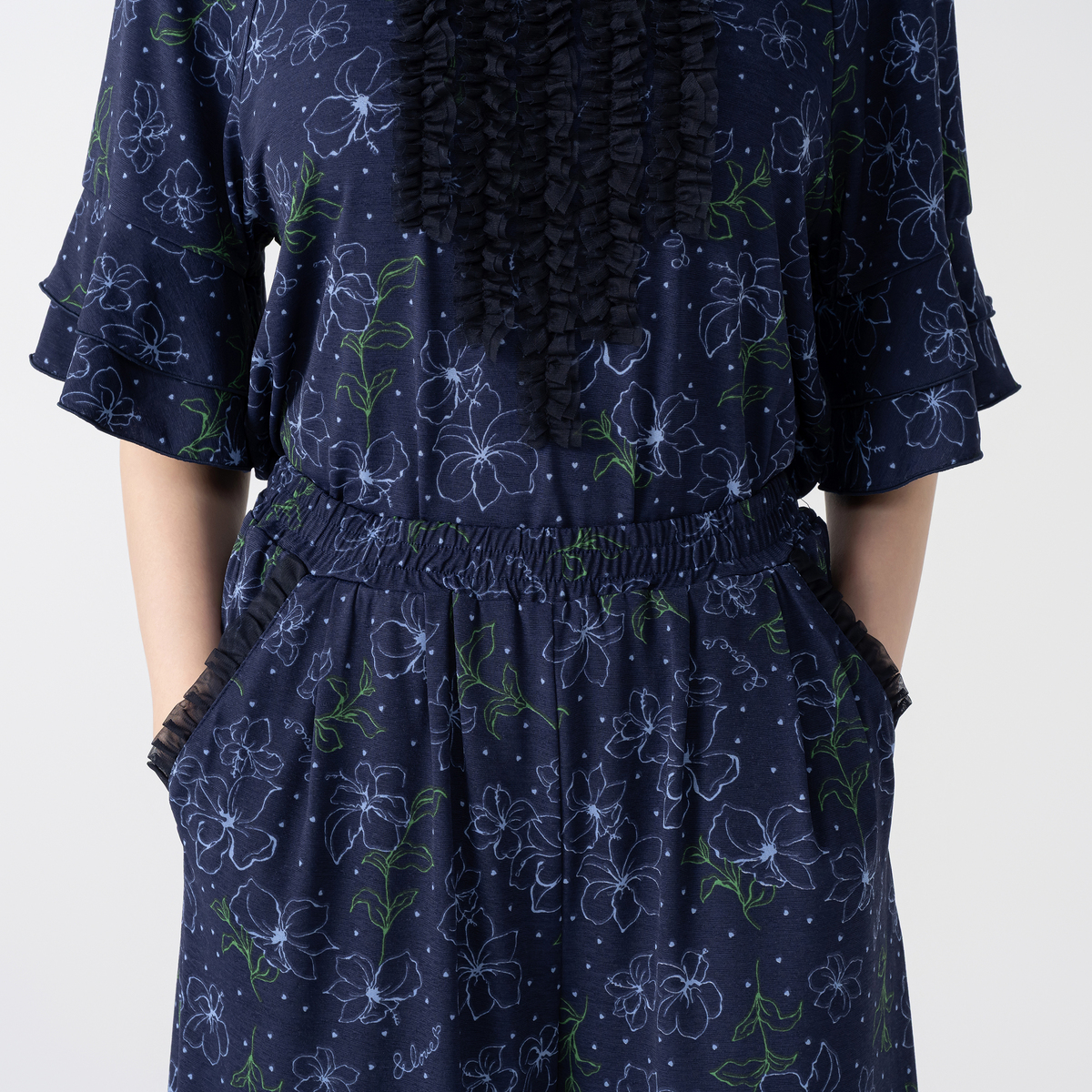 線タッチで描かれたフラワープリントが目を惹くデザイン。バックスタイルのフレアフリルや、ポケット口のチュールフリルが華やかさをプラス。同素材のトップスとのセットアップも楽しめます
