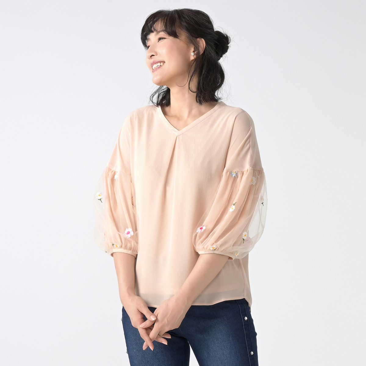 キレイめなデイリースタイルに映えるフェミニンなトップス。袖にフラワー刺繍を施したチュール素材を使い、華やかで大人可愛い印象に仕上げました