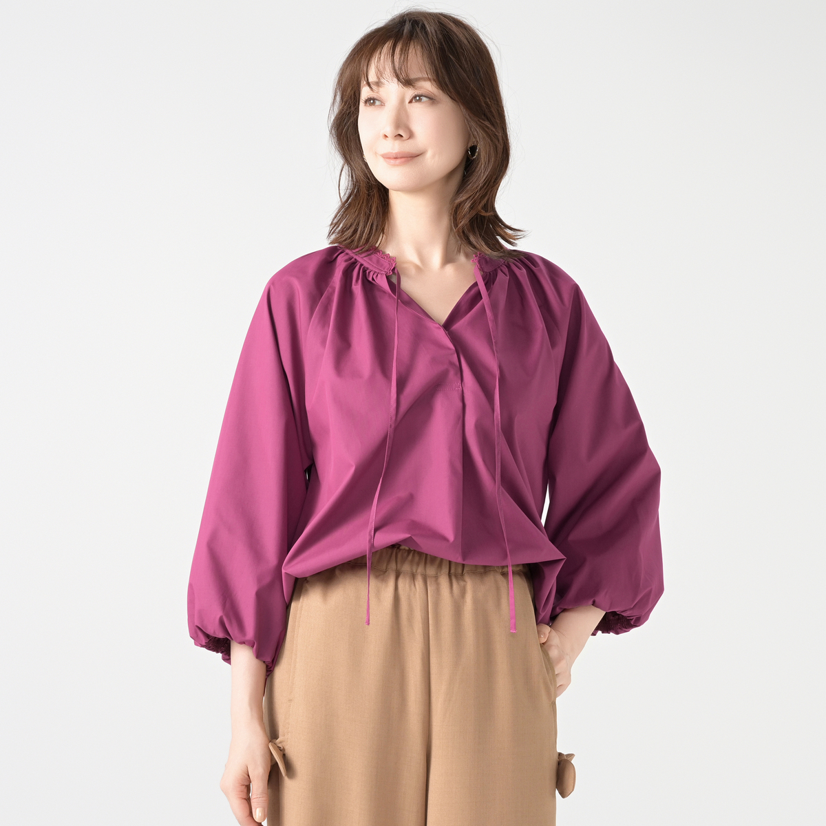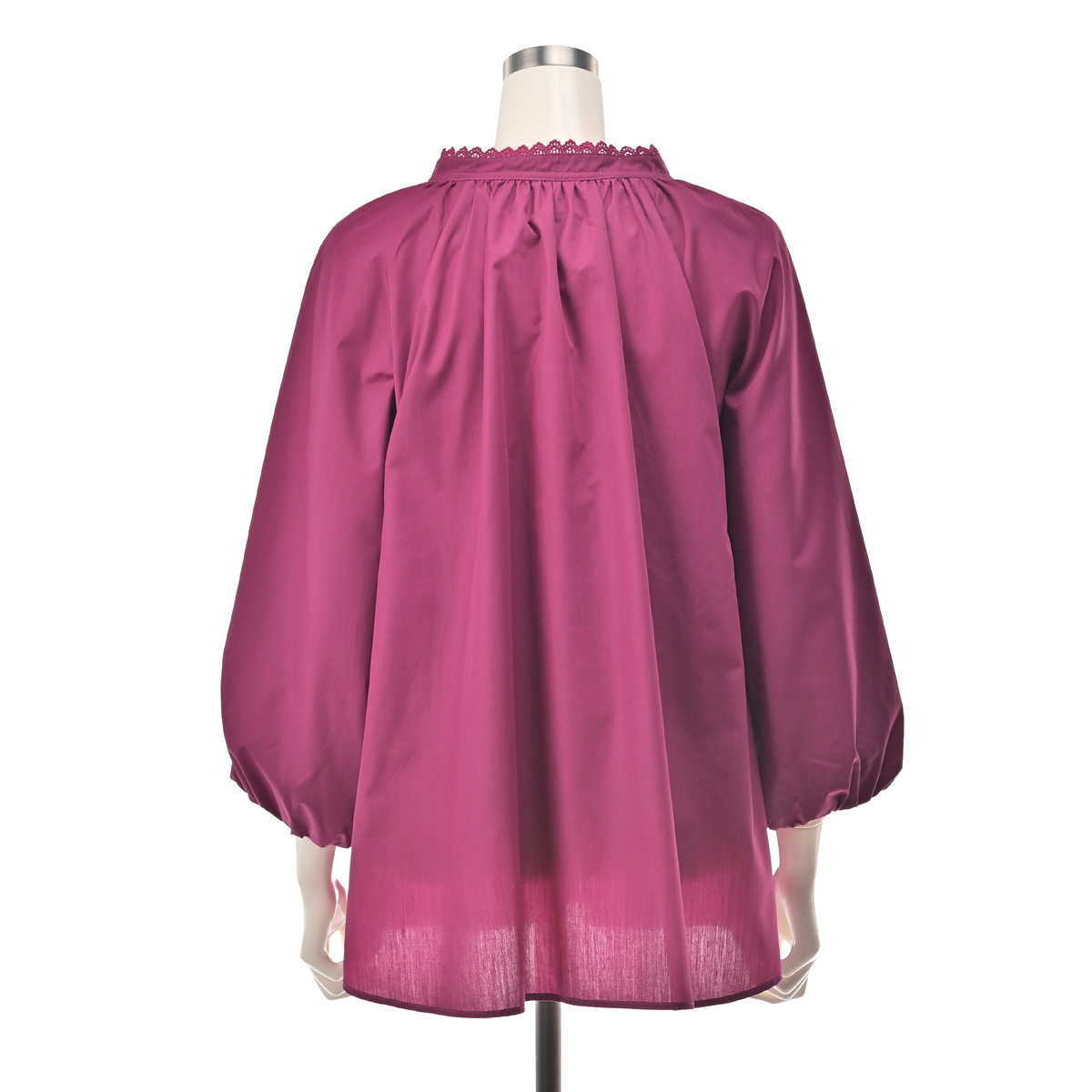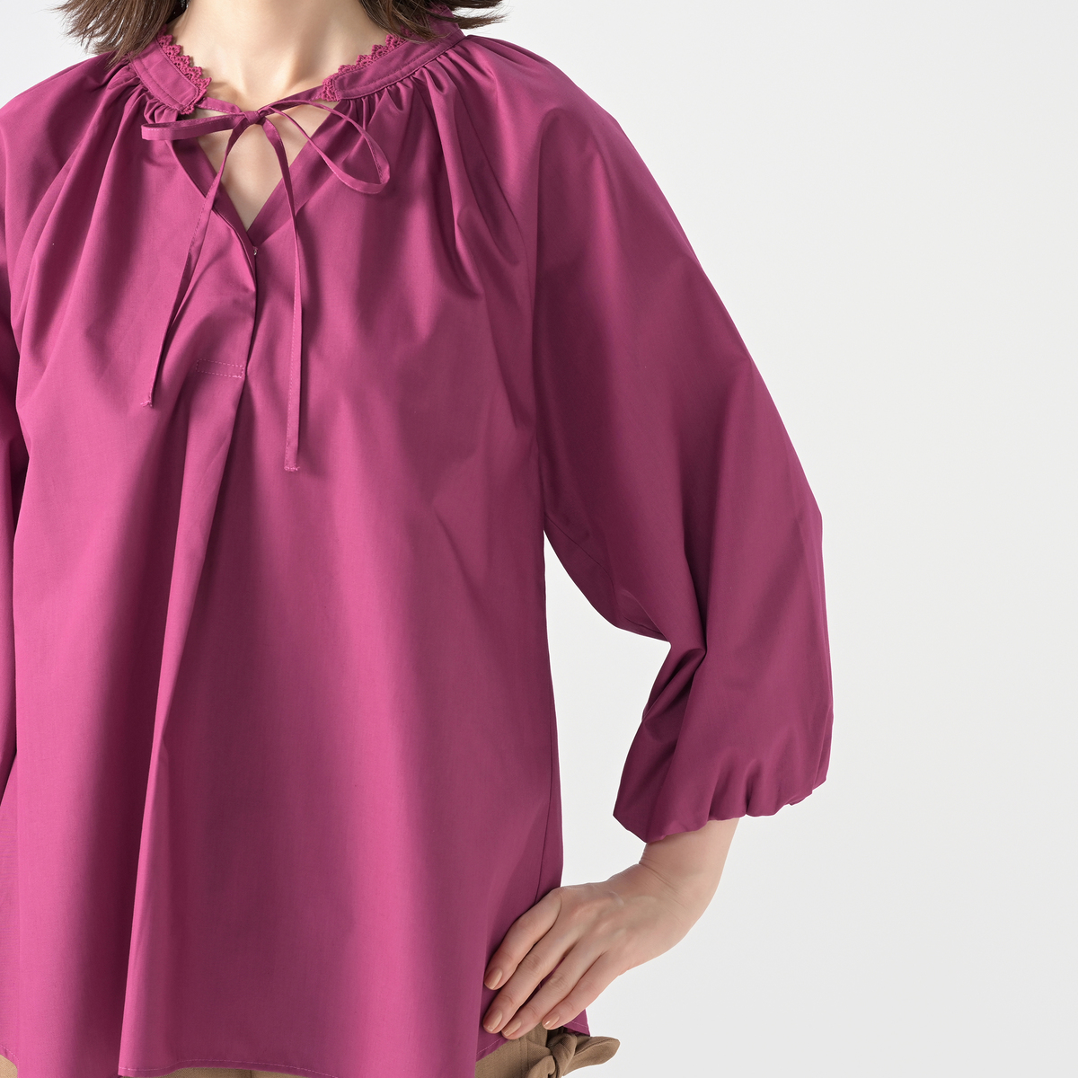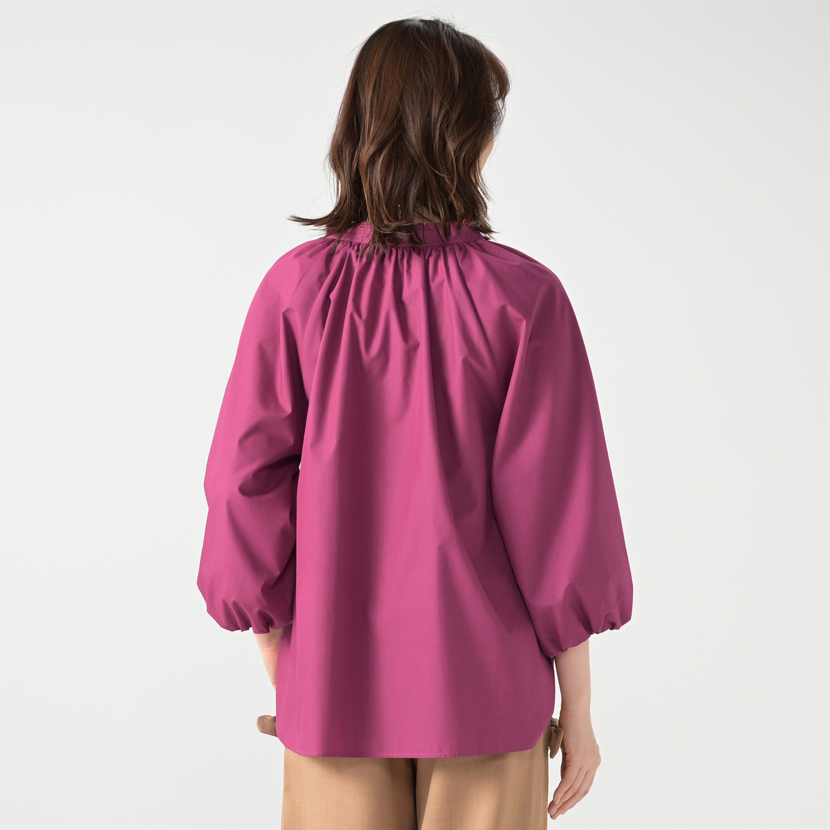 軽やかで程良くハリのある布帛素材を使用。肌離れが良く快適に着用できます。また、袖はバルーンシルエットになるよう、裏地を付けています