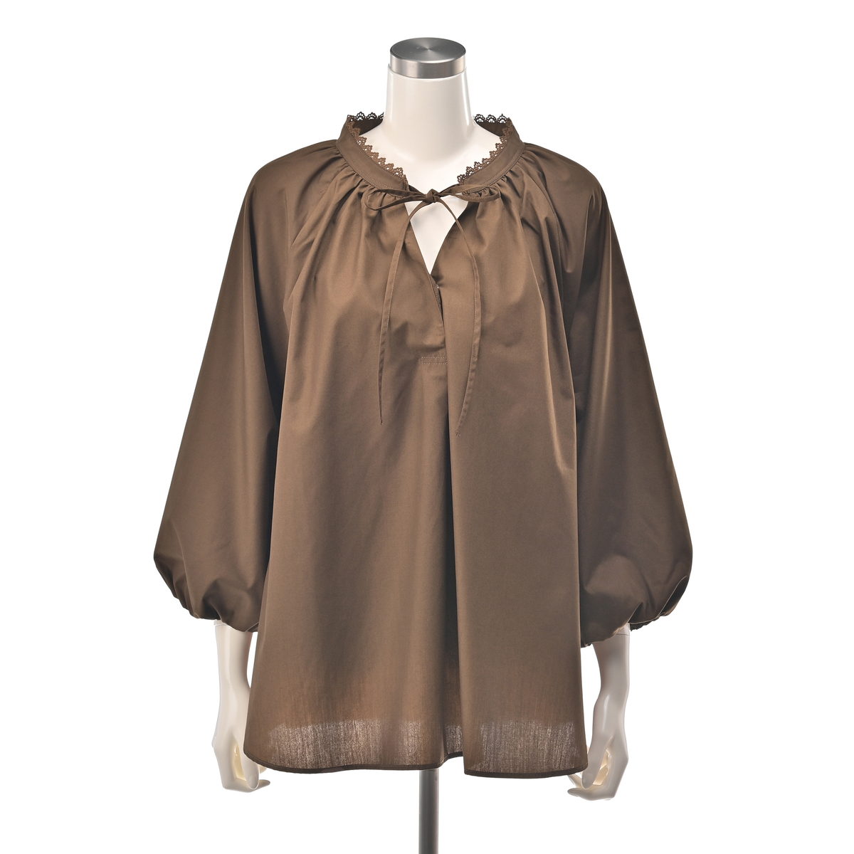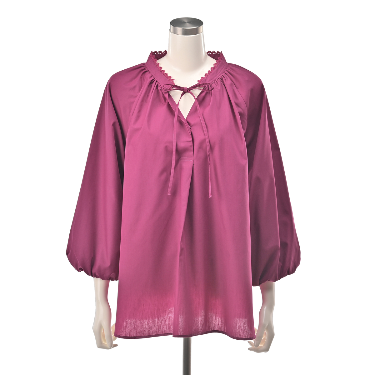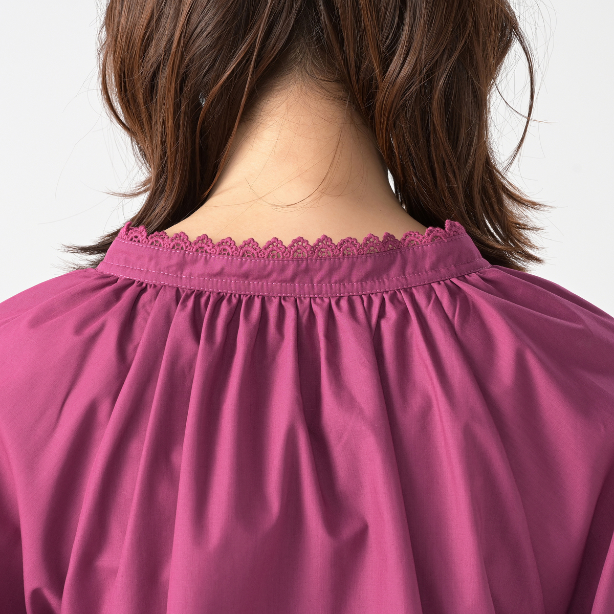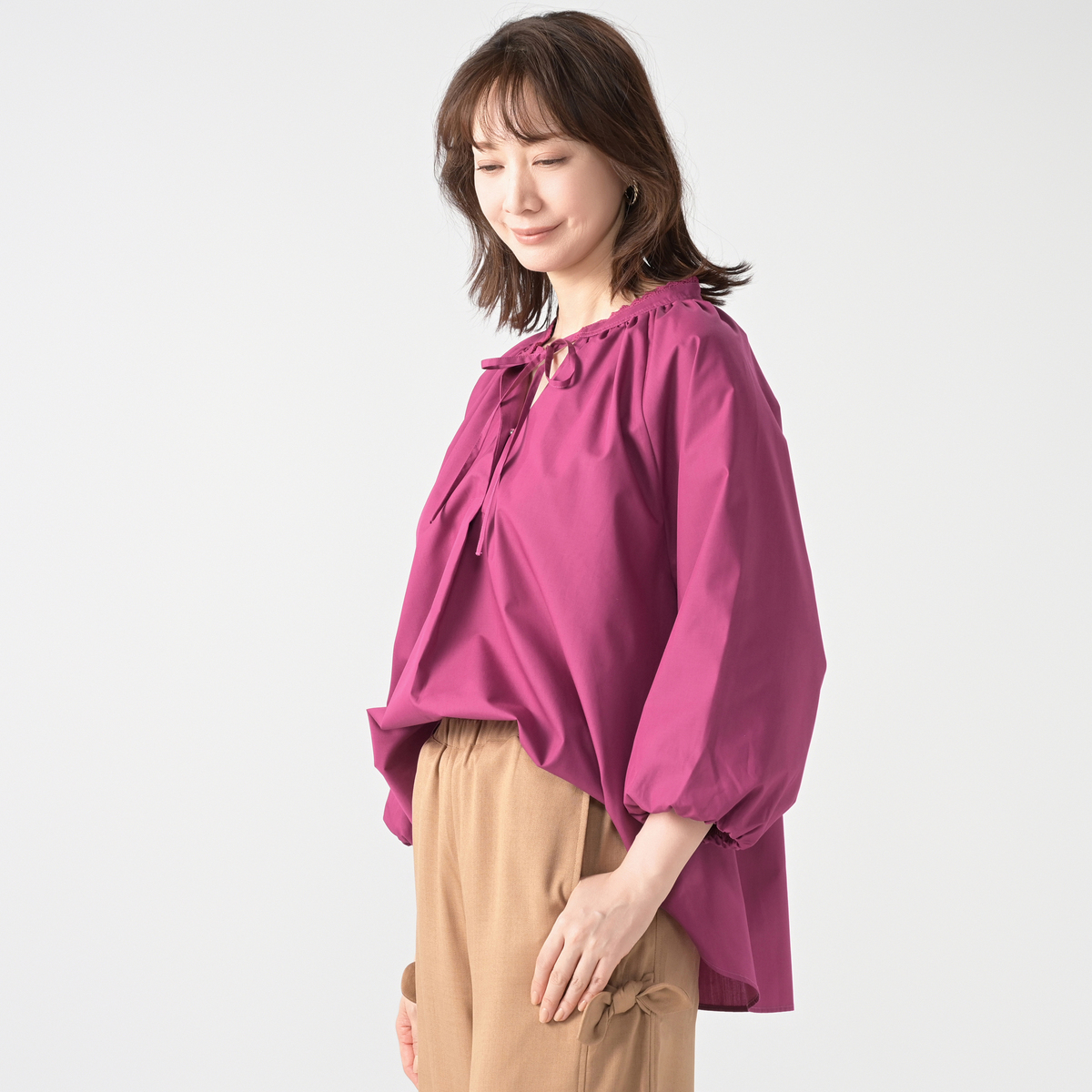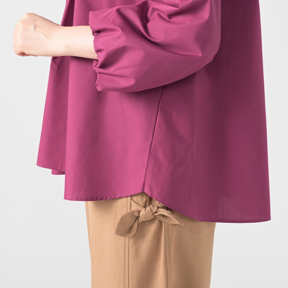 軽やかで程良くハリのある布帛素材を使用。肌離れが良く快適に着用できます。また、袖はバルーンシルエットになるよう、裏地を付けています