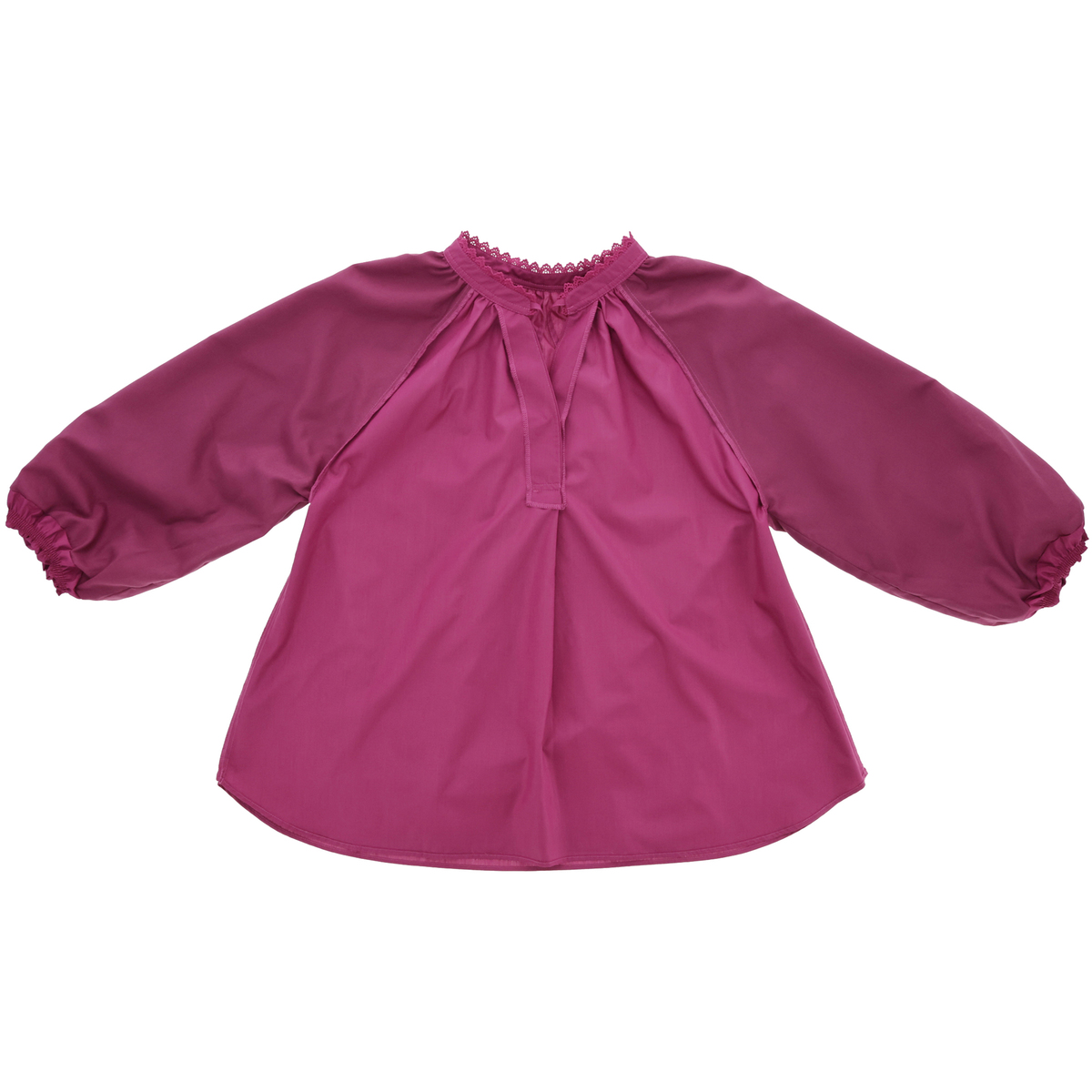 ふんだんにギャザーを施したボリュームスリーブと、襟周りにぐるりと挟み込んだピコレースが目を惹くカフタンブラウス。フロントはボタン開きで着脱もスムーズです