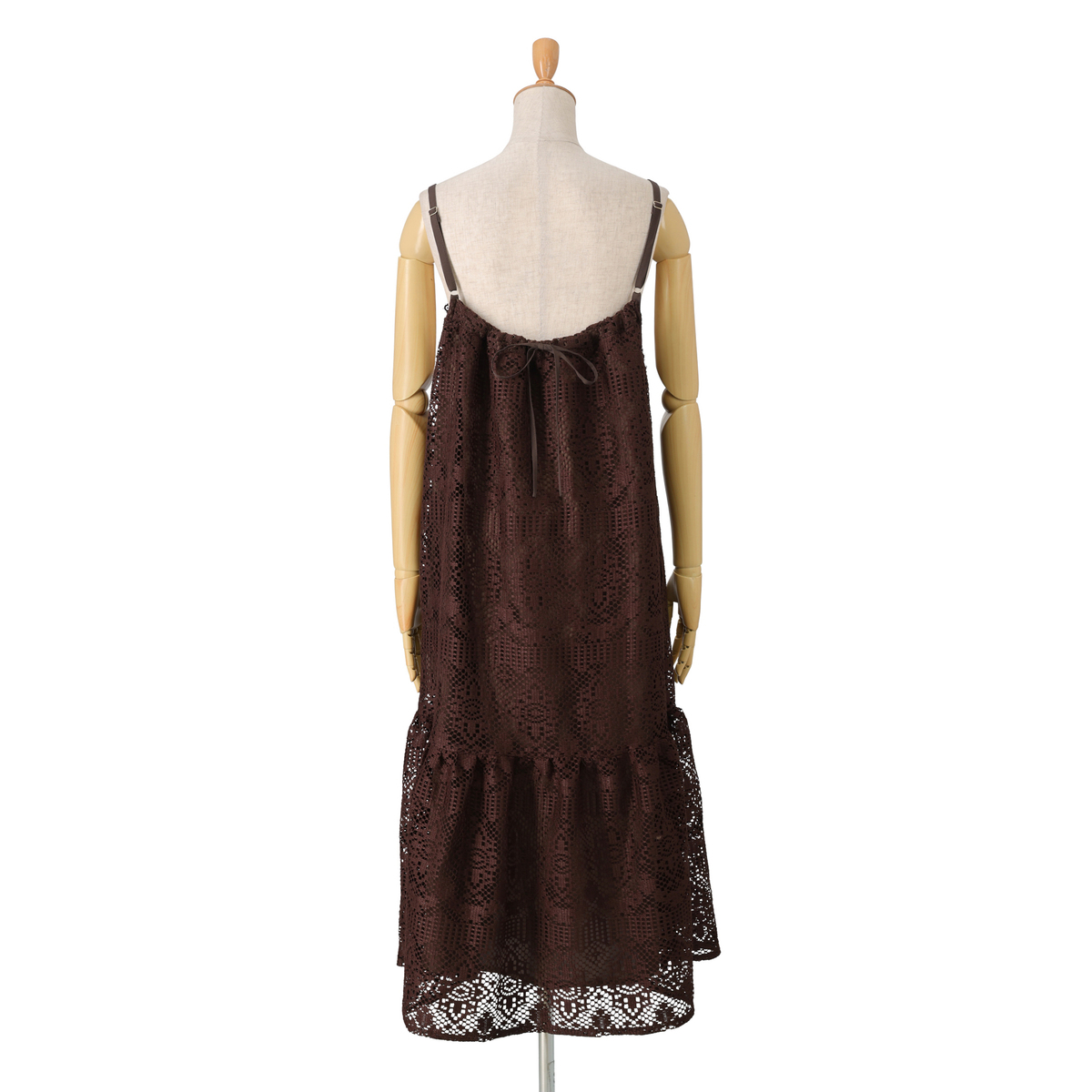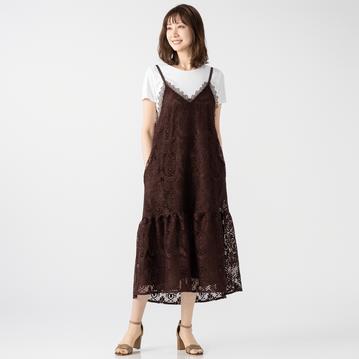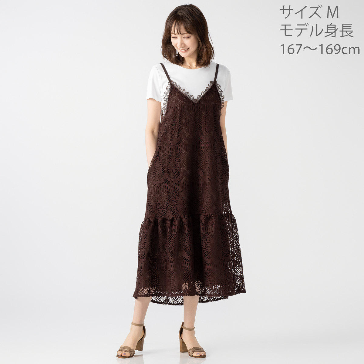 [商品寸法(ヌード)cm] サイズ バスト    着丈 ウエスト ヒップ S:96.5(72〜80)  95 (58〜64)(82〜90) M:101.5(79〜87)  95 (64〜70)(87〜95) L:106.5(86〜94)  95 (69〜77)(92〜100) LL:111.5(93〜101) 95 (77〜85)(97〜105) 3L:120.5(100〜108) 95 (85〜93)(102〜110) [素材] レース部分:ポリエステル100% 裏地:ポリエステル100% [お手入れ] 洗濯機洗い可 [注意事項] ※商品寸法の誤差は多少発生します。ご了承下さい ※洗濯後はすぐに脱水し、形を整えて干して下さい。長時間水につけたままにしないで下さい ※洗濯の際は裏返しにし、洗濯ネットを必ず使用して下さい。ドライクリーニングの際は洗濯ネットを必ず使用して下さい ※生地組織の特性から糸の浮いている部分があります。引っ掛かりにはご注意下さい ※繊細なレースを使用していますので着用・着脱の際、爪・ボタン・ヘアピン・アクセサリー・時計・指輪等が引っかからぬ様にご注意下さい ※デリケートな素材を使用していますので、爪やアクセサリーなどの引っ掛かりによりキズがつきやすくなっております ※縫目や生地を強く引っ張らないよう注意して下さい ※アイロンの際は、あて布をご使用下さい ※濃色商品は、染色の性質上、洗濯すると色落ちする事があります。淡色や白物と組み合わせての着用や洗濯はお避け下さい ※濃色商品は着用中の摩擦により他の衣料やバッグ、椅子等に色移りすることがあります ※淡色・白の製品と組み合わせての着用や洗濯はお避け下さい。また、雨や汗等で濡れた状態で着用すると色移りすることがあります。その際はお早めに洗濯をして下さい ※肩紐のアジャスター部分(マルカンやエイトカン)にアイロンを当てないで下さい ※レース部分は糸端が飛び出ている箇所があります。着用、洗濯・クリーニングにより多少ほつれが生じることがありますのでご了承下さい ※着用時にベルトやバッグ、周囲の壁など、表面の粗いものとの摩擦や引っかかりに注意して下さい ※洗濯後は重ね置きしないで下さい ※ゴム部分へのアイロンはお避け下さい ※フリル部分はスチームアイロンを浮かしながら掛け、形を整えて下さい ※製品によっては、柄の出方が異なることがありますのでご了承下さい ※商品寸法の誤差は多少発生します。ご了承下さい 【中国製】