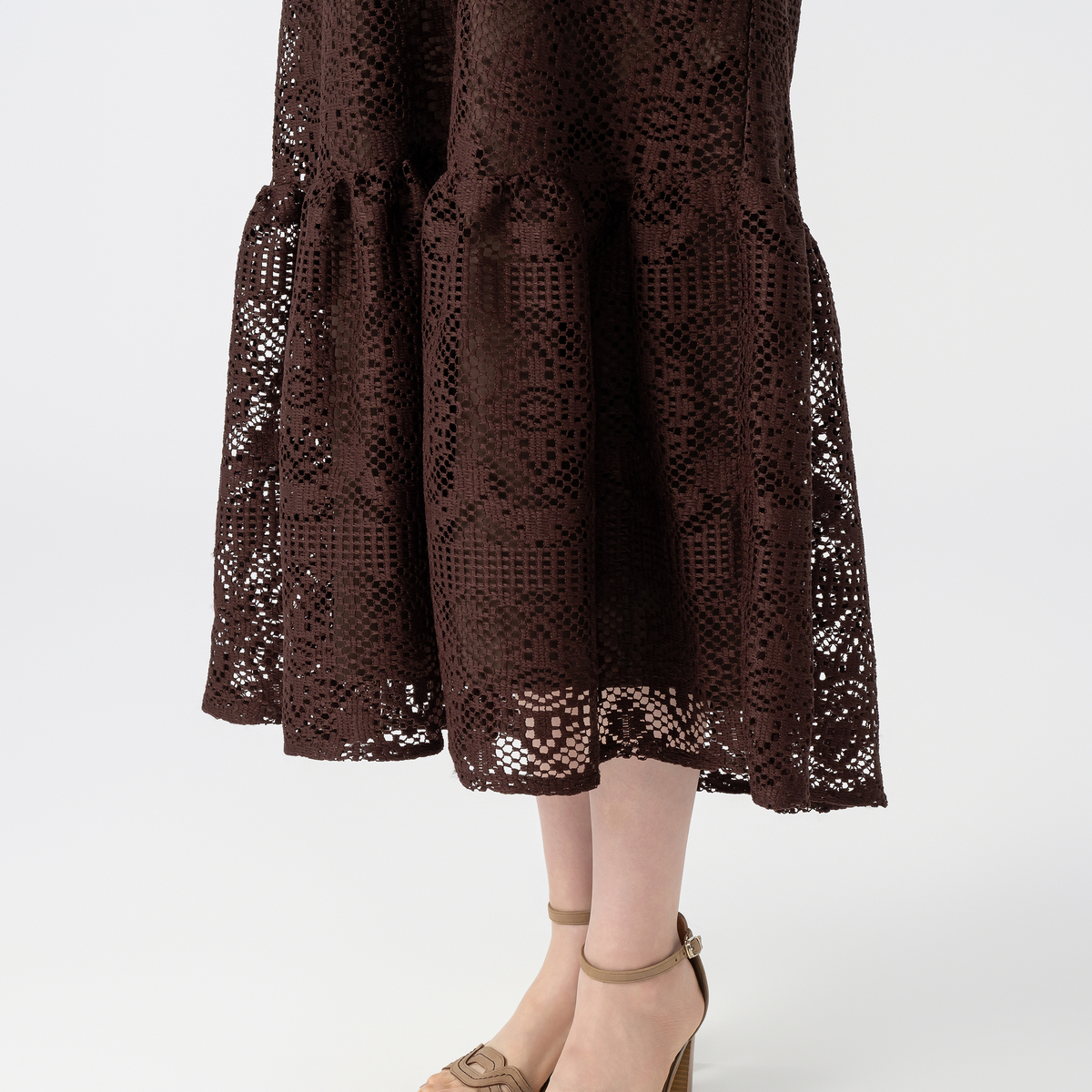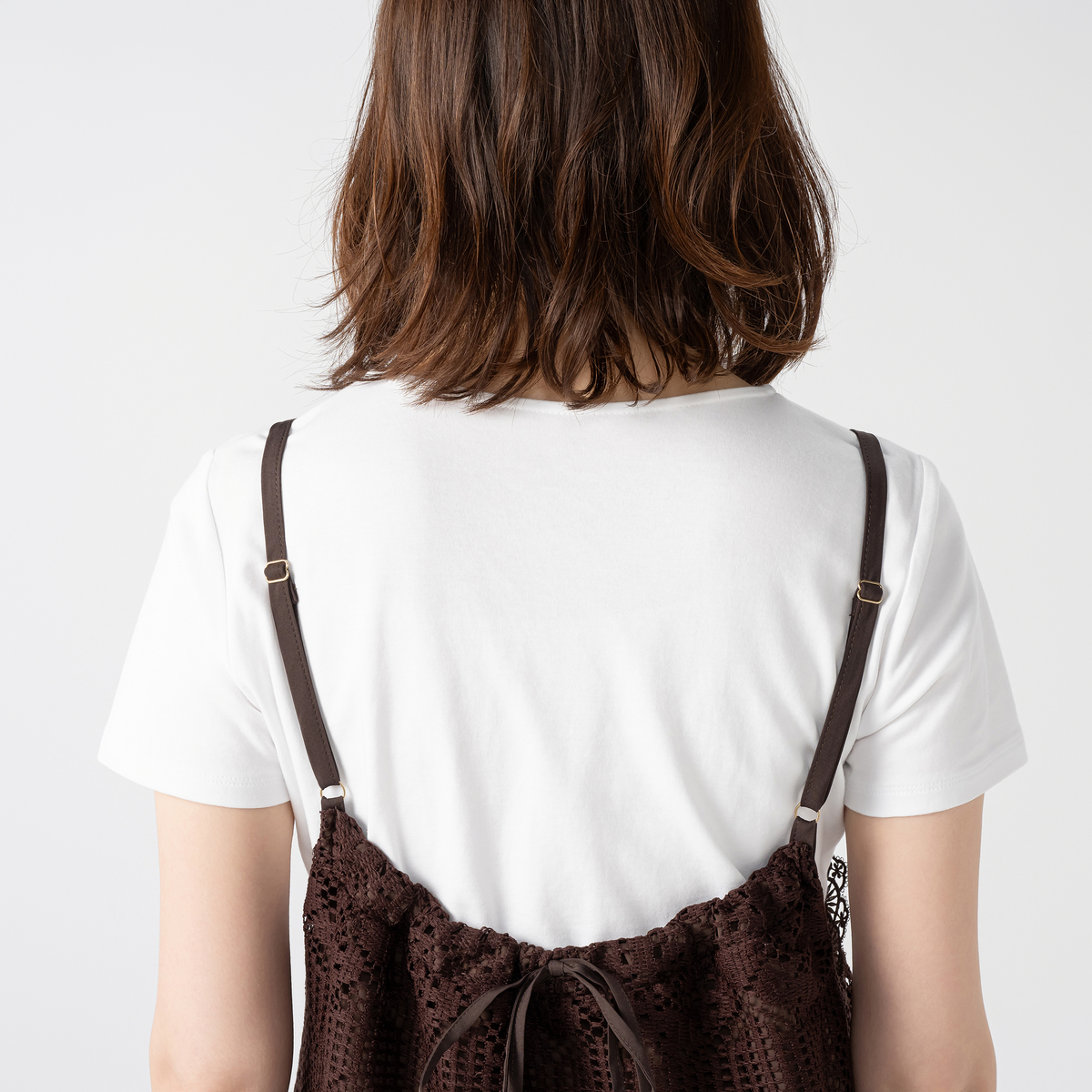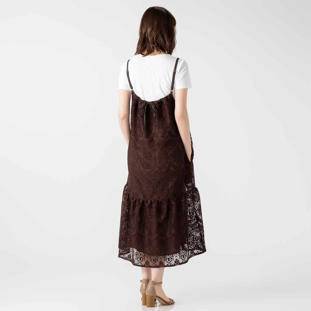 [商品寸法(ヌード)cm] サイズ バスト    着丈 ウエスト ヒップ S:96.5(72〜80)  95 (58〜64)(82〜90) M:101.5(79〜87)  95 (64〜70)(87〜95) L:106.5(86〜94)  95 (69〜77)(92〜100) LL:111.5(93〜101) 95 (77〜85)(97〜105) 3L:120.5(100〜108) 95 (85〜93)(102〜110) [素材] レース部分:ポリエステル100% 裏地:ポリエステル100% [お手入れ] 洗濯機洗い可 [注意事項] ※商品寸法の誤差は多少発生します。ご了承下さい ※洗濯後はすぐに脱水し、形を整えて干して下さい。長時間水につけたままにしないで下さい ※洗濯の際は裏返しにし、洗濯ネットを必ず使用して下さい。ドライクリーニングの際は洗濯ネットを必ず使用して下さい ※生地組織の特性から糸の浮いている部分があります。引っ掛かりにはご注意下さい ※繊細なレースを使用していますので着用・着脱の際、爪・ボタン・ヘアピン・アクセサリー・時計・指輪等が引っかからぬ様にご注意下さい ※デリケートな素材を使用していますので、爪やアクセサリーなどの引っ掛かりによりキズがつきやすくなっております ※縫目や生地を強く引っ張らないよう注意して下さい ※アイロンの際は、あて布をご使用下さい ※濃色商品は、染色の性質上、洗濯すると色落ちする事があります。淡色や白物と組み合わせての着用や洗濯はお避け下さい ※濃色商品は着用中の摩擦により他の衣料やバッグ、椅子等に色移りすることがあります ※淡色・白の製品と組み合わせての着用や洗濯はお避け下さい。また、雨や汗等で濡れた状態で着用すると色移りすることがあります。その際はお早めに洗濯をして下さい ※肩紐のアジャスター部分(マルカンやエイトカン)にアイロンを当てないで下さい ※レース部分は糸端が飛び出ている箇所があります。着用、洗濯・クリーニングにより多少ほつれが生じることがありますのでご了承下さい ※着用時にベルトやバッグ、周囲の壁など、表面の粗いものとの摩擦や引っかかりに注意して下さい ※洗濯後は重ね置きしないで下さい ※ゴム部分へのアイロンはお避け下さい ※フリル部分はスチームアイロンを浮かしながら掛け、形を整えて下さい ※製品によっては、柄の出方が異なることがありますのでご了承下さい ※商品寸法の誤差は多少発生します。ご了承下さい 【中国製】