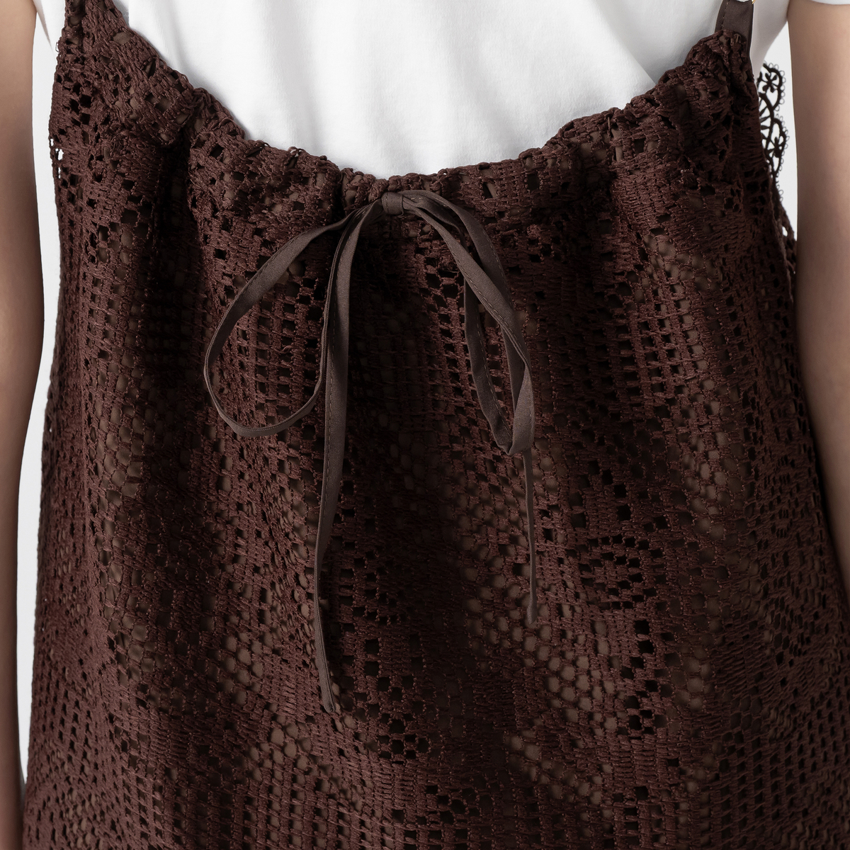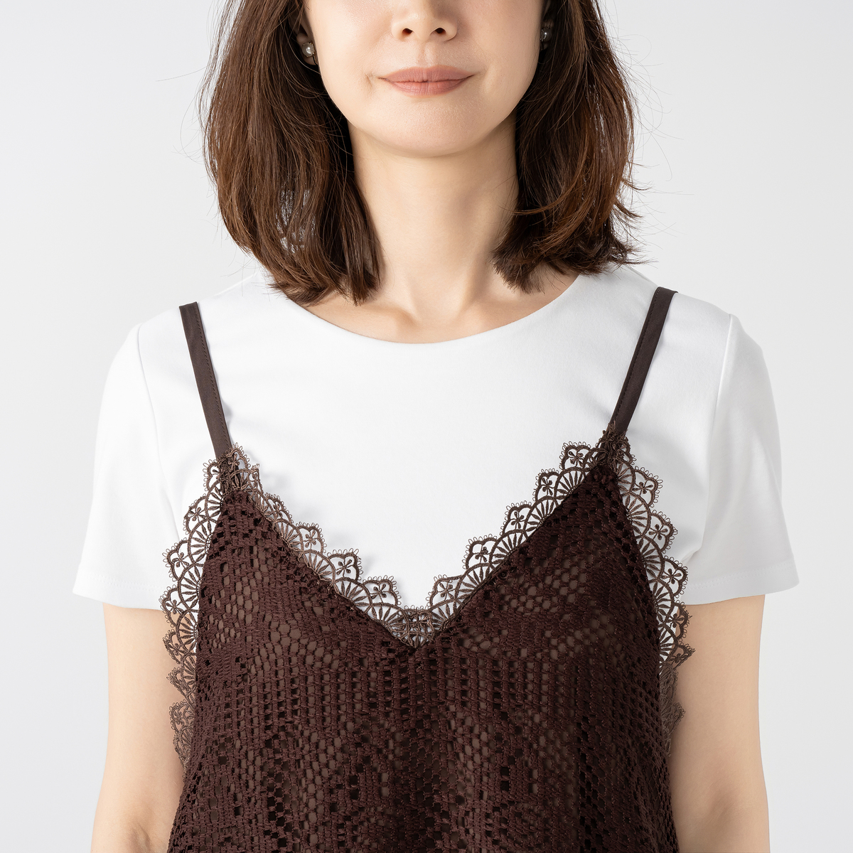 繊細なフラワー柄とスカラップが調和したカギ針風ラッセルレースのキャミドレスです。立体感のある編地と程よいハリ感で、体のラインを拾いにくくきれいなシルエットをキープ。裏地付きでしっかりとした素材感が大人の魅力を引き立てます