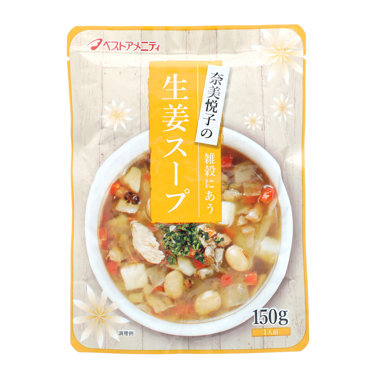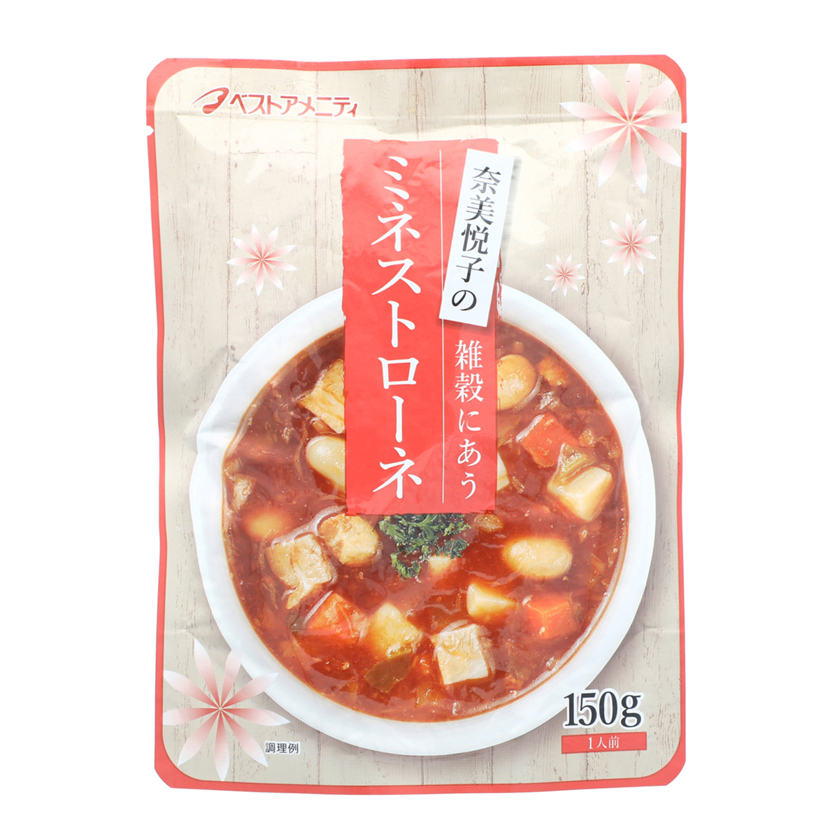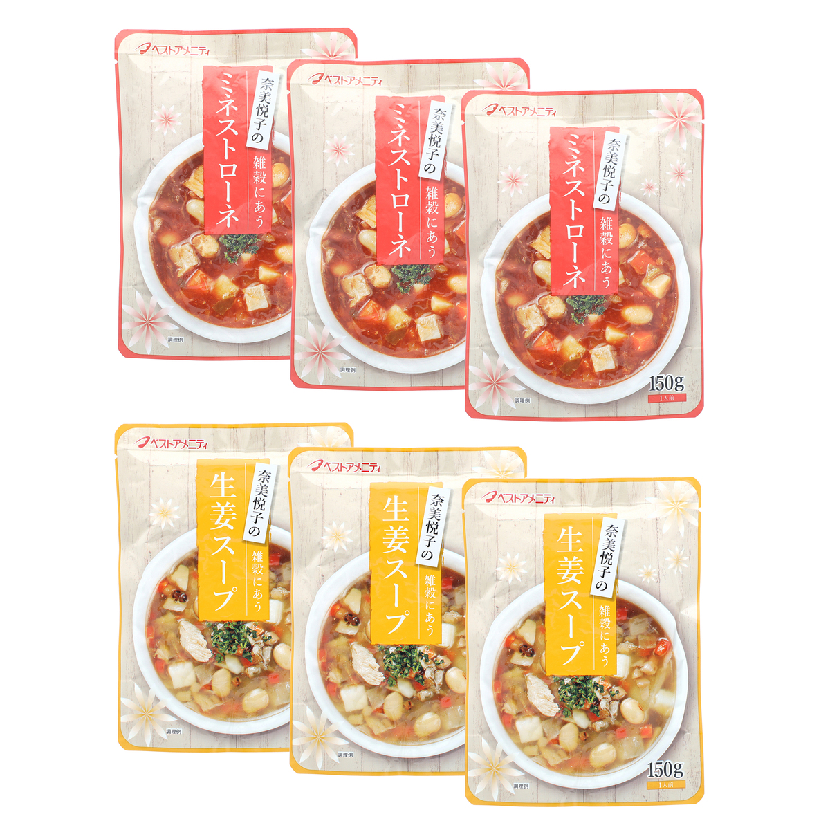奈美悦子さん監修の雑穀にあうスープです。ミネストローネと生姜スープの2種計6袋をセットでお届け。湯煎または電子レンジで温めるだけで手軽にお召し上がりいただけます