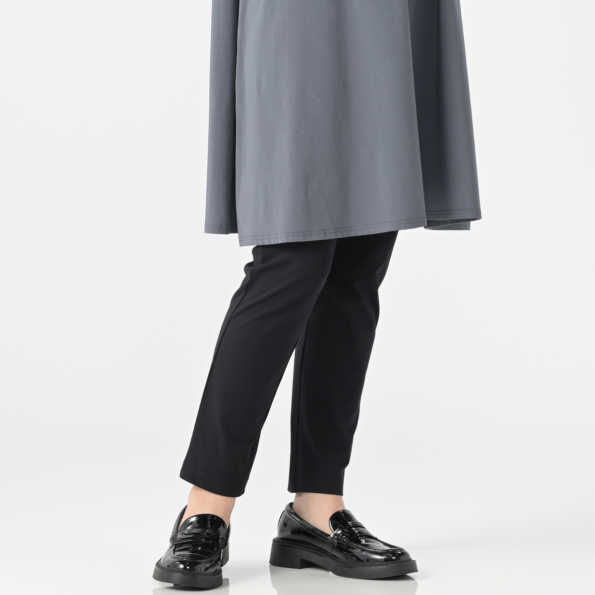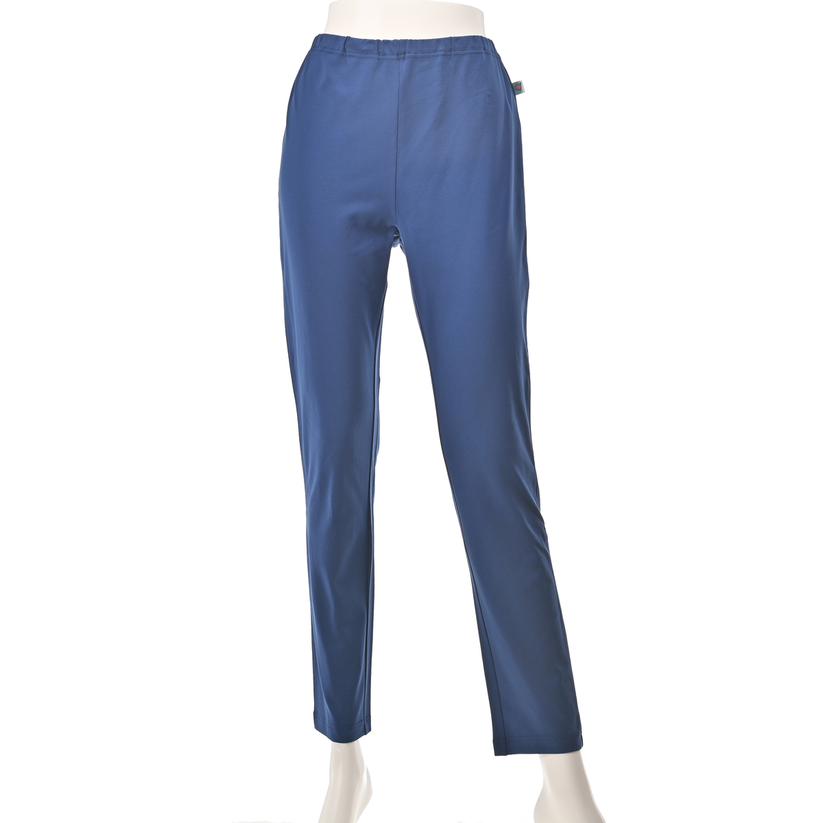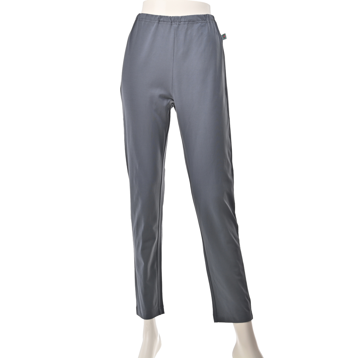 オリジナルのベア天竺素材で仕立てたスリムパンツ。脚のラインをすっきり見せるテーパードシルエットで、いつもの装いをオシャレにまとめます。ウエスト全体はゴム仕様で、引っ張って穿くだけのラクチンデザインです