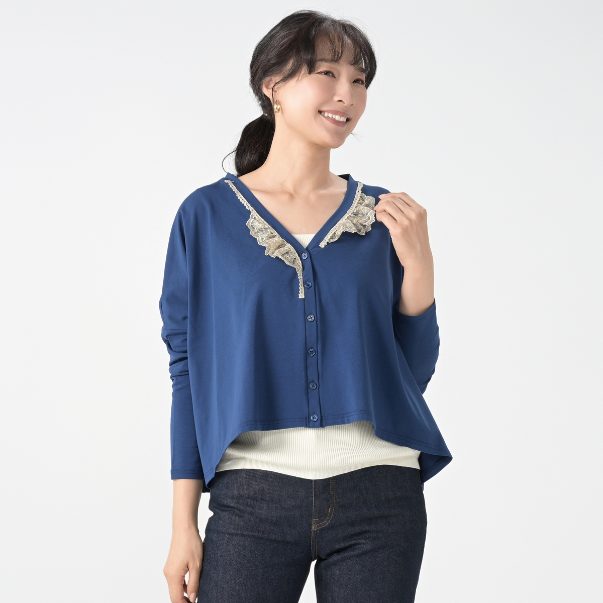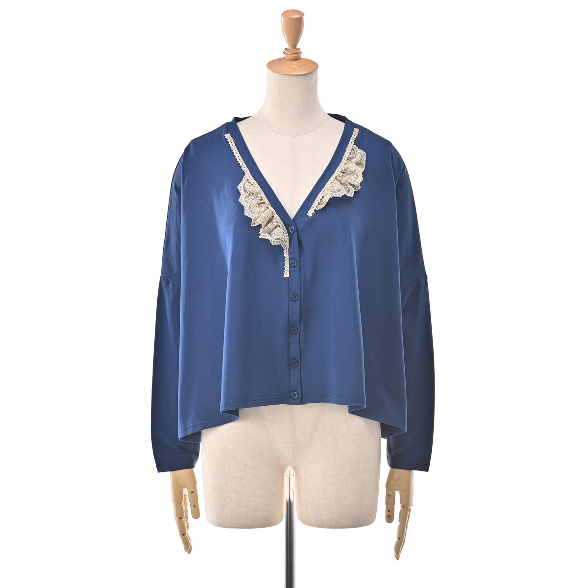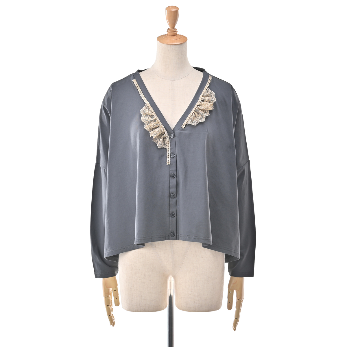 フロントの衿端にレーステープを施したVネックカーディガン。身幅のゆったりした定番のシルエットです。さっと羽織るだけで存在感のあるスタイルに仕上がります