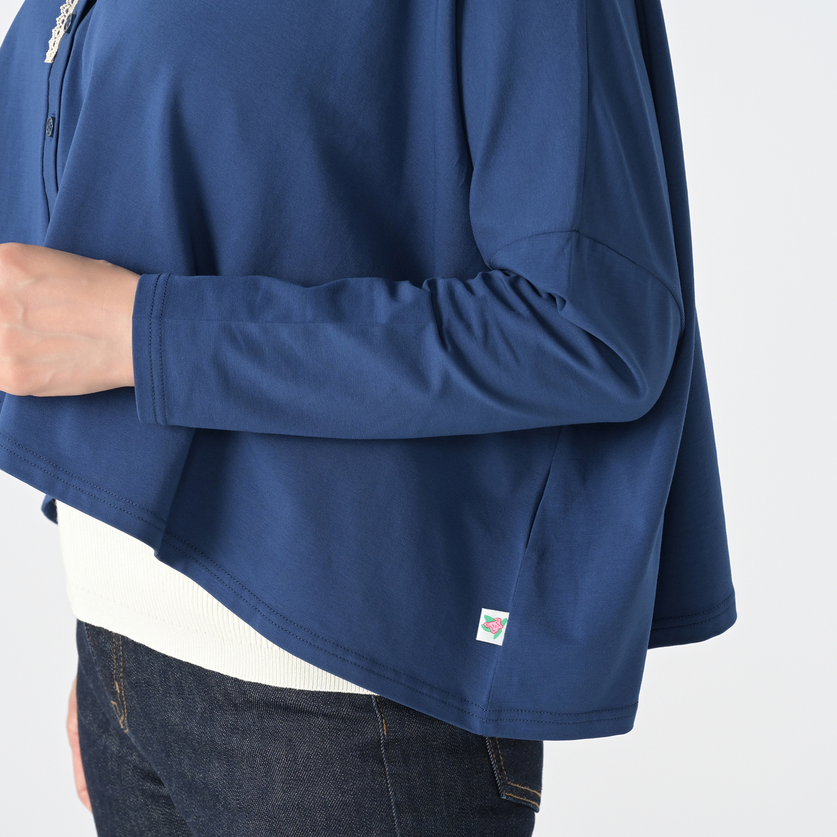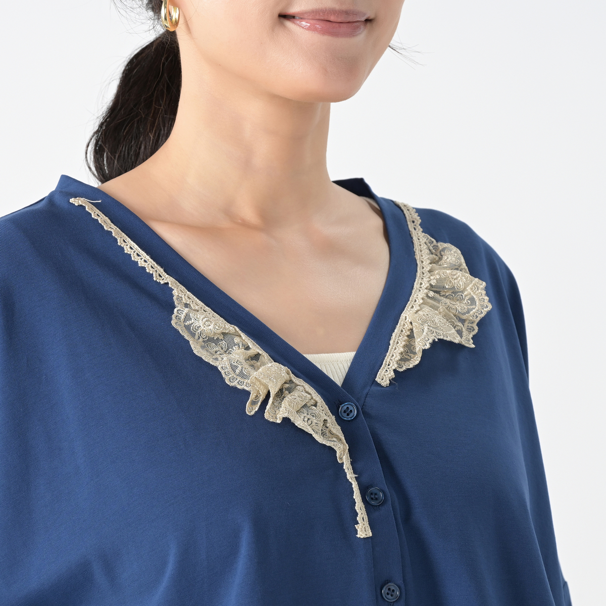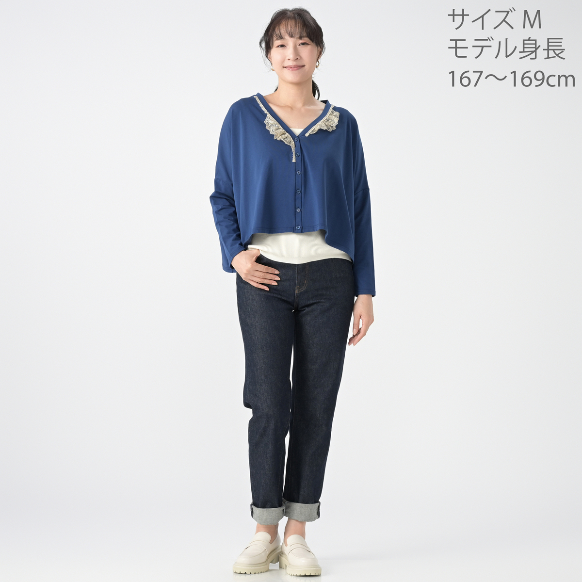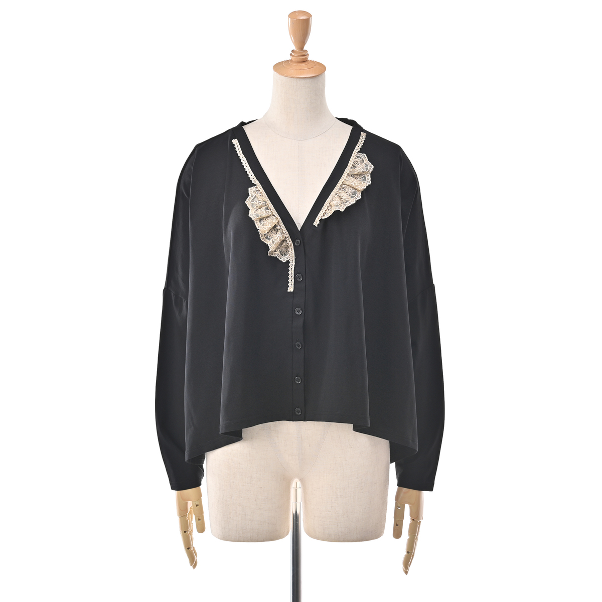 フロントの衿端にレーステープを施したVネックカーディガン。身幅のゆったりした定番のシルエットです。さっと羽織るだけで存在感のあるスタイルに仕上がります
