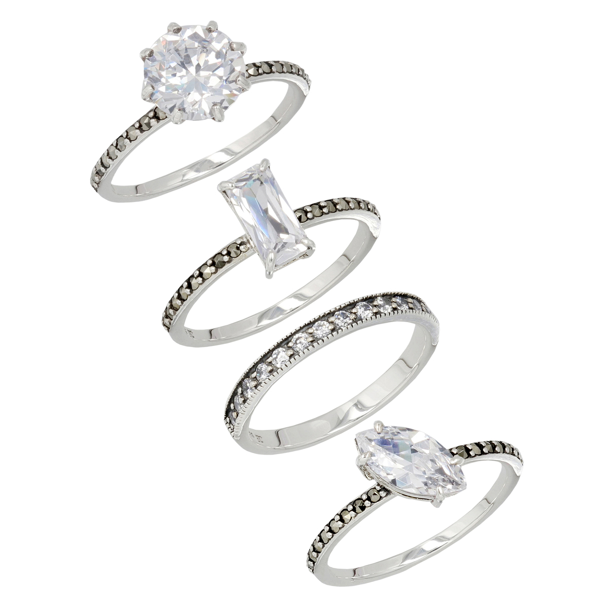 大粒のキュービックジルコニアが美しく輝く、シルバーリングの4本セット。一つひとつが主役級の存在感を放ちながら、セットで着ければ特別な華やかさを演出してくれます