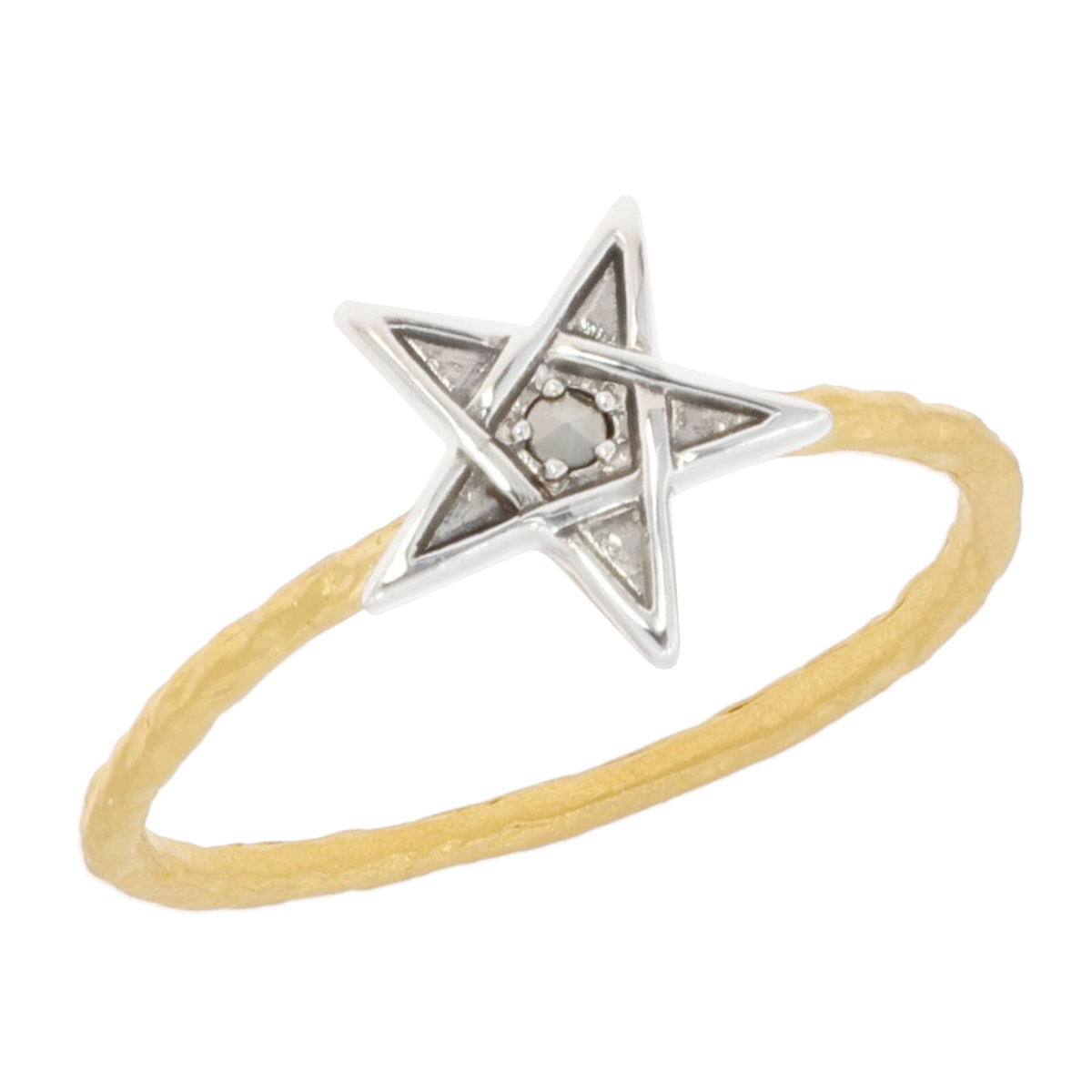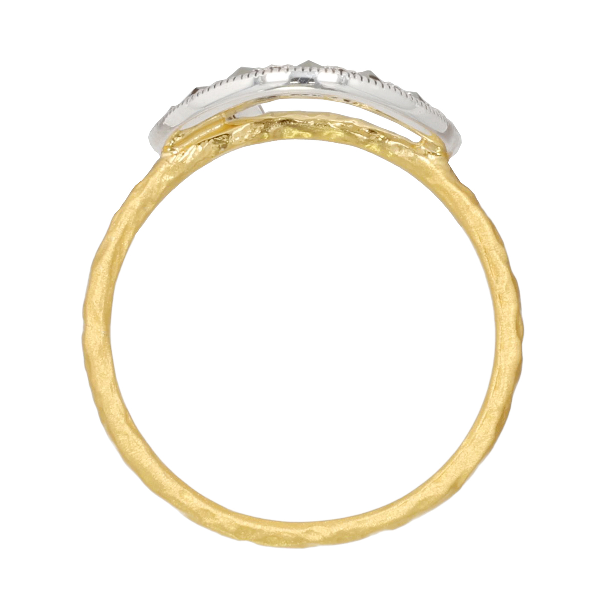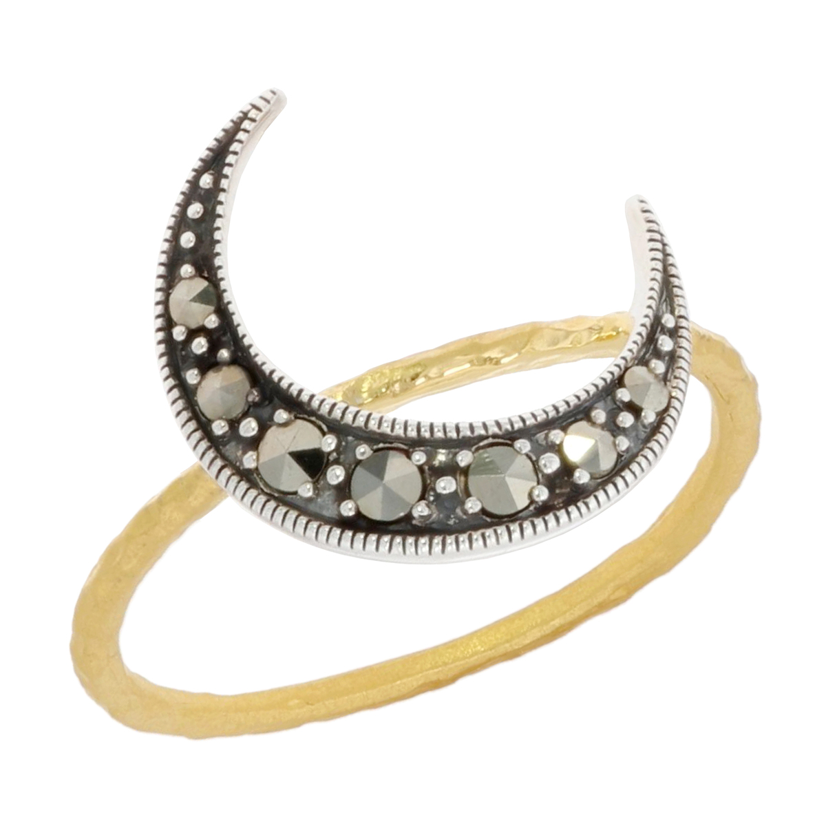 太陽・月・星をモチーフにした3本セットのリングです。SVのいぶし加工とイエローゴールドメッキの華やかな光沢の2つの風合いを楽しめる仕上げ。太陽モチーフにはダイヤモンド、月と星のモチーフにはマルカジットをセット。上品さと奥行きを感じさせるデザインに仕上がっています