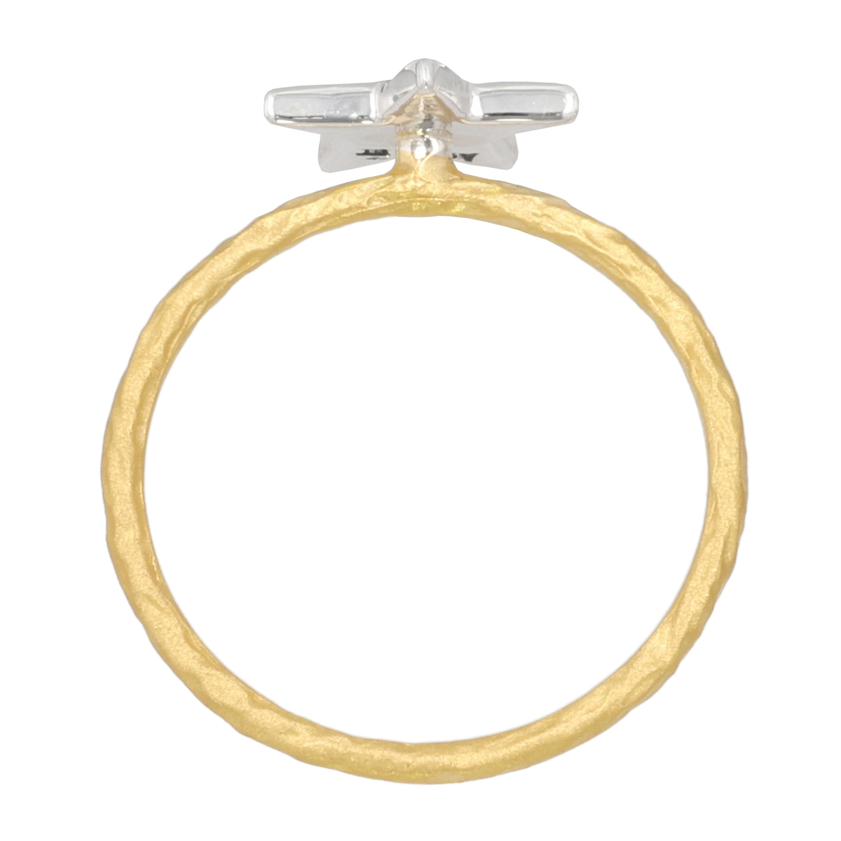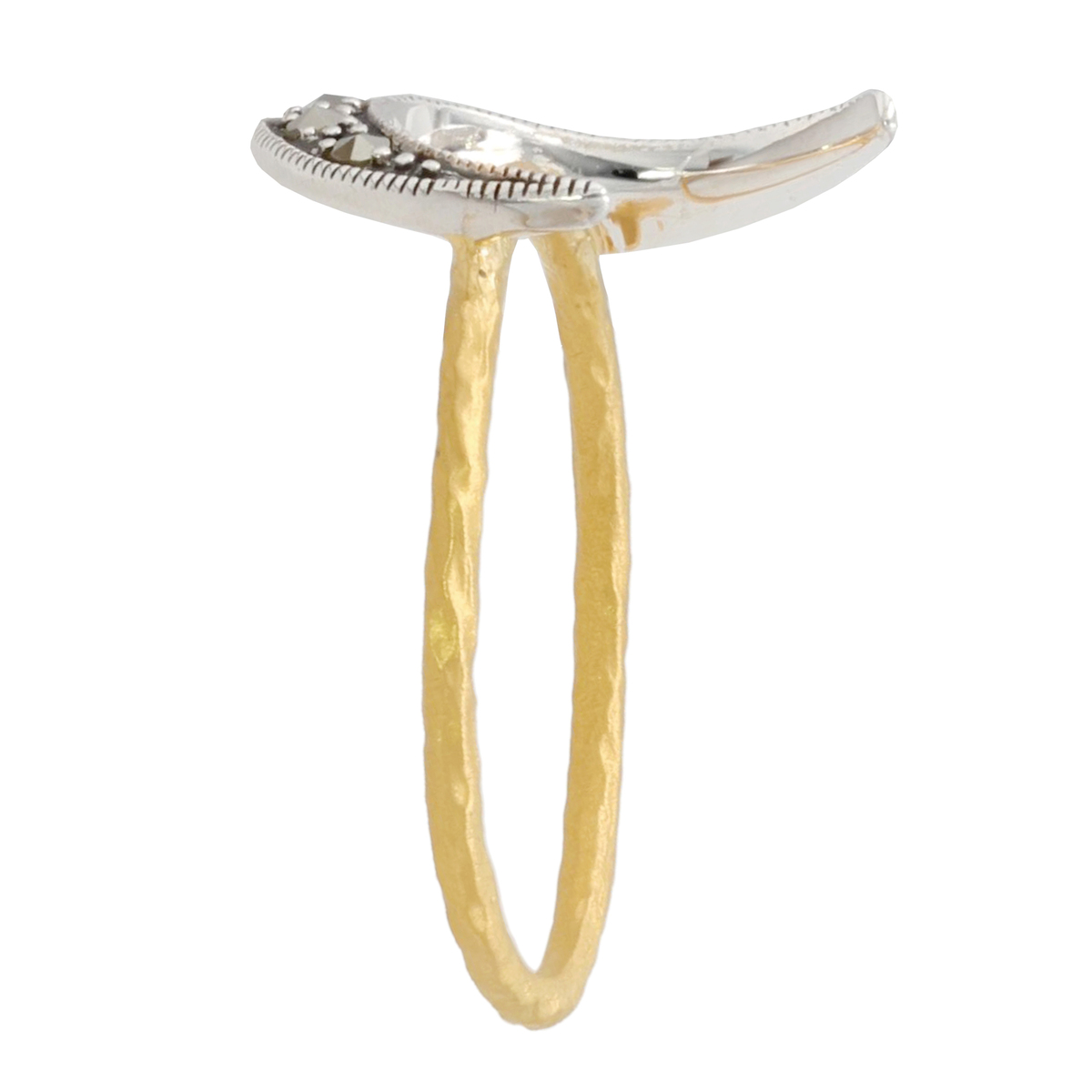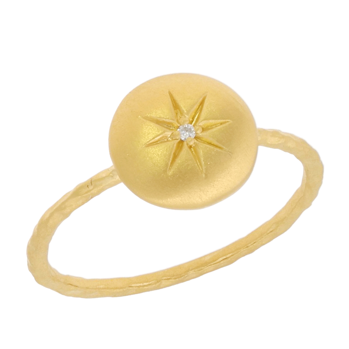太陽・月・星をモチーフにした3本セットのリングです。SVのいぶし加工とイエローゴールドメッキの華やかな光沢の2つの風合いを楽しめる仕上げ。太陽モチーフにはダイヤモンド、月と星のモチーフにはマルカジットをセット。上品さと奥行きを感じさせるデザインに仕上がっています