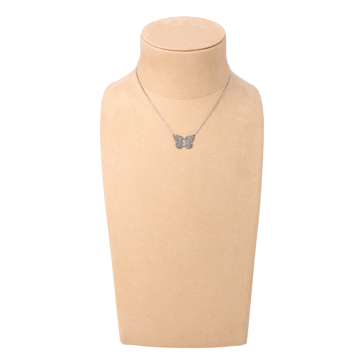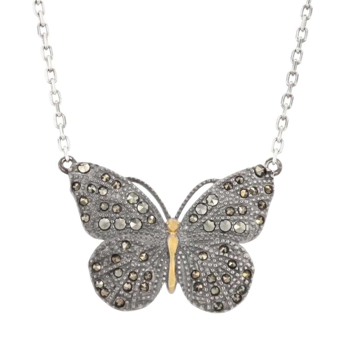 クラシカルな蝶モチーフのネックレス。羽部分には細かなマルカジットを敷き詰め、繊細なミル打ちが光を受けて優雅に輝きます