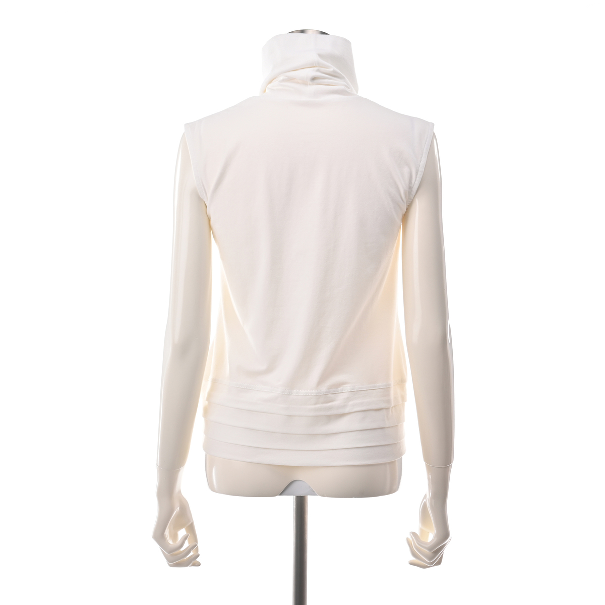 オリジナル素材、クリアーベア天竺を使用した、ハイネックスリーブレスプルオーバー。裾にはタックを施した、シンプルながらも洗練された印象です