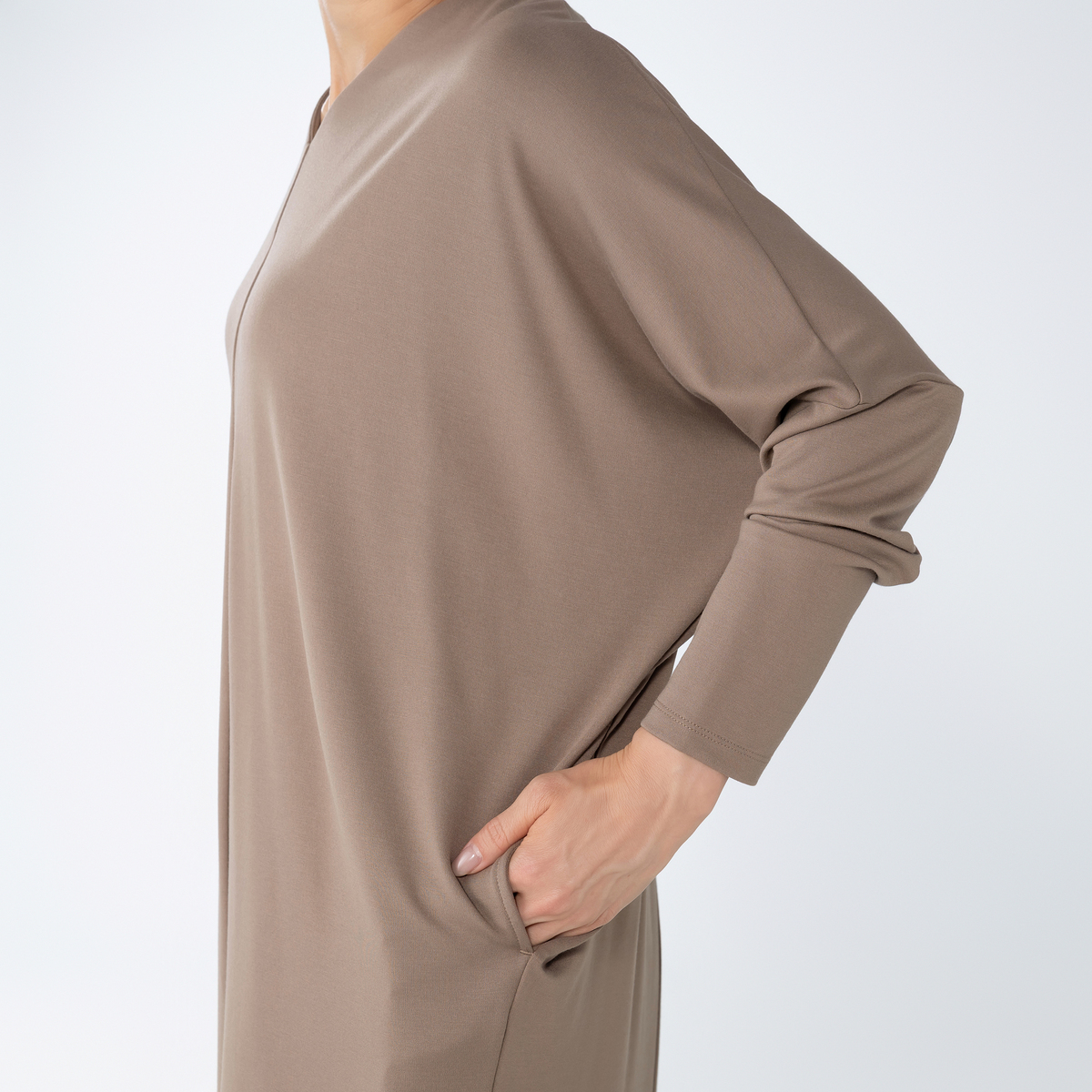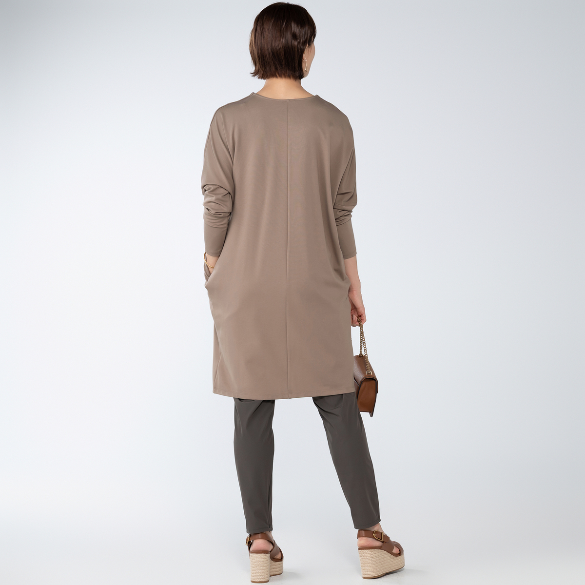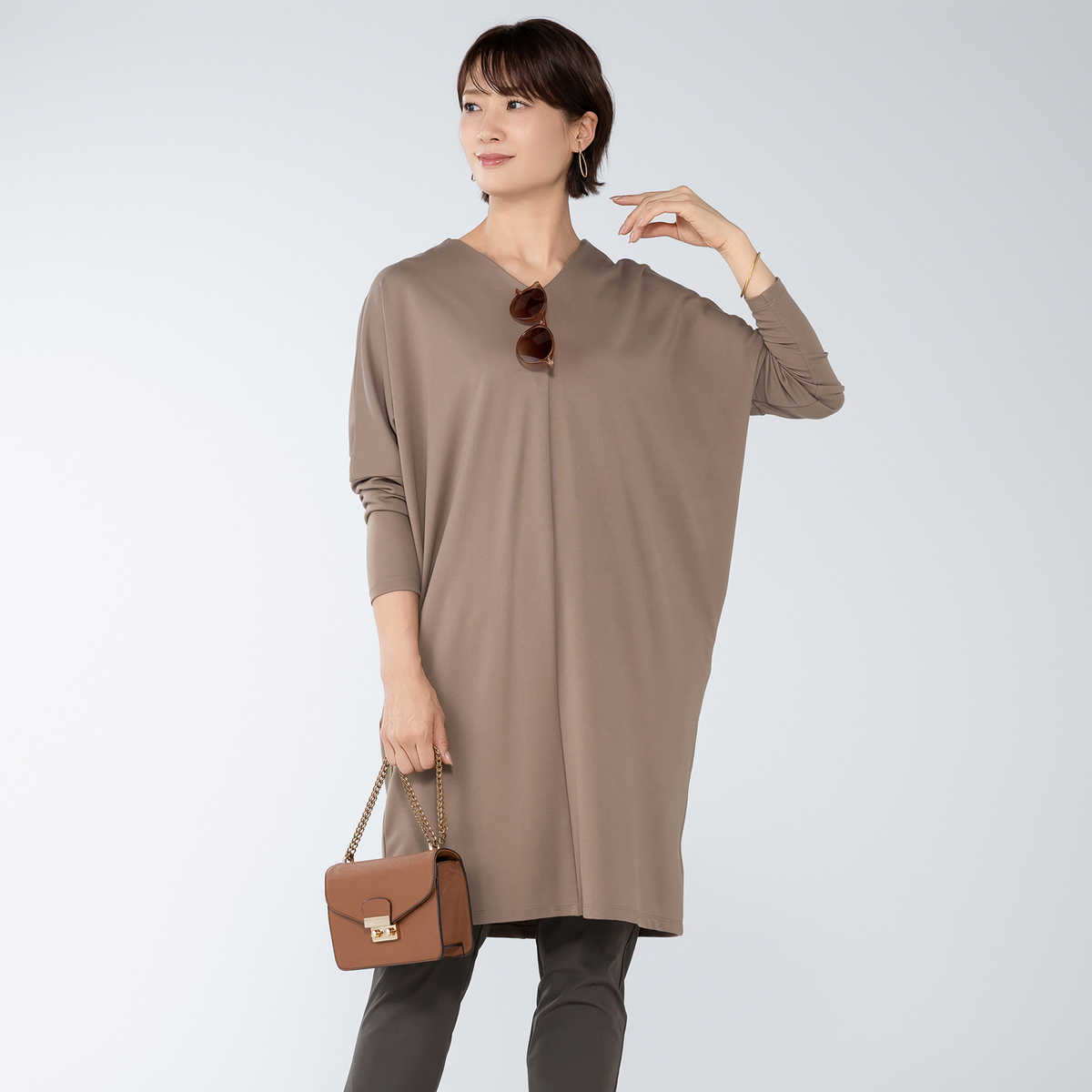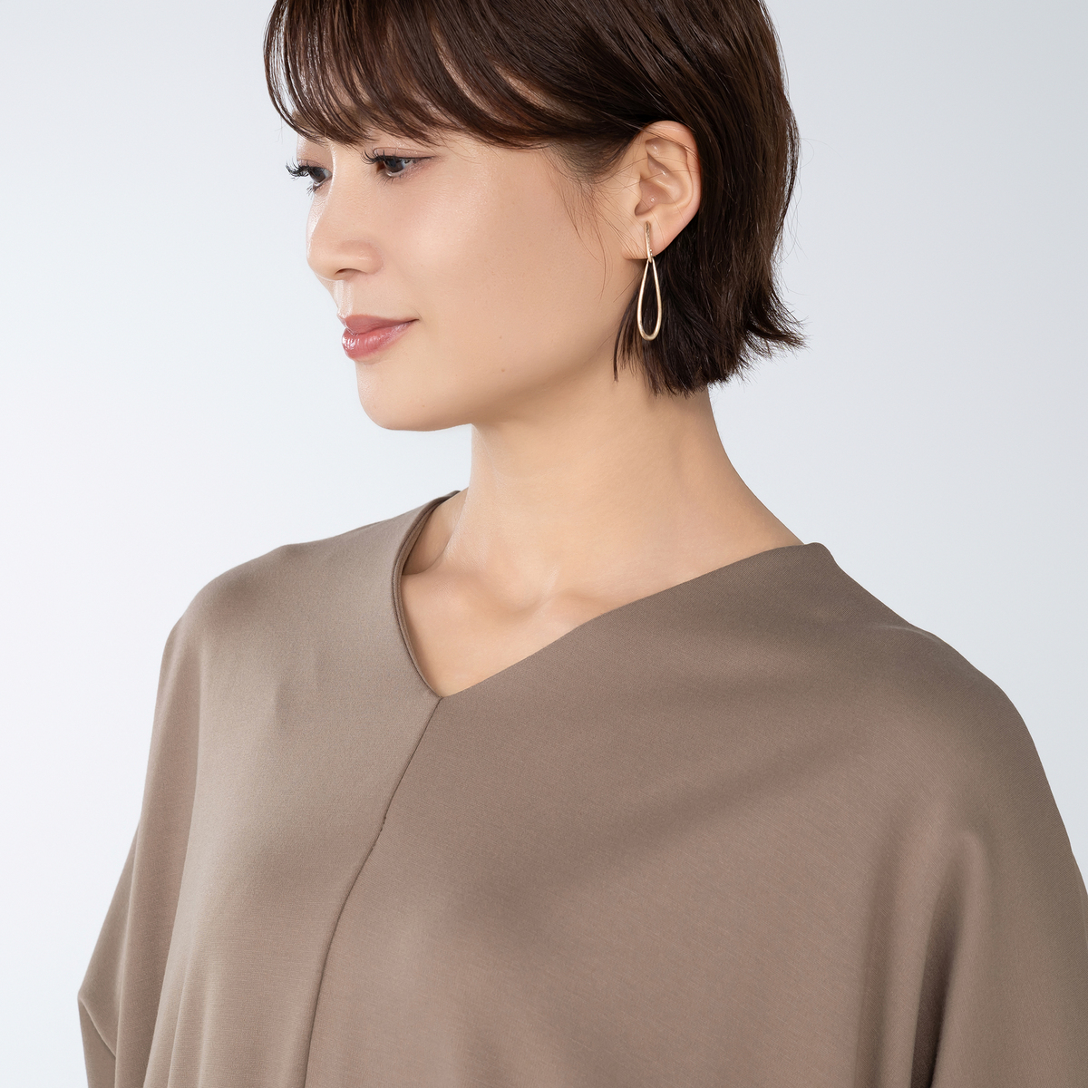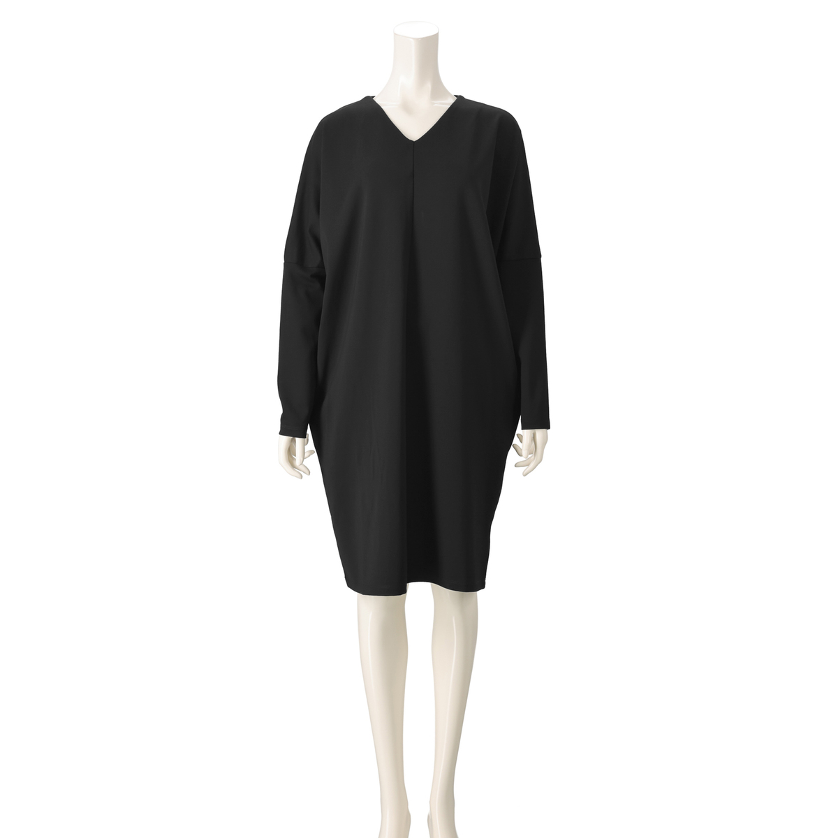 ドレープ感のある素材を使用したエレガントなワンピース。衿元のVネックが特徴のスタイリッシュなデザインです