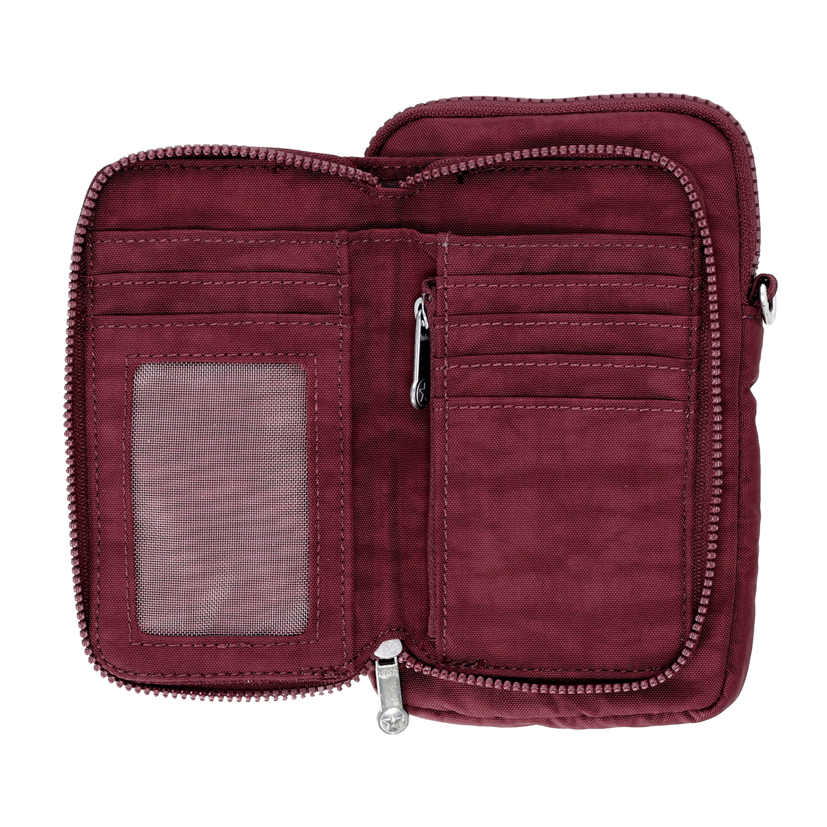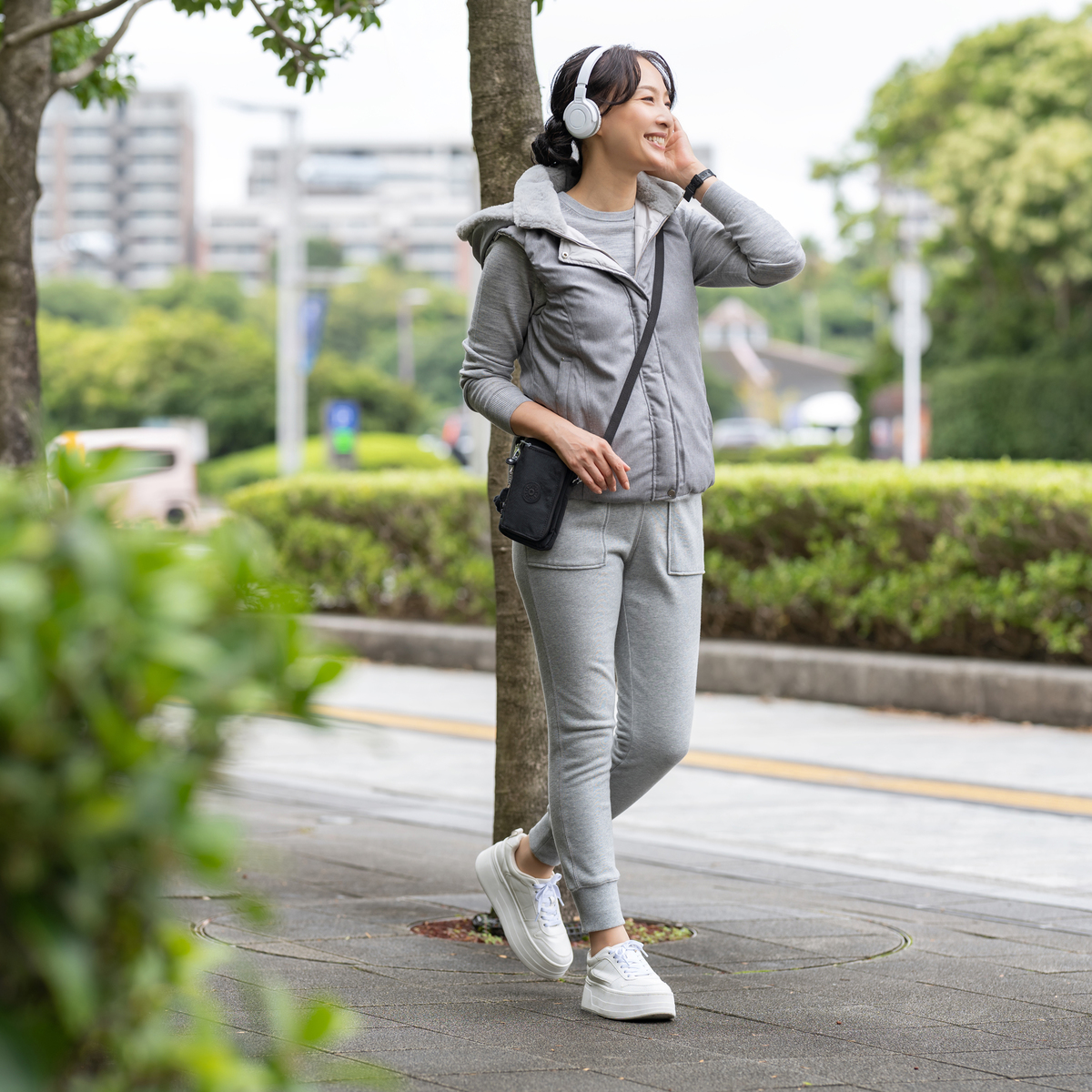 スマートフォン収納にお財布機能をプラスしたポシェットです。前面のラウンドファスナーを開けると、カードやお札、小銭の収納が可能。マチ付き収納は手帳ケースを付けたスマートフォンにも対応可能なサイズ感です。全方位クッション入りで、中身を衝撃から守ります