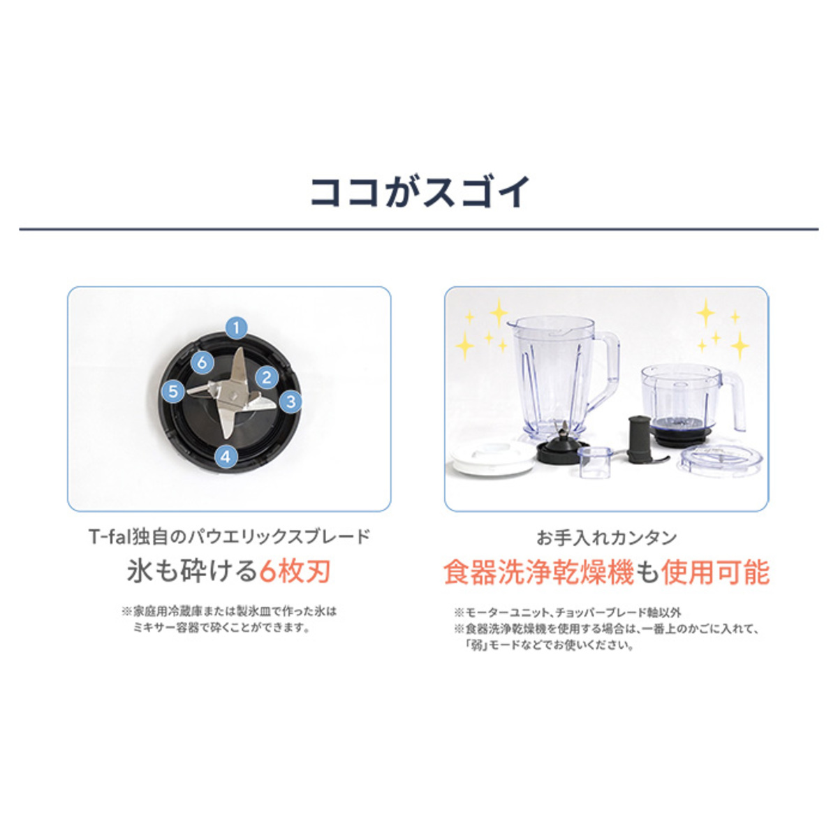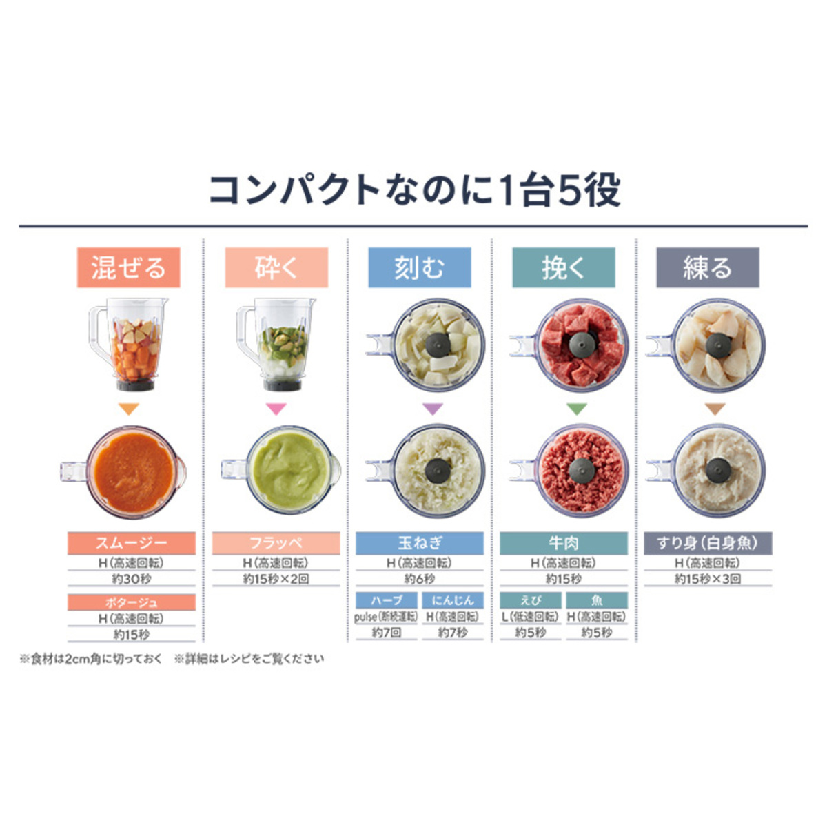 ミキサーとチョッパーを使い分けて、混ぜる・砕く・刻む・挽く・練るの5役をこなすミキサー&チョッパー(*1)です。下ごしらえなど、幅広い調理に活躍。家庭用冷蔵庫または製氷皿で作った氷なら、ミキサー容器で砕くことができます(*2)