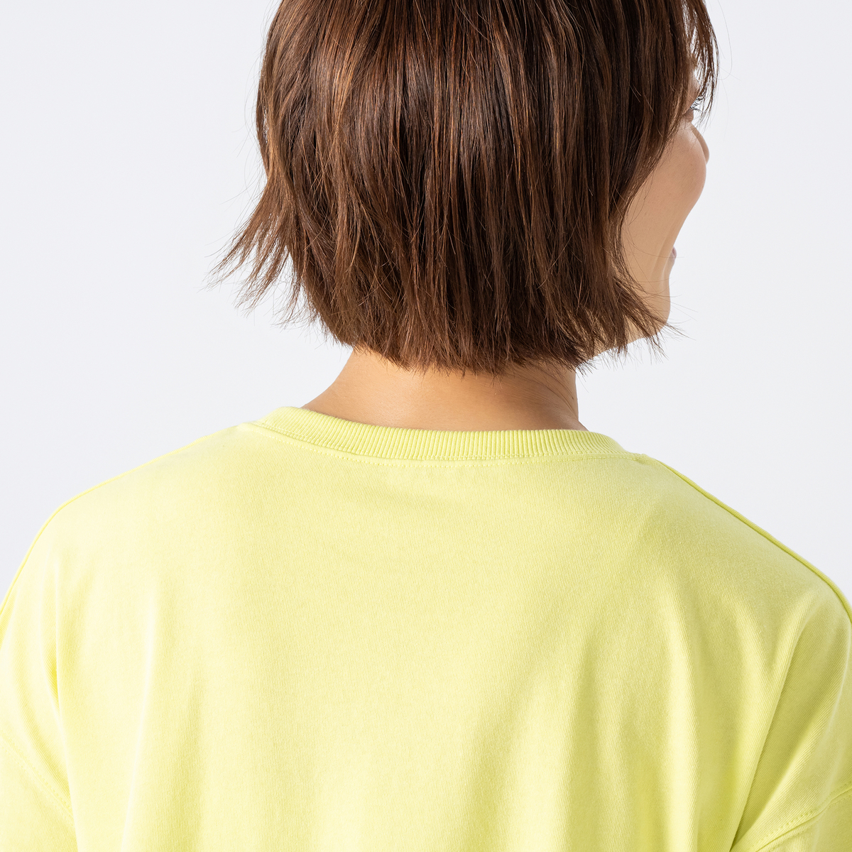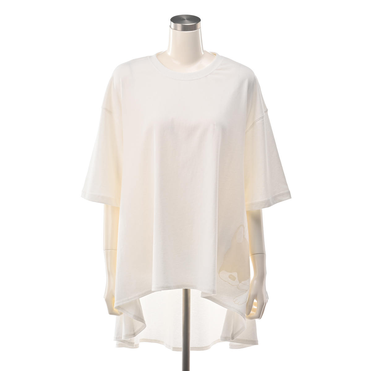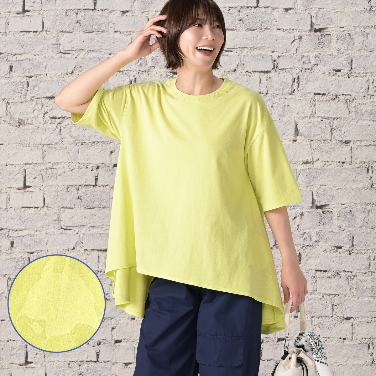 脇をまたいで入った大きなプリントがポイントのチュニックTシャツ。生地色になじむ同系色のプリントで、お眠モードのホット君がとってもかわいらしいモチーフになった、遊び心のあるデザインです
