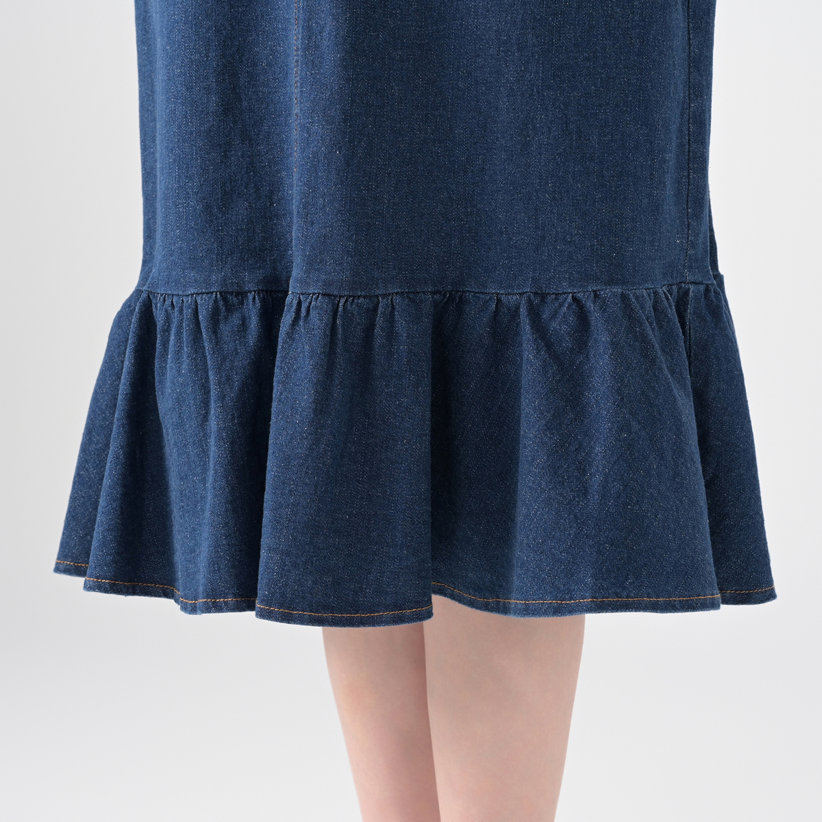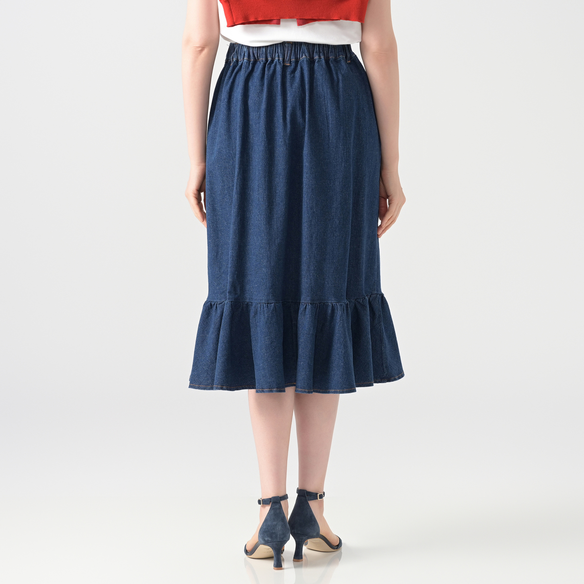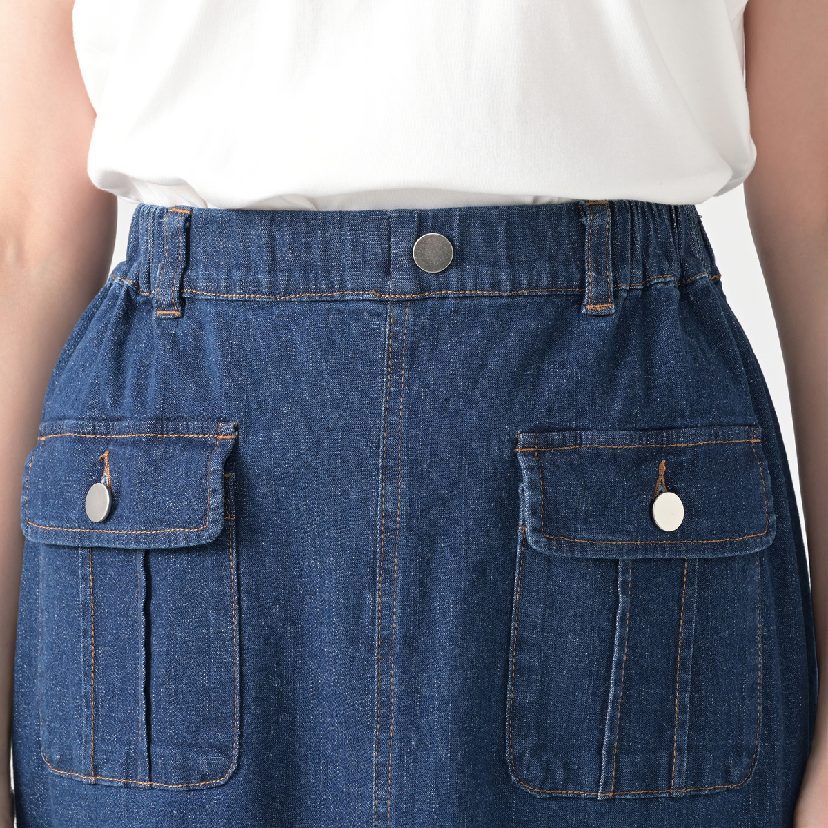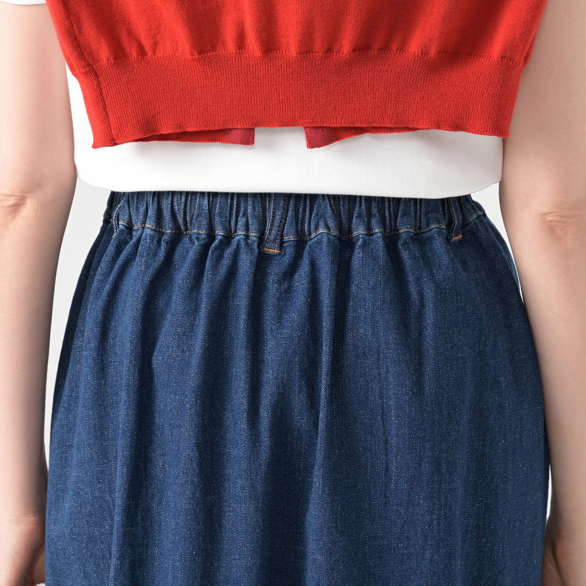 8.5オンスのライトオンスデニムで仕立てたスカート。横伸びのあるストレッチデニム素材を使用し、ムラ糸で独特のスラブ感を表現しています。製品にはバイオウォッシュ加工を施し、生地を柔らかくして肌触りを良くしつつ、UVカット機能も備えています