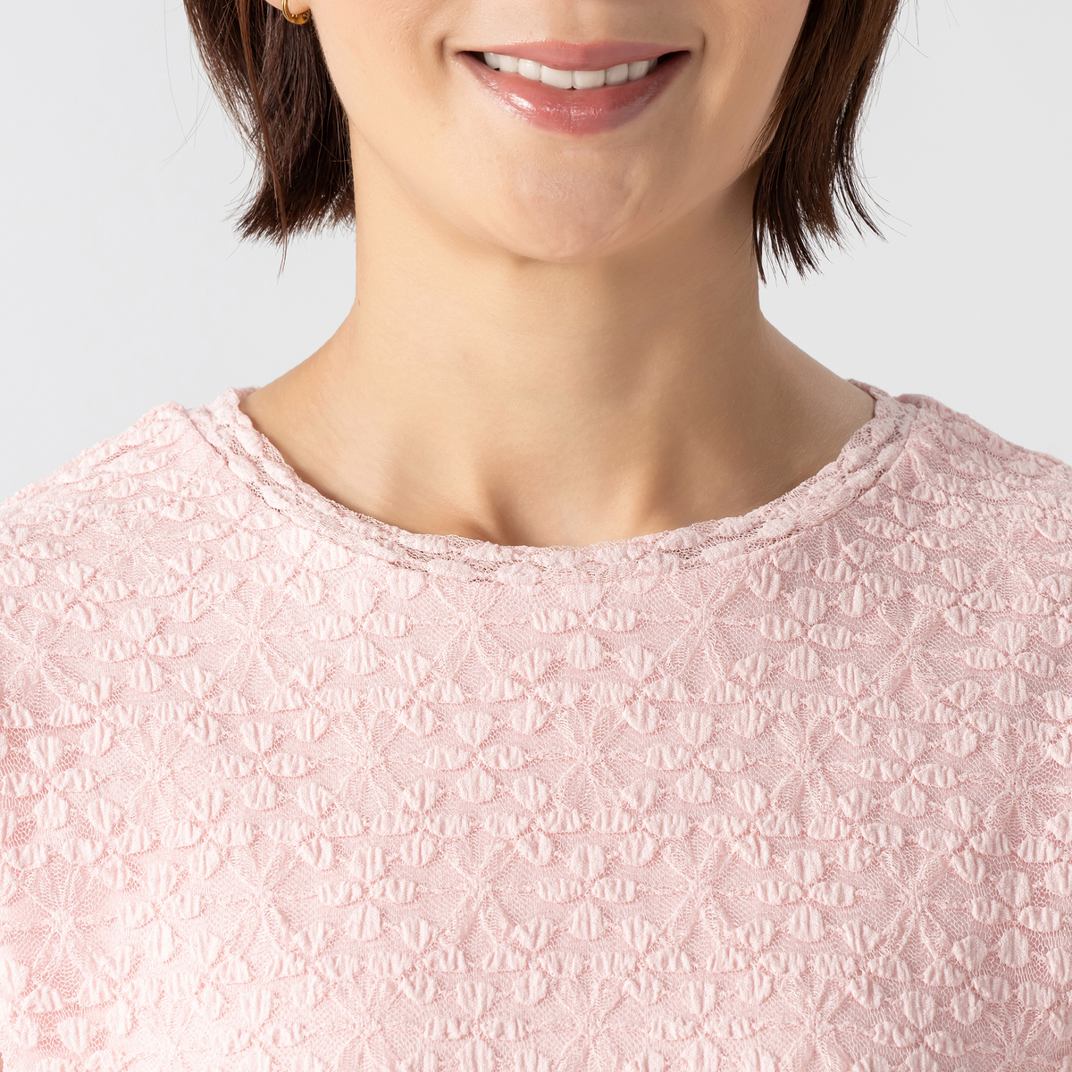ポコポコとした表面感のあるフラワー柄ストレッチレースを使用。柔らかな肌触りと伸縮性があり、身頃の裏地にはコットン天竺生地を使用しています