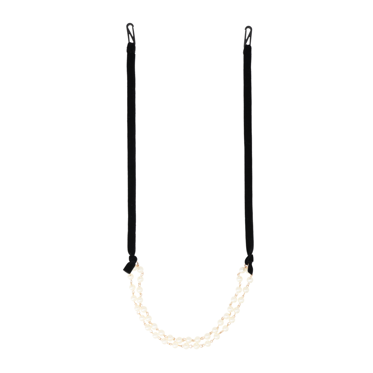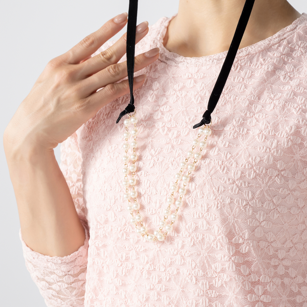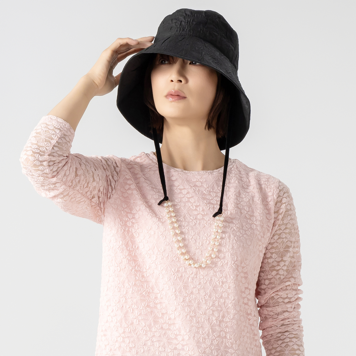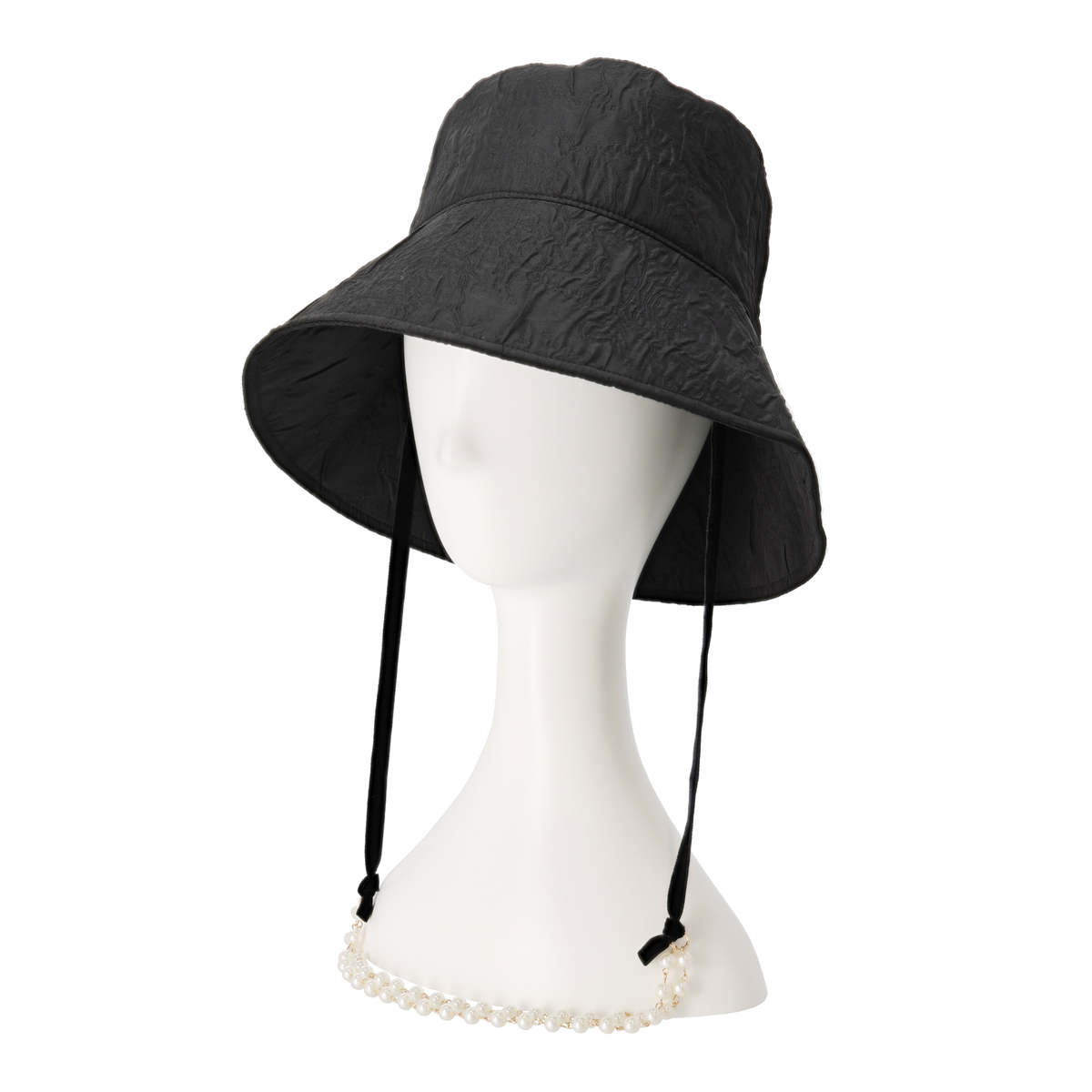 ベルべットテープにパール調の2連チェーンをあしらったアクセサリー付きのUVハット。ブリムが広いデザインで顔周りをしっかりカバーします。ベルべットテープはフックで取り外し可能です
