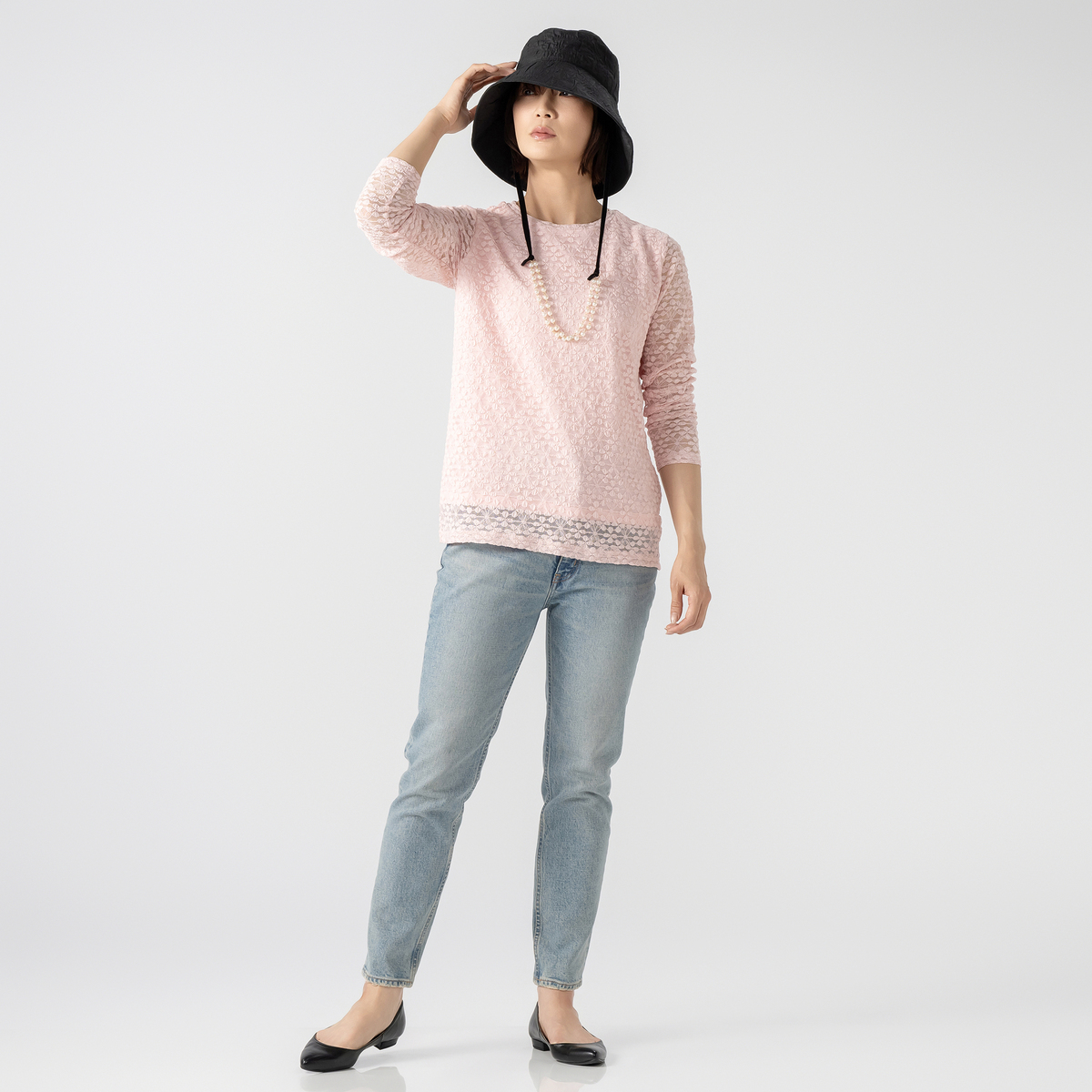 凹凸のあるジャカード生地を表側に使い、エレガントな雰囲気に仕上げました。UVカット機能を備え、外出時の紫外線対策に活躍してくれます。裏側にはさらっとしたポリエステル素材を使用しています