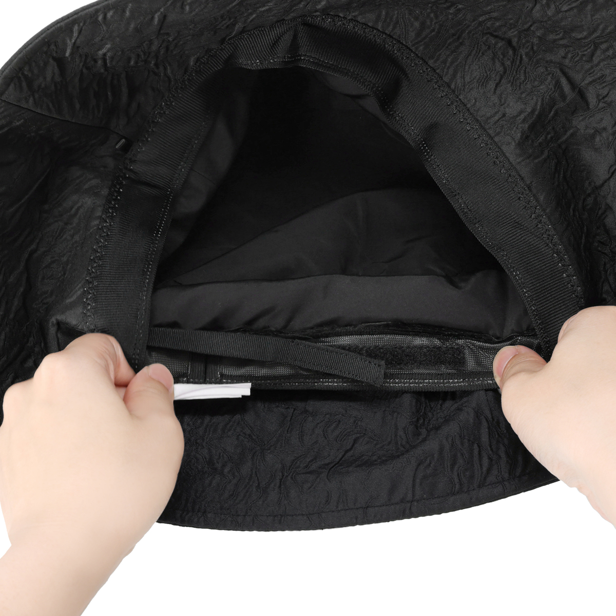 内側に面ファスナーのアジャスター付きでサイズ調整可能。バッグに折りたたんで入れられるので、持ち運びやすいのもポイントです