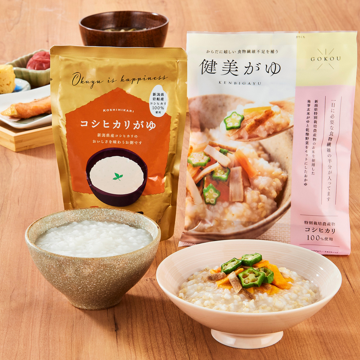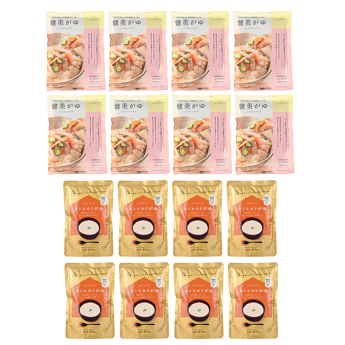 [アレルギー物質特定原材料8品目] 乳 [商品内容] ・コシヒカリ白がゆ(250g)×8パック ・健美がゆ(200g)×8パック [賞味期限] 出荷時点で賞味期限まで120日以上ある商品をお届けします [保存方法] 開封前:直射日光を避け、常温で保存してください 開封後:開封後はお早めにお召し上がりください [お召し上がり方] <コシヒカリ白がゆ> 熱湯の場合: 袋の封は切らずにそのまま沸騰したお湯の中に入れ、5分間加熱してからお召し上がりください 電子レンジの場合: 電子レンジであたためる場合は、必ず袋から出し深めの皿に開け、ラップをかけてから加熱してください(500Wの場合約2分) ・袋のままでの電子レンジ不可 ・電子レンジの機種、ワット数などにより加熱時間が異なる場合があります <健美がゆ> 1.外袋からおかゆとお野菜を出します 2.おかゆの袋を開封して中身を器にうつし、ラップをかけて電子レンジで温めます(500W 約2分) ※電子レンジの機種、ワット数などにより加熱時間が異なる場合があります ※加熱直後は熱くなっておりますのでご注意ください 3.温めたおかゆにお野菜を混ぜてお召し上がりください [注意事項] <コシヒカリ白がゆ> ※熱湯で温める場合、やけどにご注意ください ※加熱直後は熱くなっておりますので、ご注意ください ※開封時に袋の口で手を切らないようにご注意ください ※この製品はレトルトパウチ食品です ※同じ製造工場で「大豆」を使用した製品を製造しております <健美がゆ> ※本製品の製造ラインでは「大豆」を使用した製品も製造しております ※この製品はレトルトパウチ食品です [原料原産地] うるち米(新潟県産コシヒカリ) [原産国] 日本 [原材料] <コシヒカリ白がゆ> うるち米(新潟県産コシヒカリ) <健美がゆ> かゆ: うるち米(新潟県産コシヒカリ)、還元難消化性デキストリン 乾燥野菜: 乾燥ごぼう、乾燥人参、乾燥オクラ/ソルビトール、酸化防止剤(V.E、V.C、ヒマワリ種子抽出物)、クエン酸、(一部に乳成分を含む)