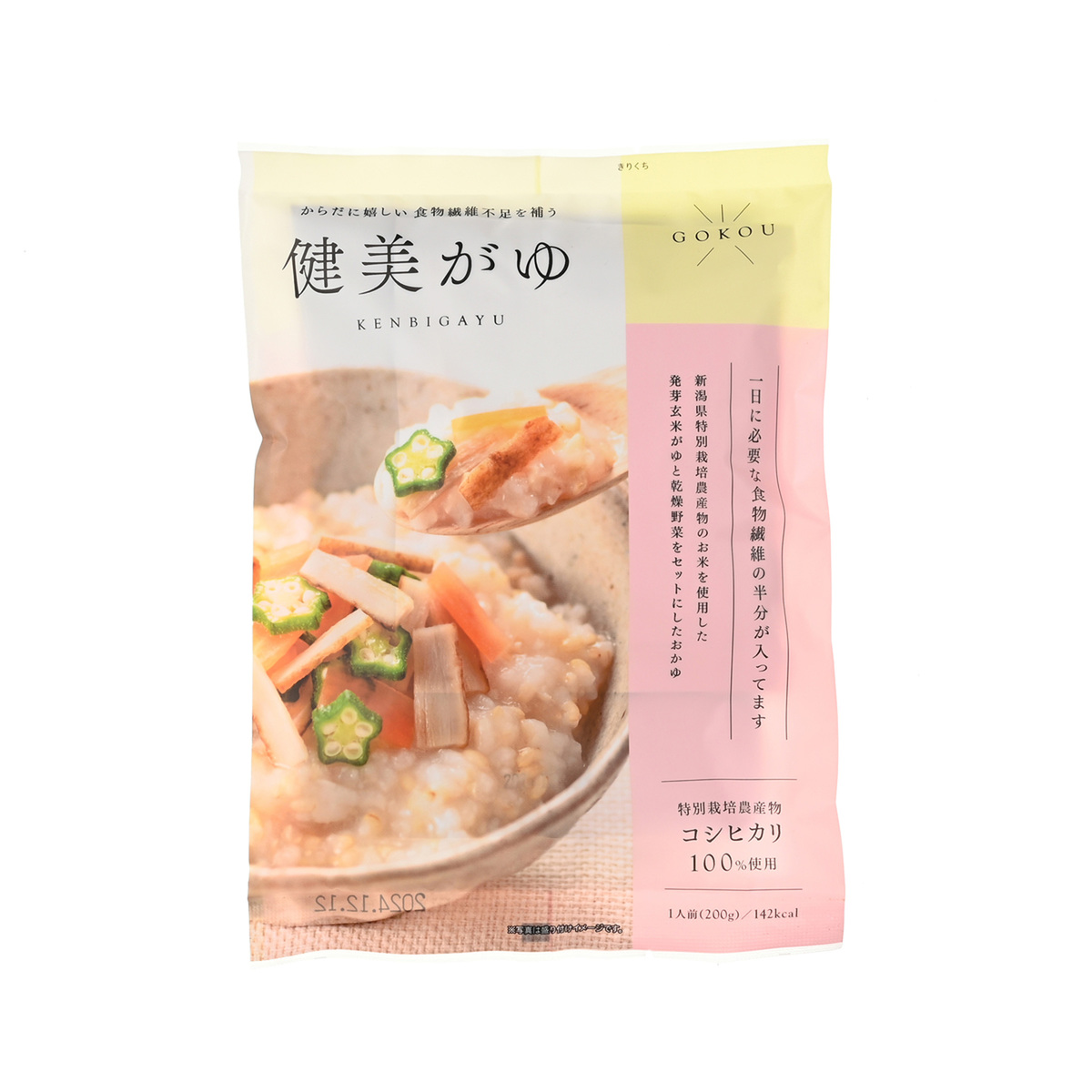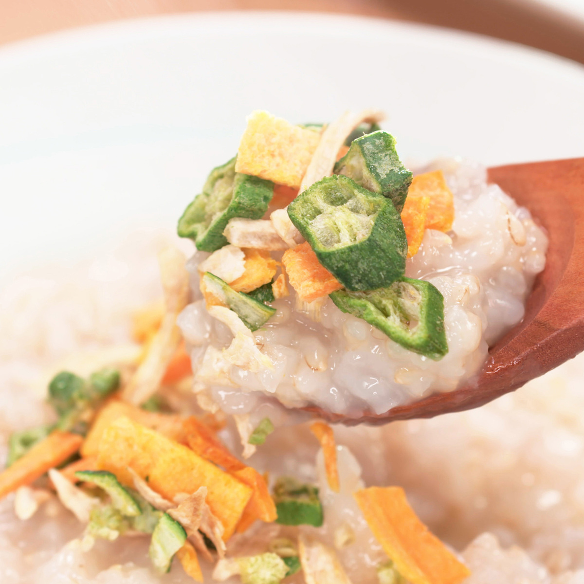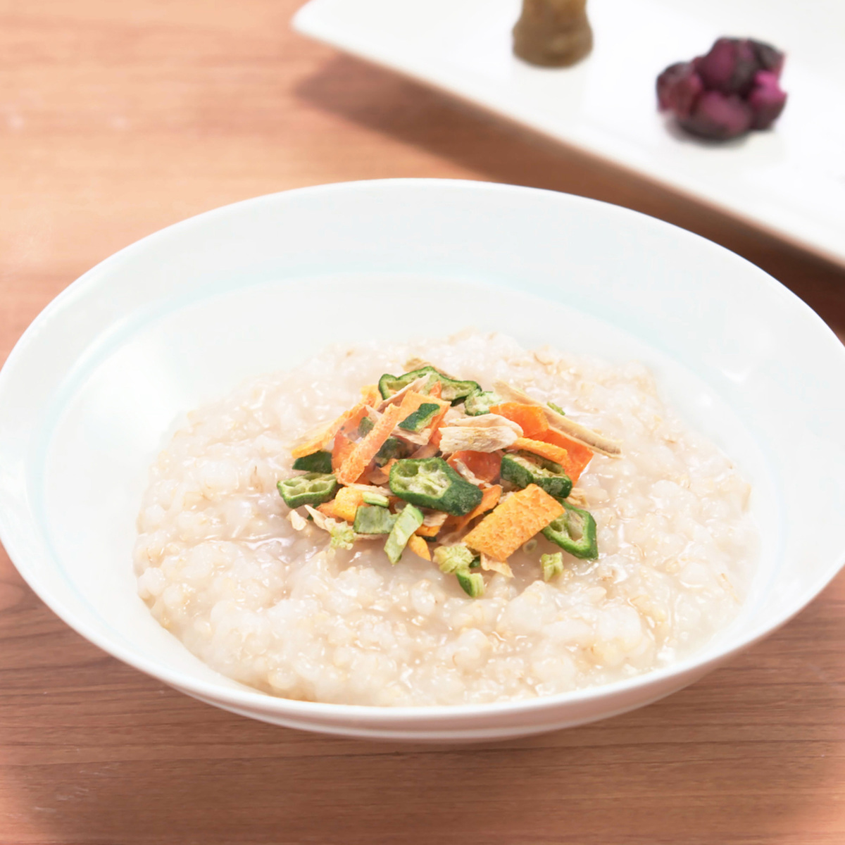 甘味、旨味が豊富で栄養価が高いと言われる発芽玄米を使用。発芽により柔らかくなるので、白米と変わらない食べやすさです(個人差あり)。乾燥ごぼう、乾燥人参、乾燥オクラを別袋で付けて、後からおかゆに入れる仕様にしました