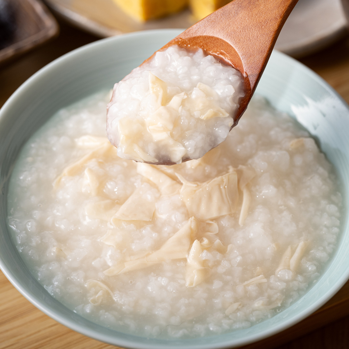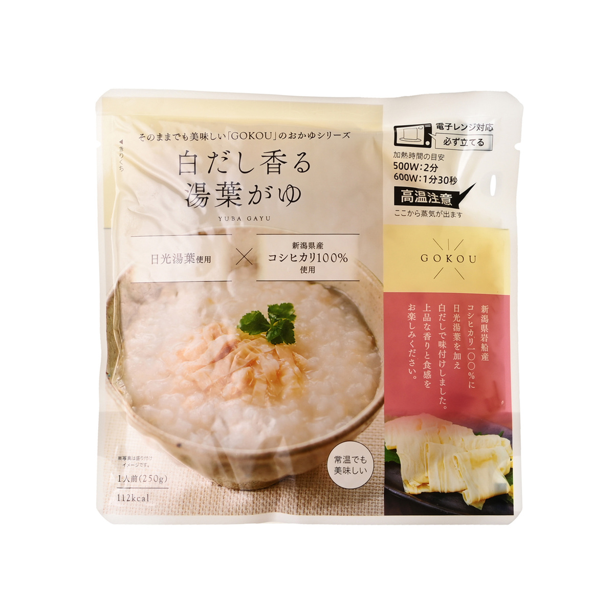 使用しているお米は新潟県岩船産コシヒカリ100%。日光で製造された湯葉を使用し、白だしをベースに味付けをしたおかゆです。上品なだしの香りと湯葉の食感が楽しめます