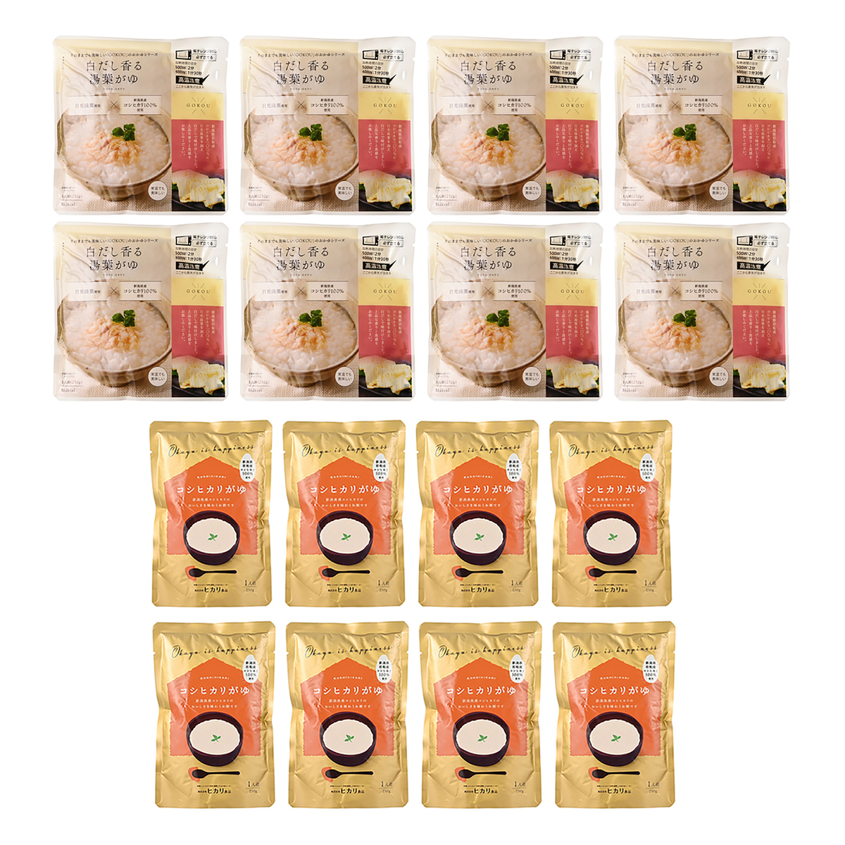 [アレルギー物質特定原材料8品目] 小麦 [商品内容] ・コシヒカリ白がゆ(250g)×8パック ・湯葉がゆ(250g)×8パック [賞味期限] 出荷時点で賞味期限まで120日以上ある商品をお届けします [保存方法] 開封前:直射日光を避け、常温で保存してください 開封後:開封後はお早めにお召し上がりください [お召し上がり方] 熱湯の場合: 袋の封は切らずにそのままふっとうしたお湯の中に入れ、5分間加熱してからお召し上がりください 電子レンジの場合: 電子レンジであたためる場合は、必ず袋から出し深めの皿に開け、ラップをかけてから加熱してください(500Wの場合約2分) ・袋のままでの電子レンジ不可 ・電子レンジの機種、ワット数などにより加熱時間が異なる場合があります [注意事項] ※熱湯で温める場合、やけどにご注意ください ※加熱直後は熱くなっておりますので、ご注意ください ※開封時に袋の口で手を切らないようにご注意ください ※この製品はレトルトパウチ食品です ※同じ製造工場で「大豆」を使用した製品を製造しております [原料原産地] うるち米(新潟県産コシヒカリ) [原産国] 日本 [原材料] コシヒカリがゆ: うるち米(新潟県産コシヒカリ) 湯葉がゆ: うるち米(新潟県産コシヒカリ)、湯葉(大豆) 、食塩、砂糖、しょうゆ、かつおぶし(かつお、そうだかつお)、にぼし、かつお酵素分解物、昆布/アルコール、調味料(アミノ酸等)、(一部に小麦・大豆を含む)