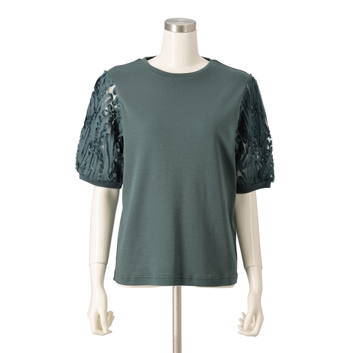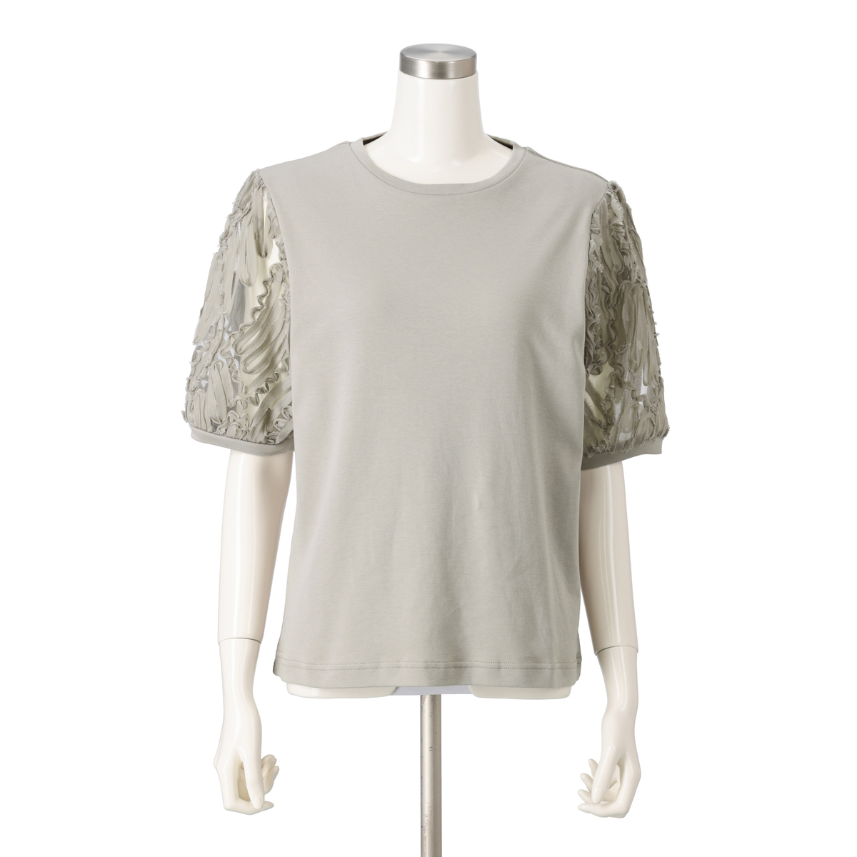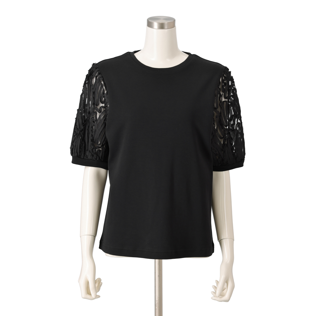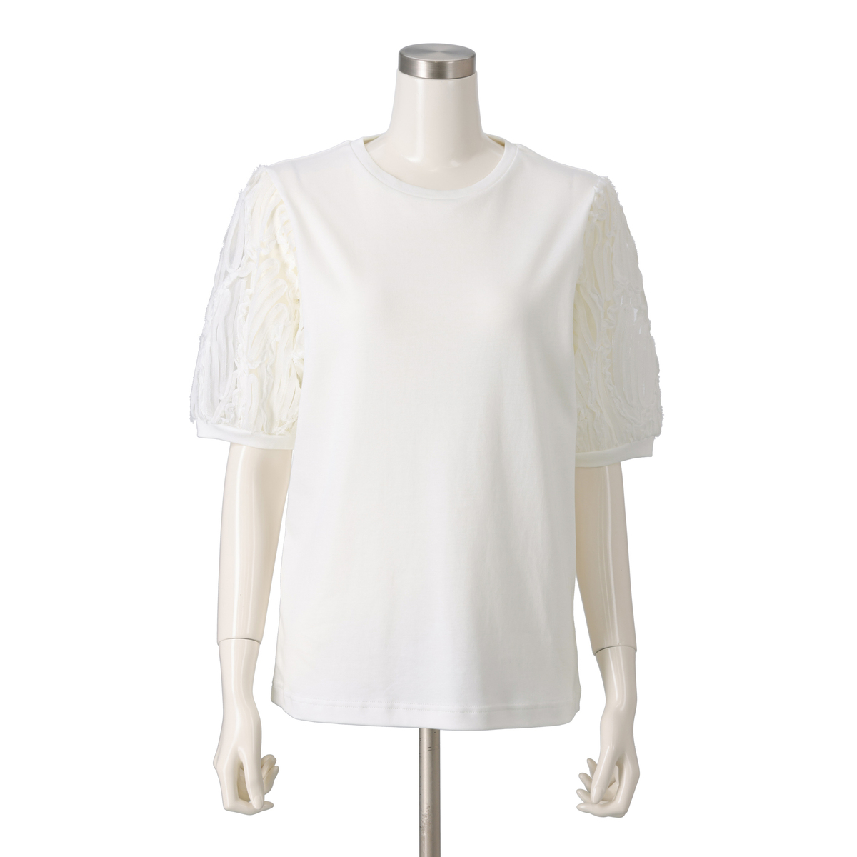 スーピマコットンを100%使用したスムース素材のプルオーバー。ふんわりとした袖には華やかなテープ刺繍を施した別布を使用しています