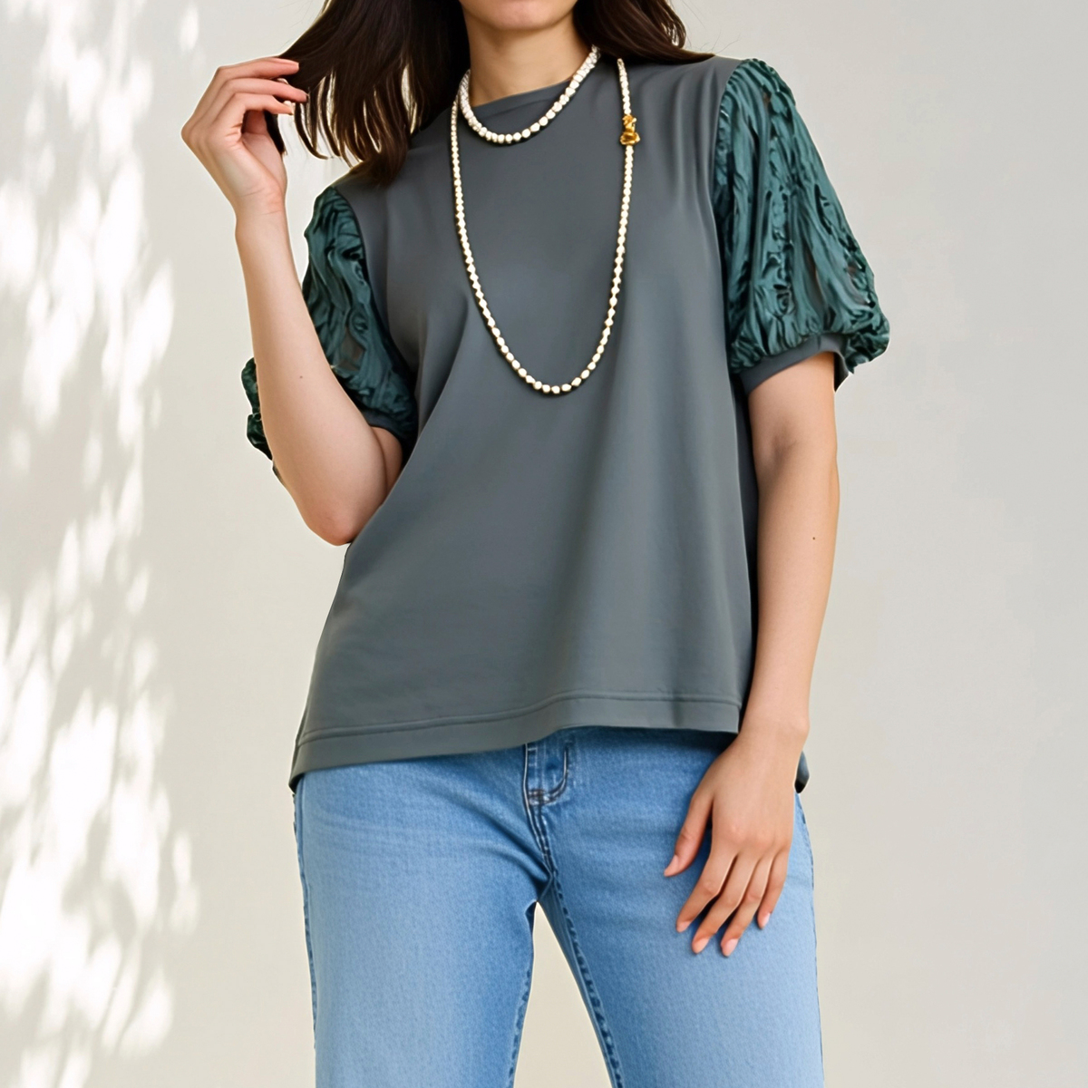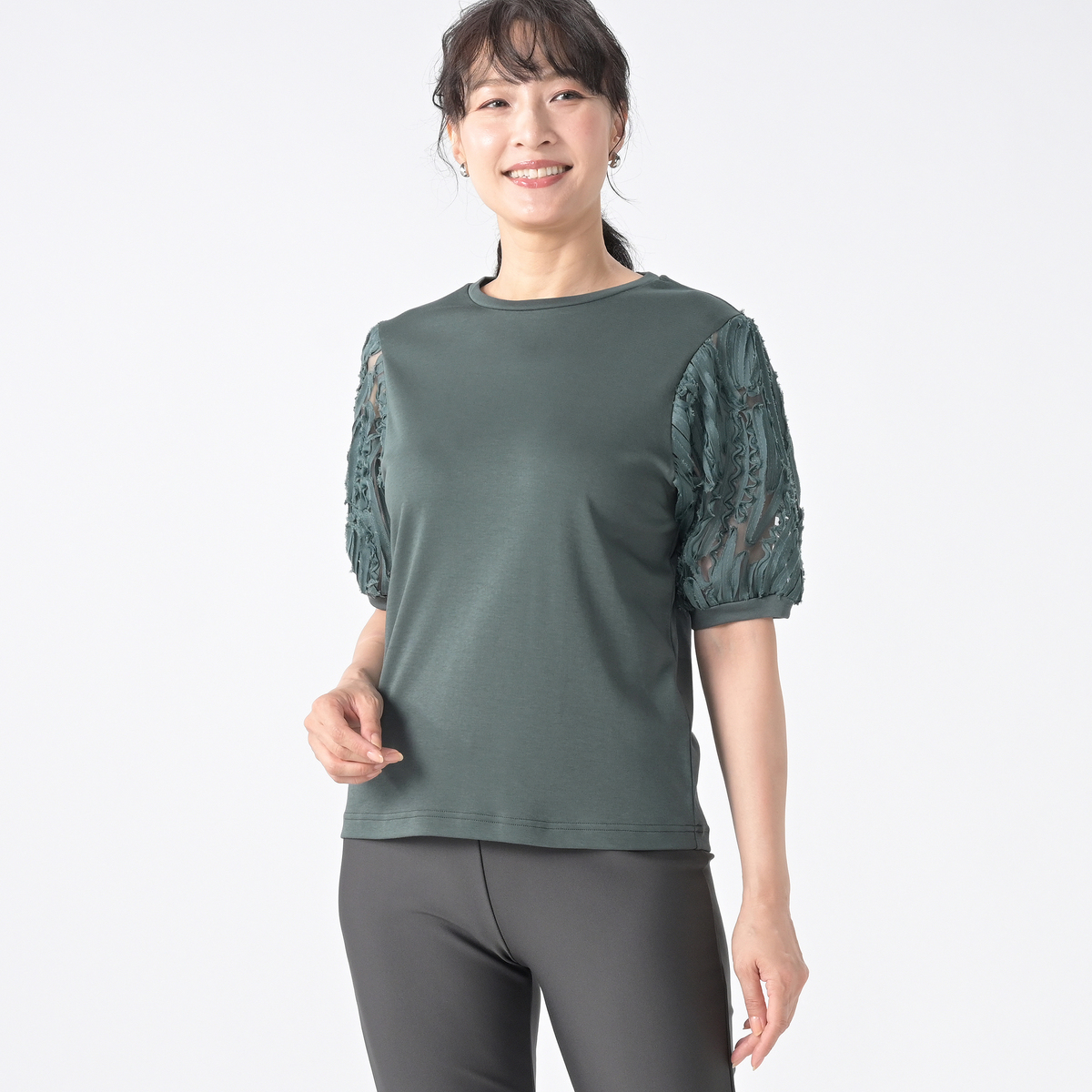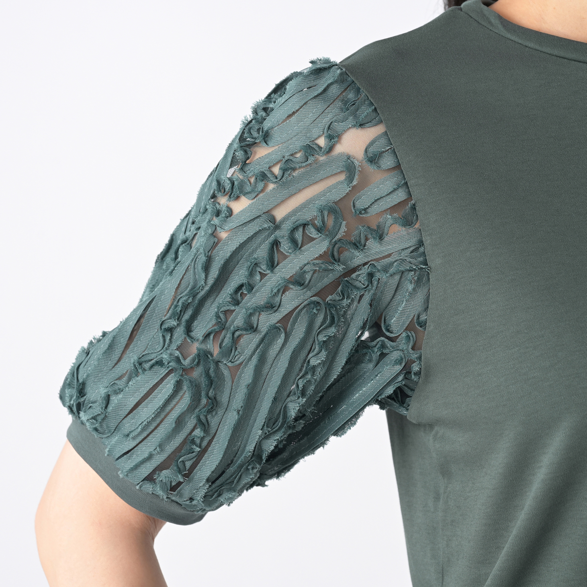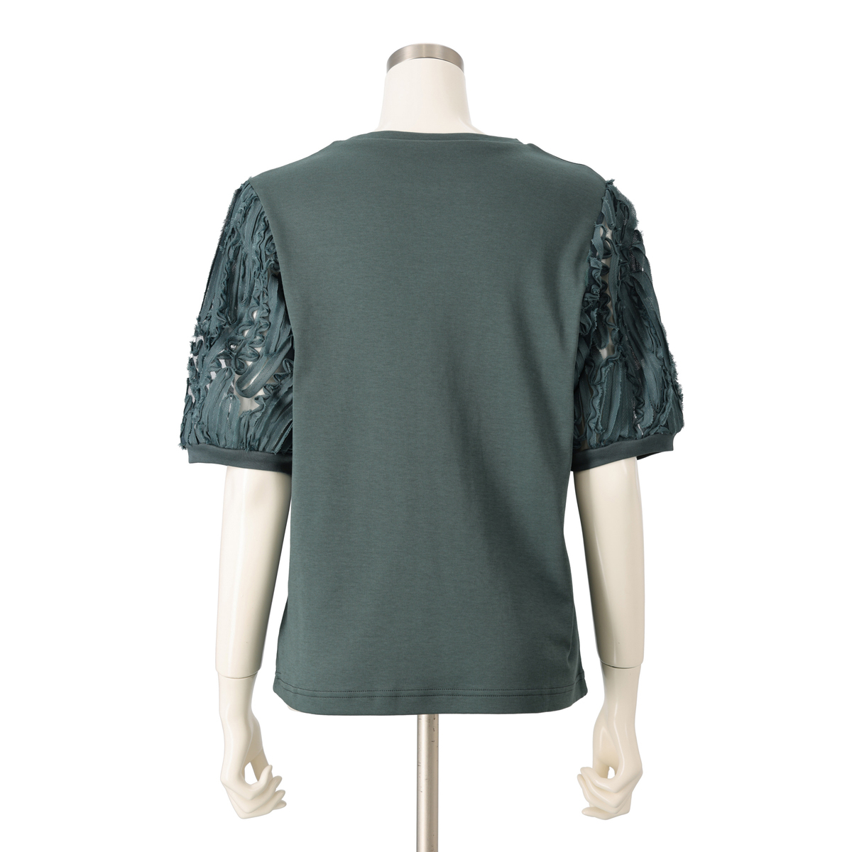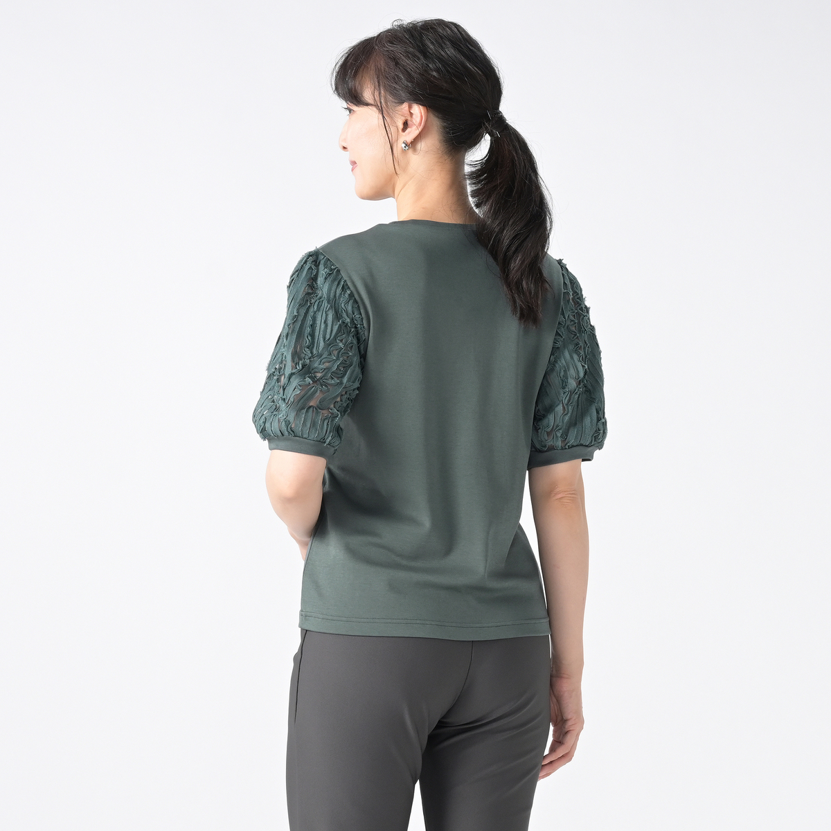 スーピマコットンを100%使用したスムース素材のプルオーバー。ふんわりとした袖には華やかなテープ刺繍を施した別布を使用しています