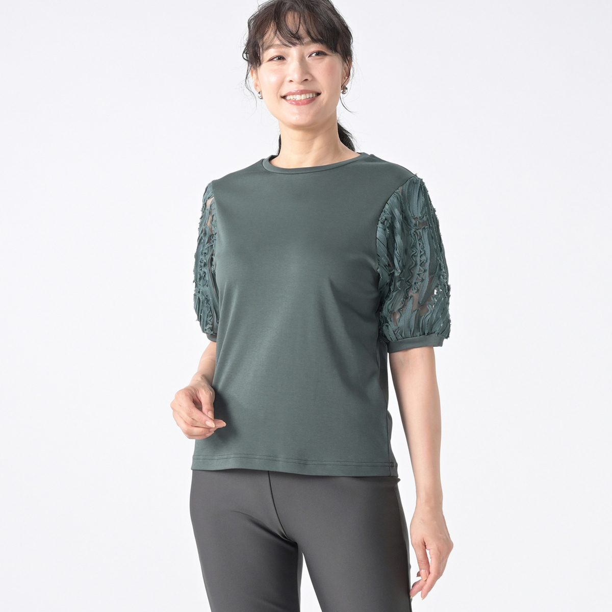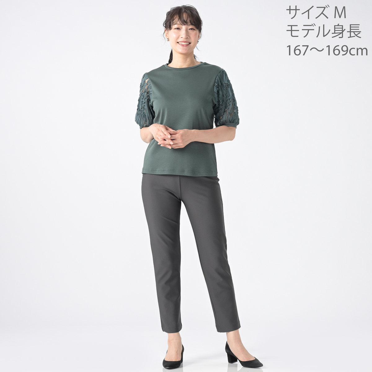 本体のスムース素材にはシルケット加工を施し、シルクのような光沢感をプラス。程よい肉感で体のラインを拾いにくいのもポイントです