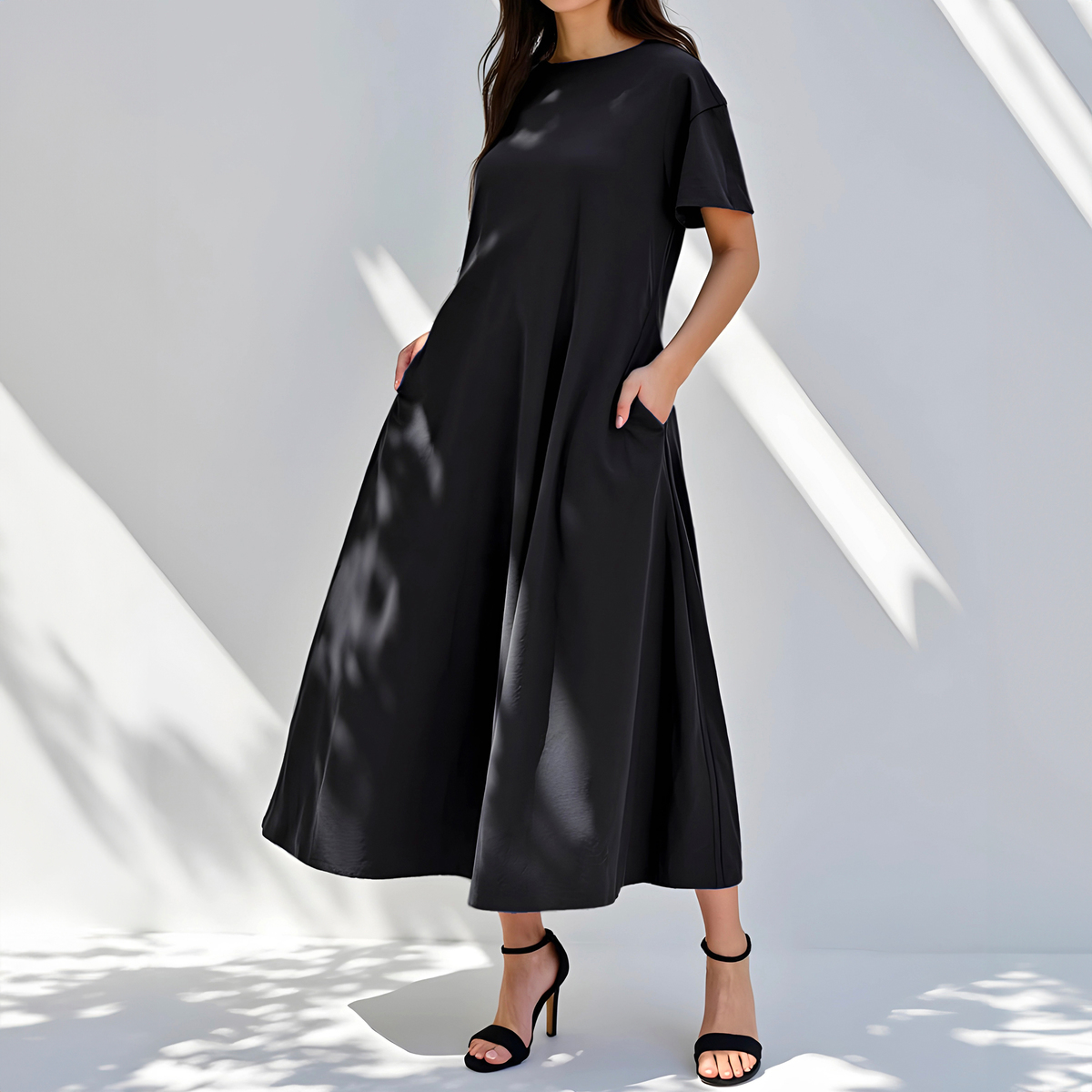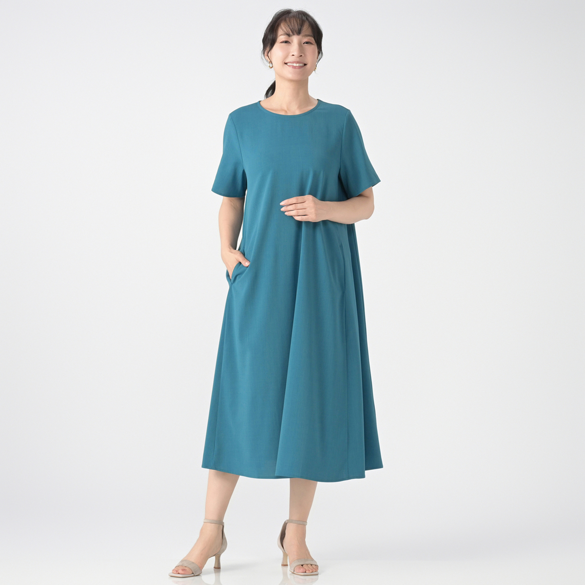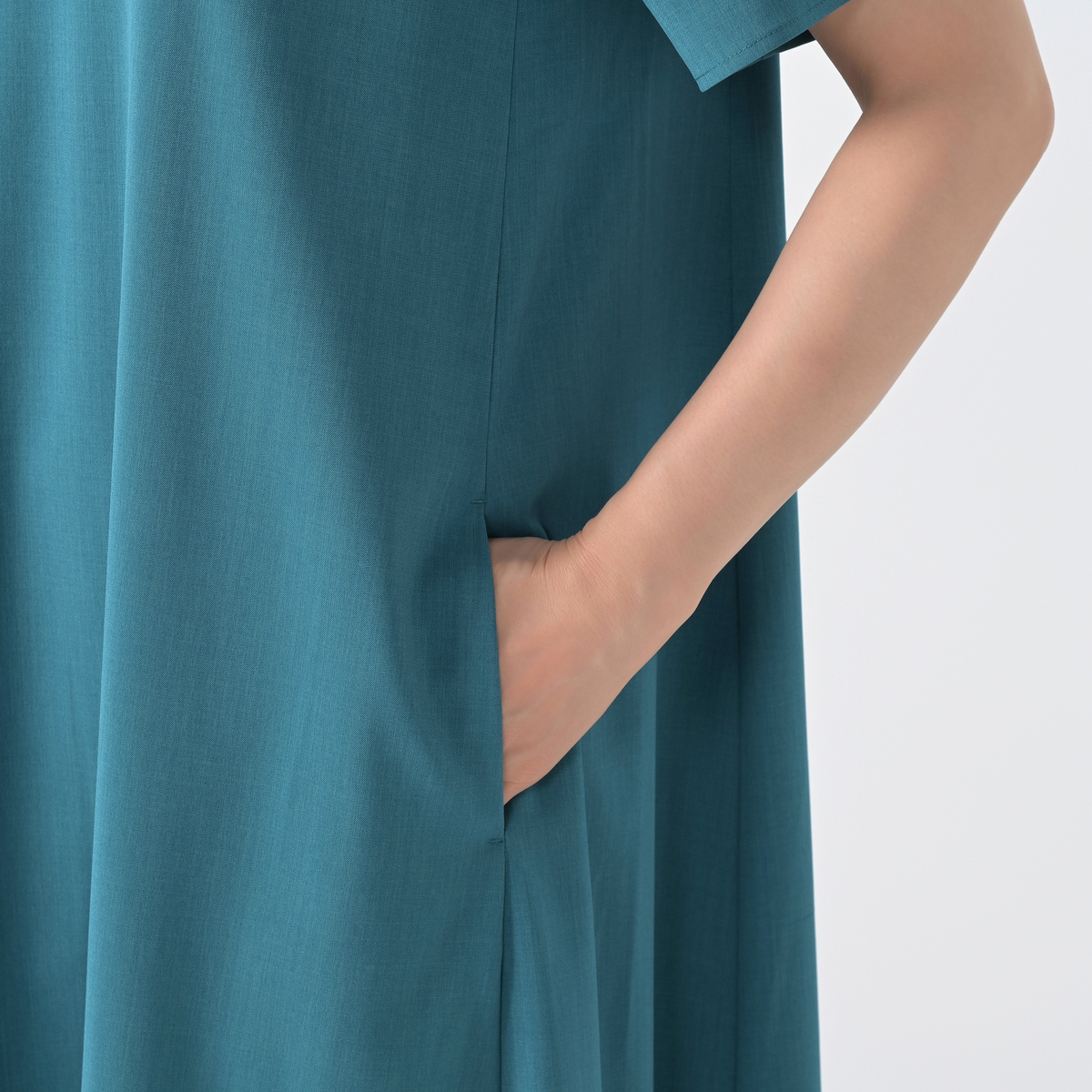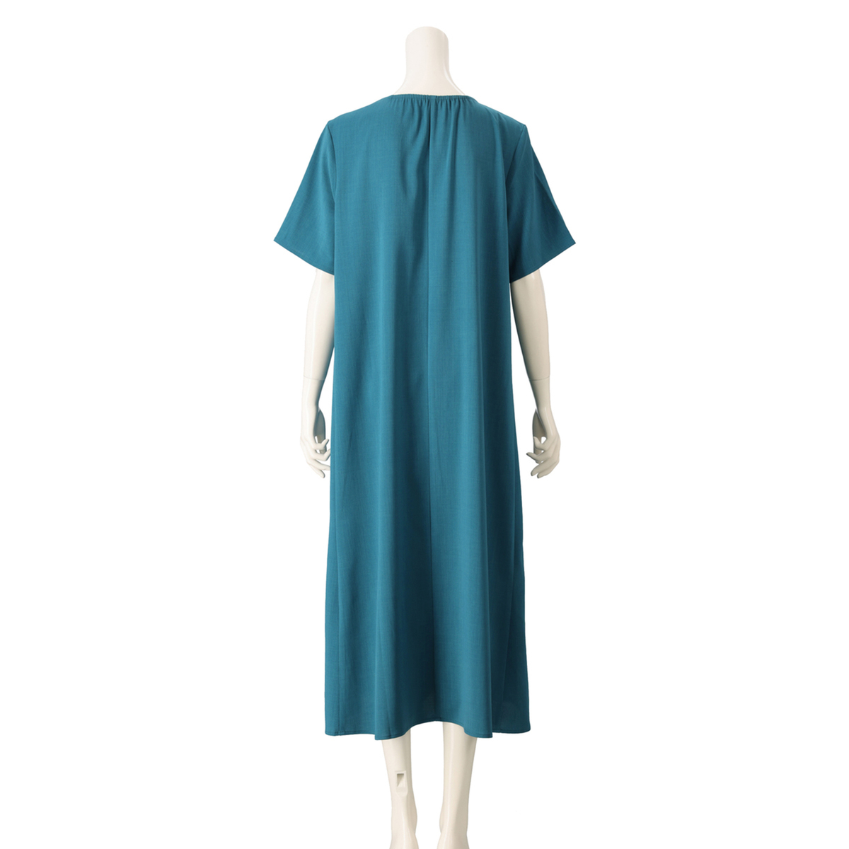 暑い季節にも心地よく着られる、さらりとしたストレッチ性もあるワンピースです。後ろ衿のギャザーゴム仕様で、頭からすぽっと被って着られるプルオーバータイプ。気になる二の腕をさりげなくカバーし、ふんわり広がるテントラインが軽やかな印象を与えます