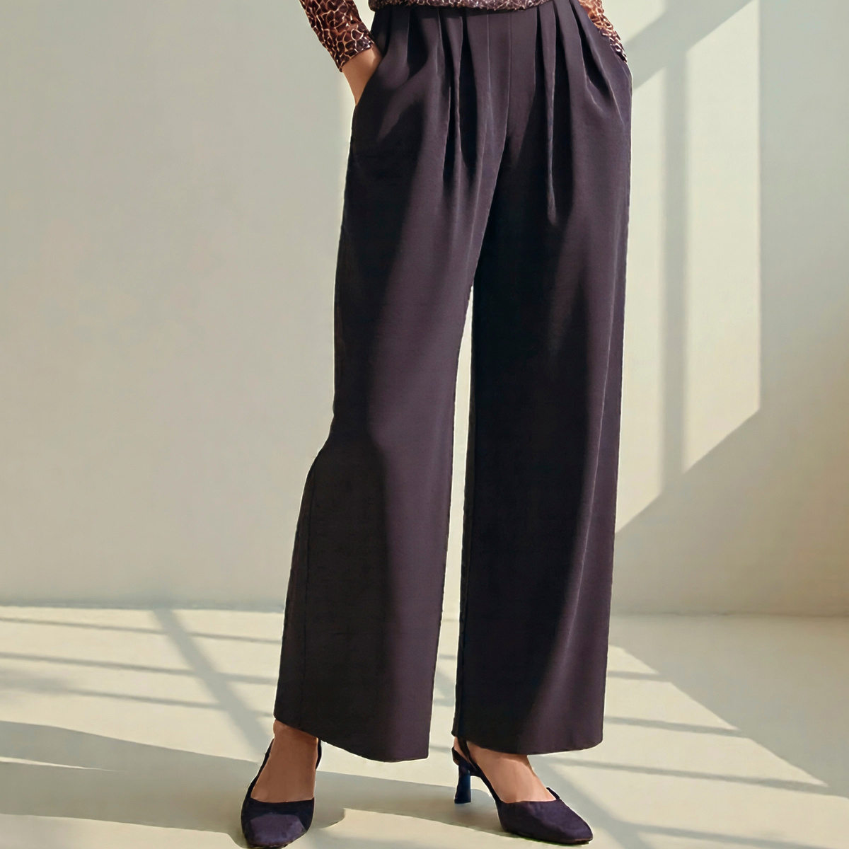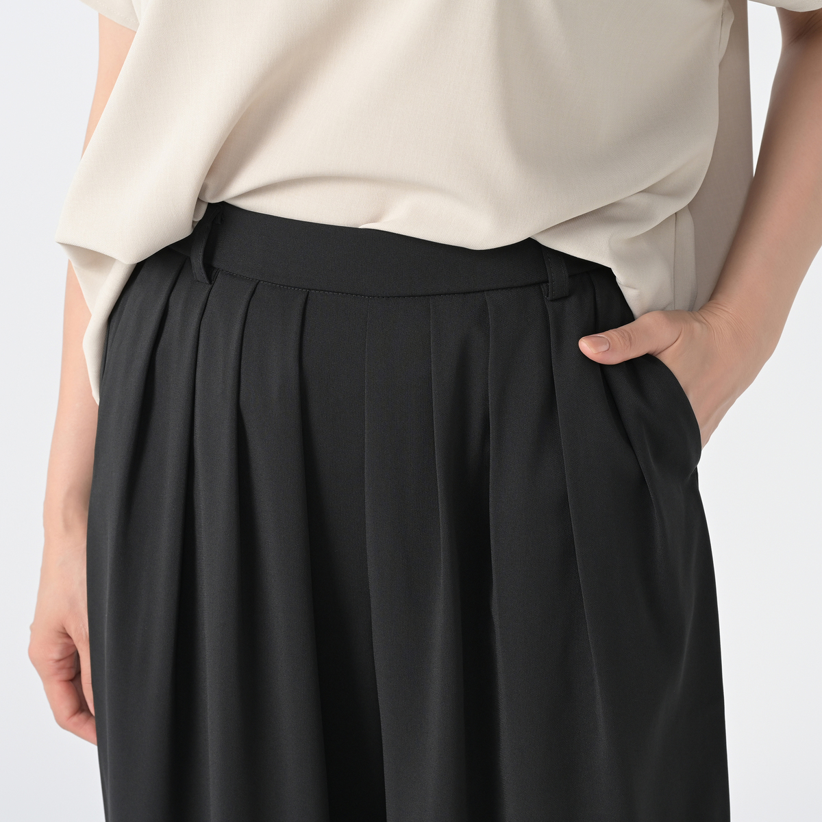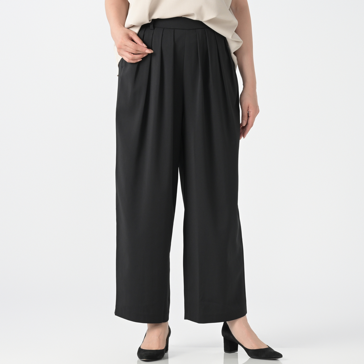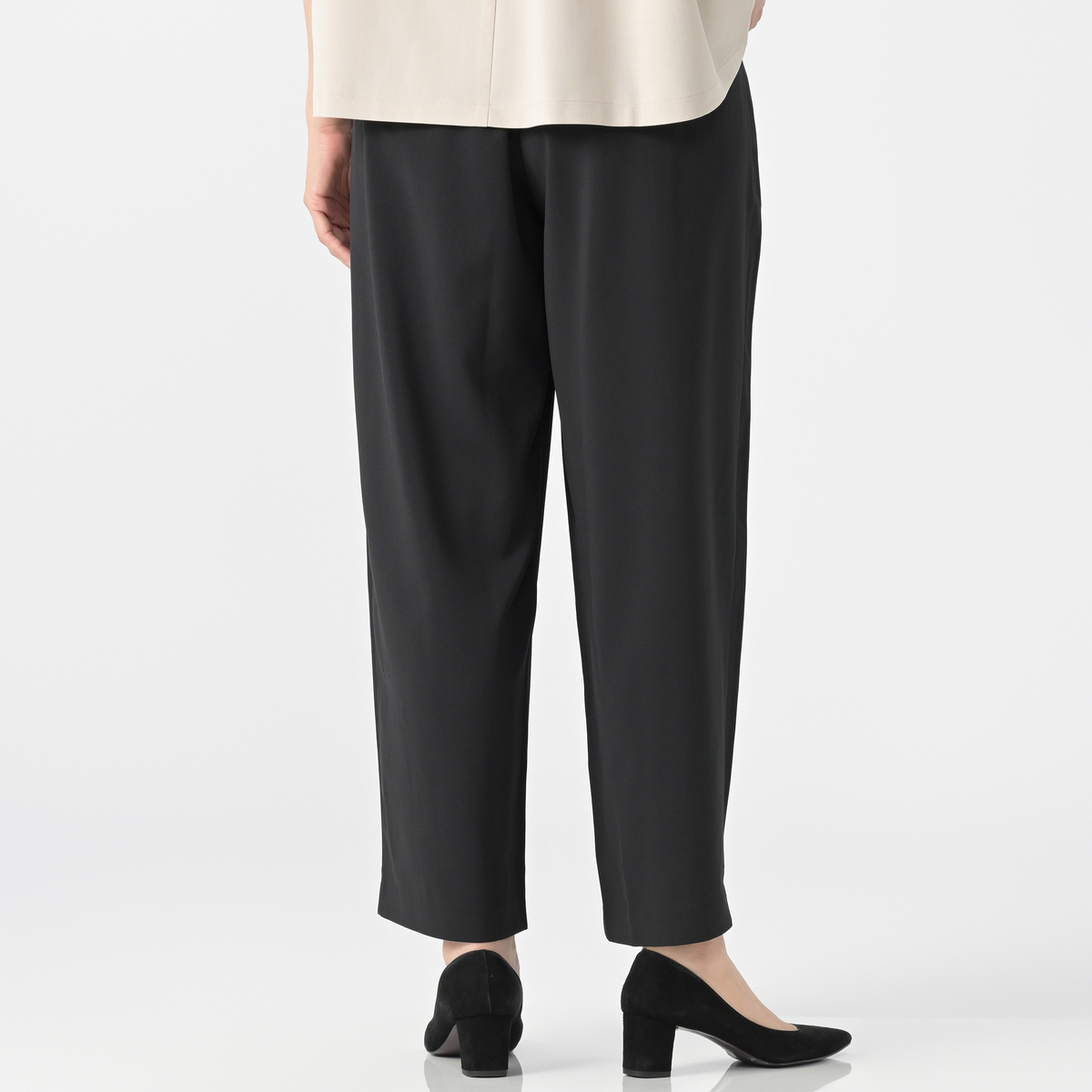 さらりとした肌触りのストレッチ素材を使い、暑い季節も快適な穿き心地のパンツです。フロントには内側向きの4本タックを入れ、お腹まわりをきれいにカバー。後ろはゴムギャザーのプルオン仕様で、丸みのあるシルエットが体を包み込みつつ、トレンド感を演出します