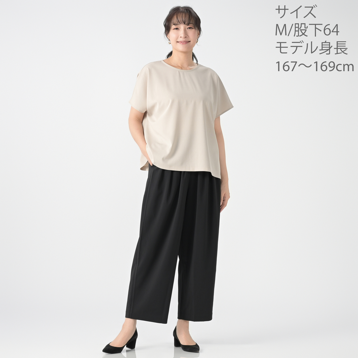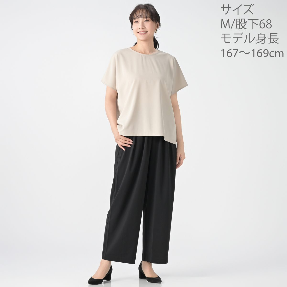 155cm・55kg、普段のL・丈は160cm向けでジャスト。とにかくウェストゴムがしっかりしすぎ。反面生地は薄くて心もとない。暑いとのレビューがありますが、超暑がりの私には残暑より真夏向きの印象。カーヴィデザインは良かったのに、タックの数が多いせいか、相当なダボつき感あり。ウェストゴムは1サイズ大きく+それ以外は1サイズ小さいと自分にはハマる模様。モカの色がとても良かったのに返品です。