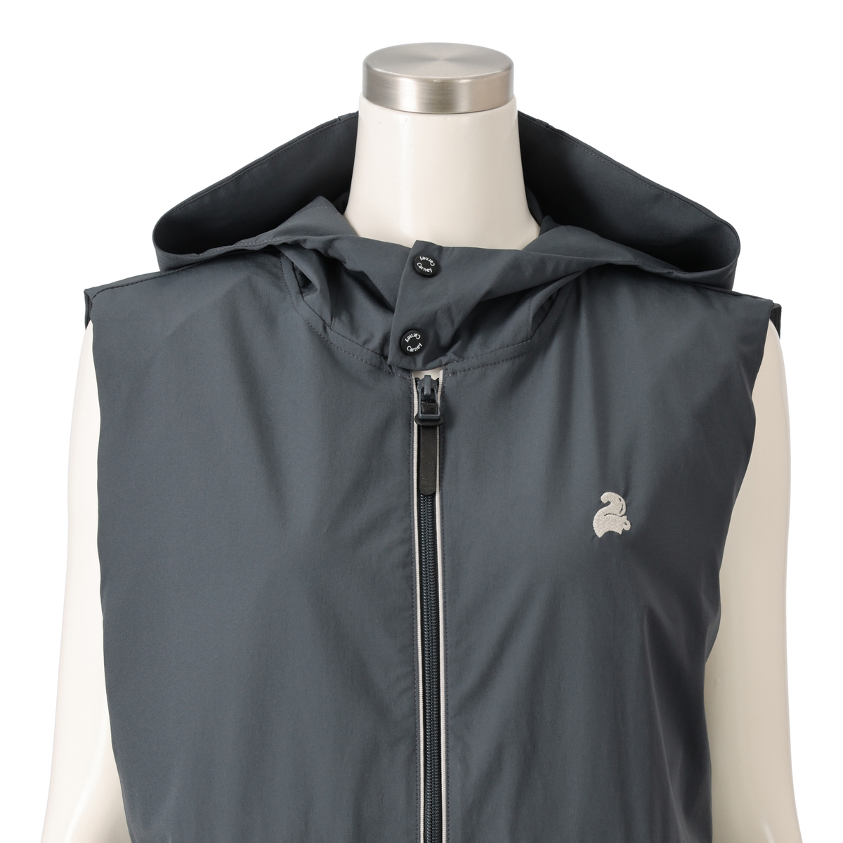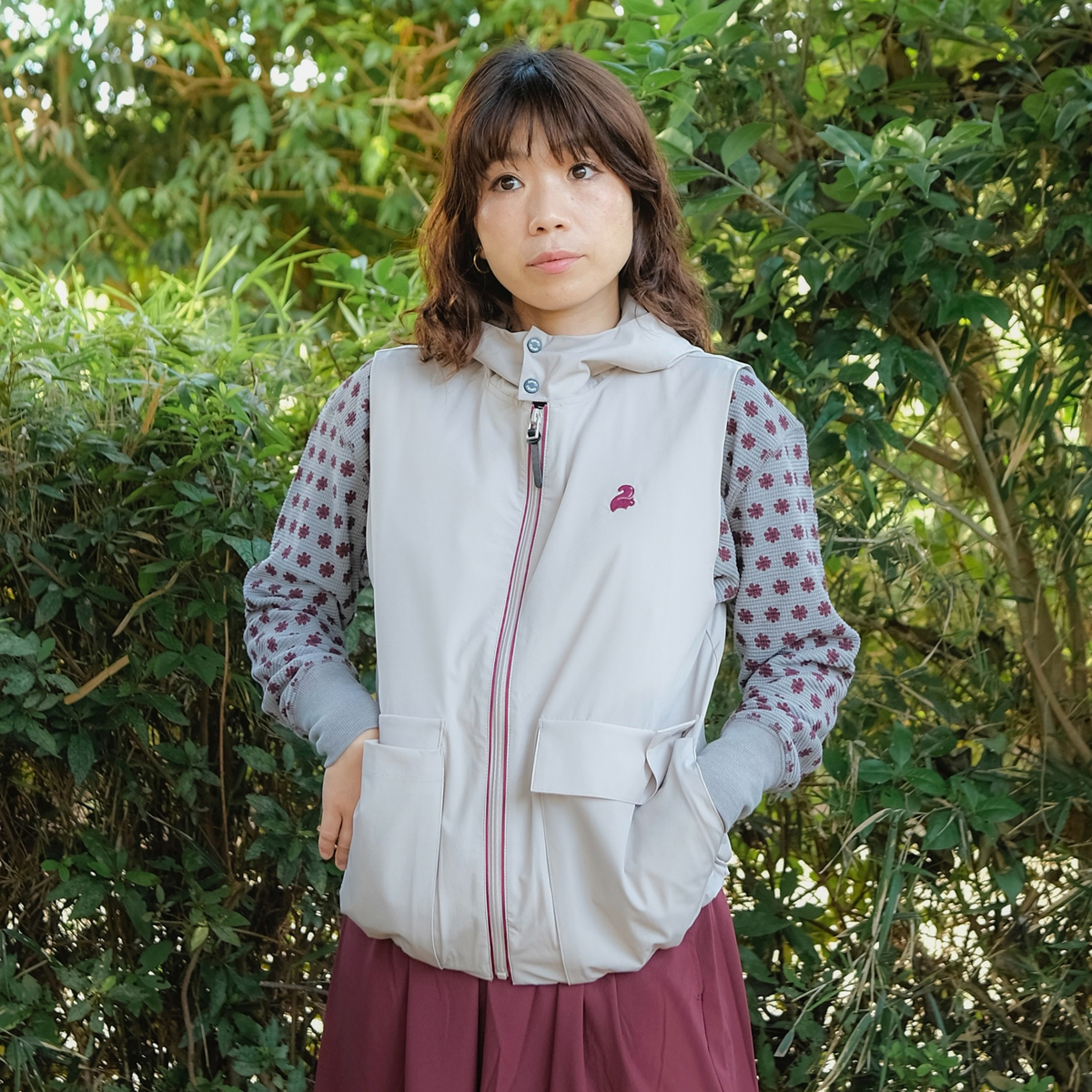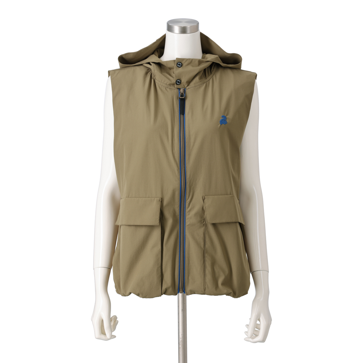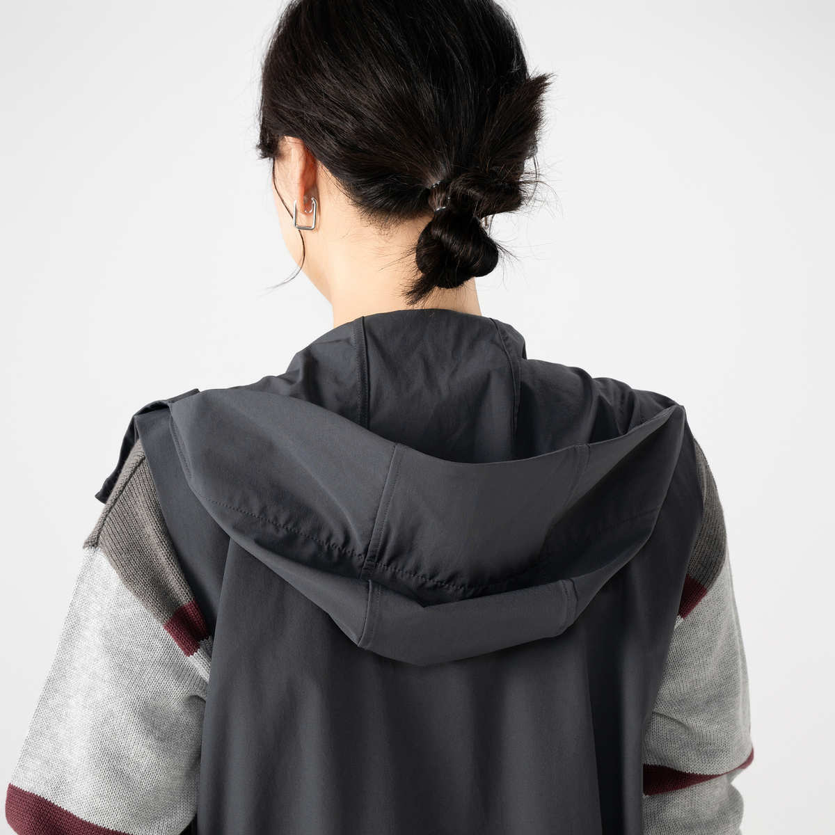 ベストのように羽織れるマウンテンパーカー。長い残暑の季節に合わせて、敢えて袖を無くしたスリーブレスのデザイン。幅広のひさしを付けたフードや、腰には上からも脇からも物を入れることができるポケットを備えています